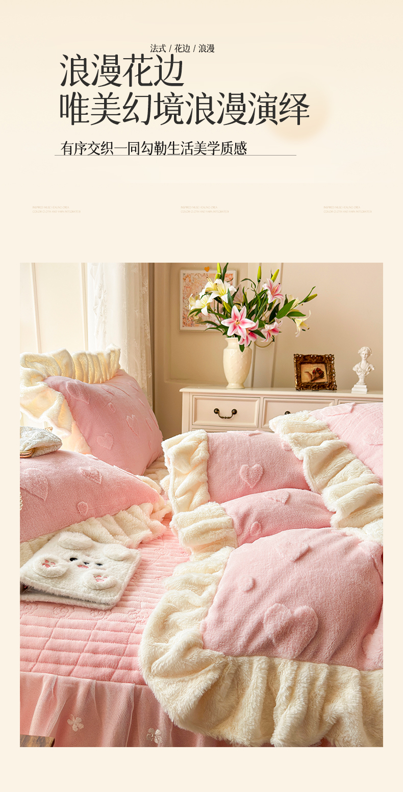 (总)宜凡家纺 2025新款兔绒提花牛奶绒夹棉床裙四件套,爱心 少女粉,爱心 粉紫,爱心 驼色,蝶舞 大红,蝶舞 米色,蝶舞 浅紫,蝶舞 玉色,简爱 苍青,简爱 豆沙紫,简爱 玉色,樱桃 苍青,樱桃 豆沙紫,樱桃 奶油白