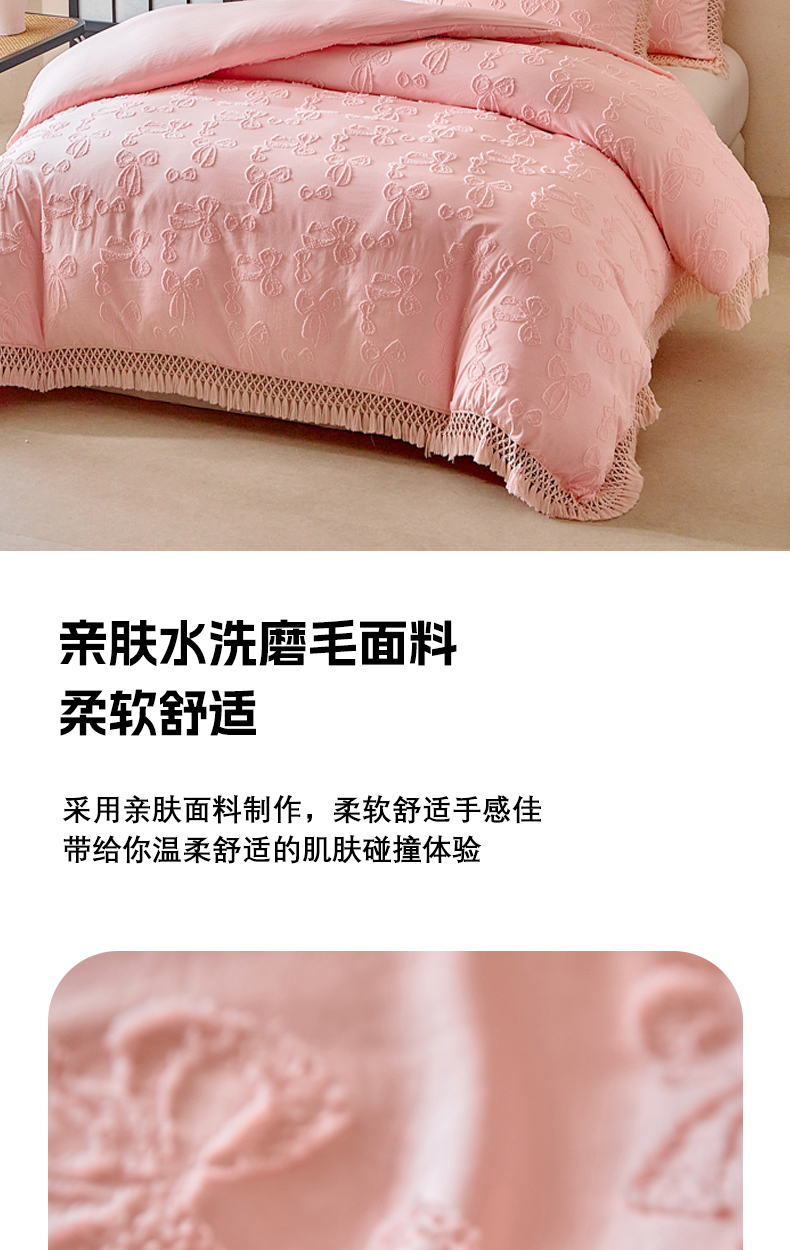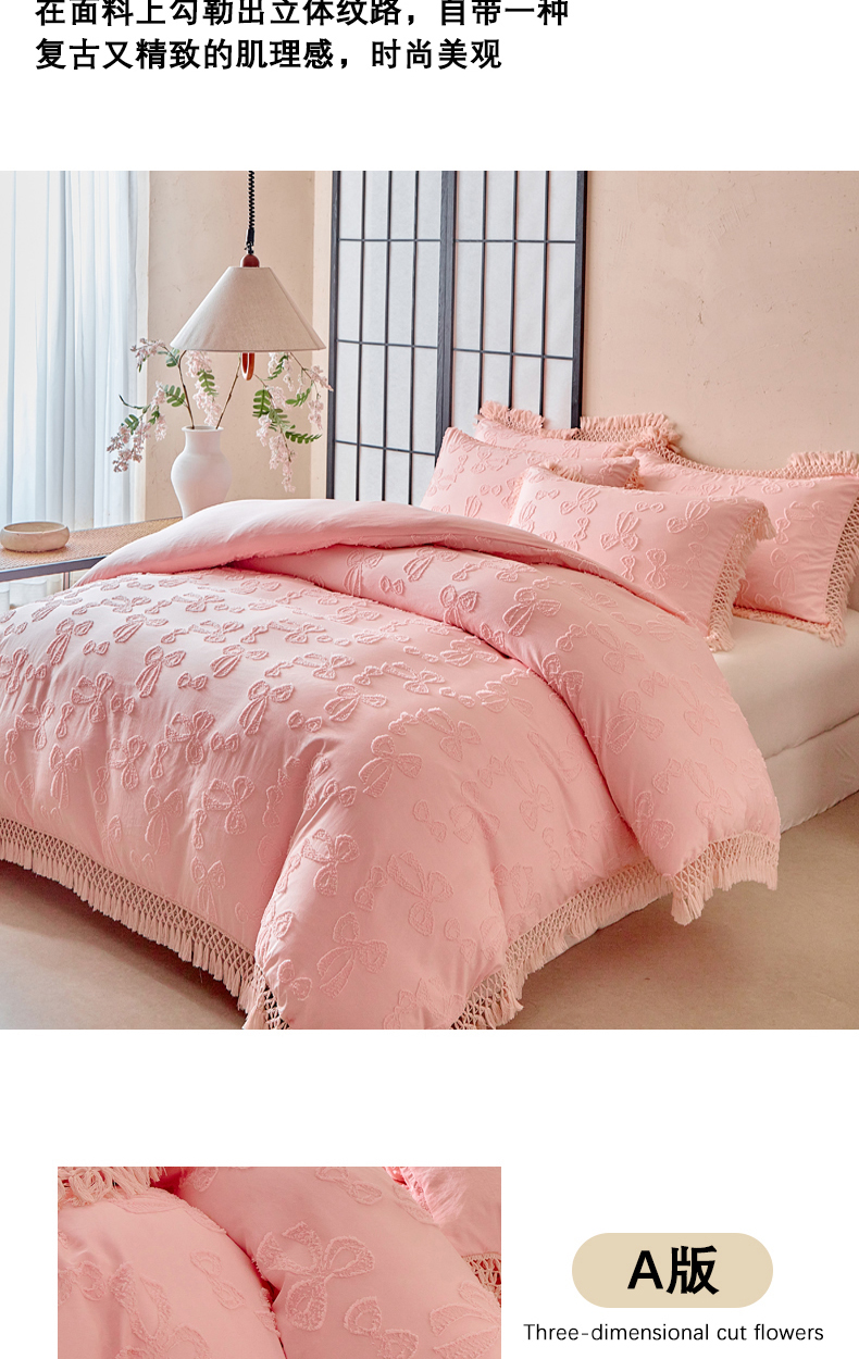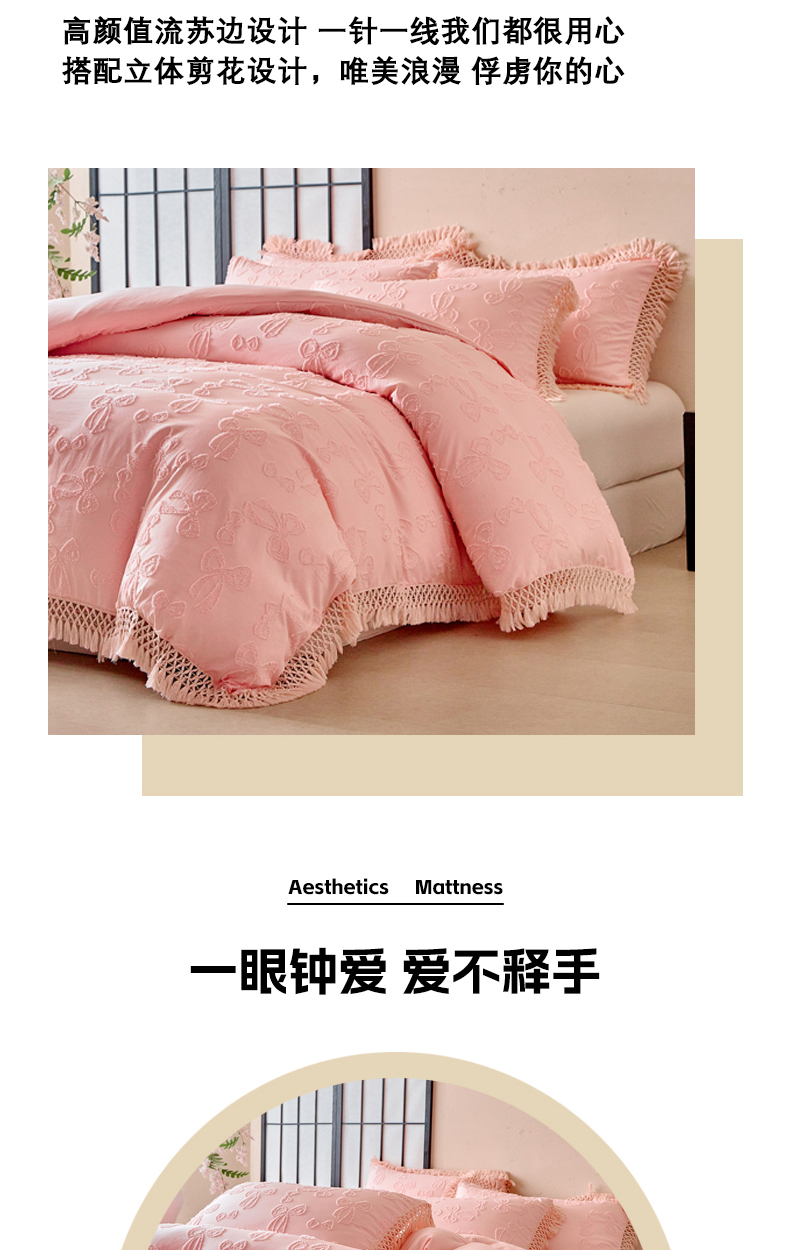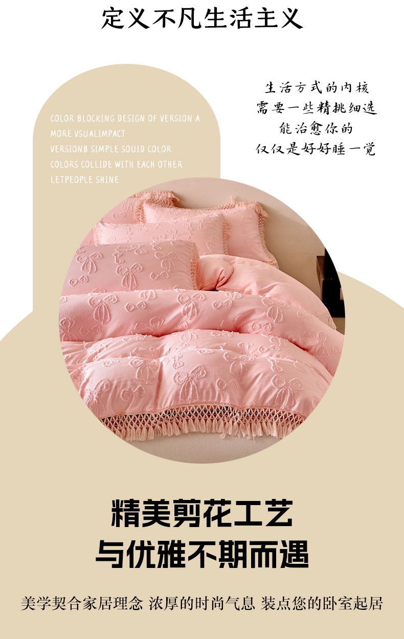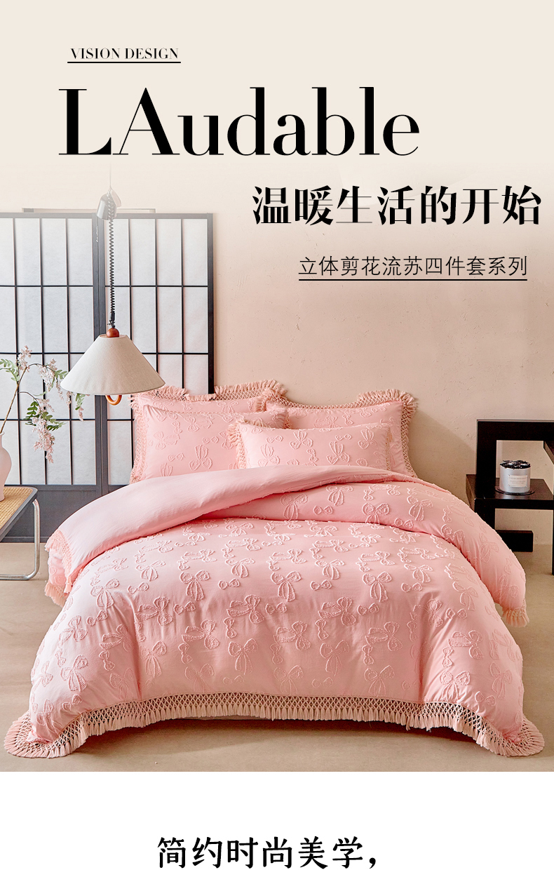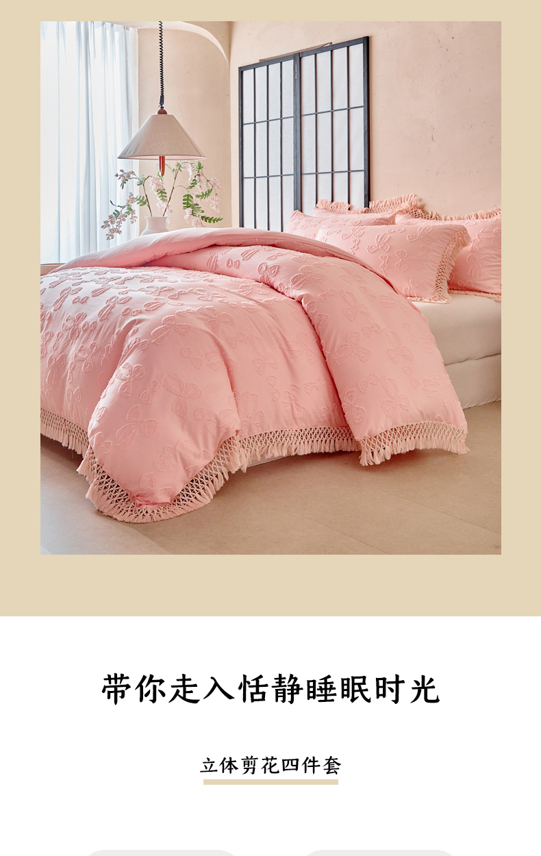 当前位置: 91家纺网 > 商品网购 > 床品套件 > 四件套 > 其它四件套 > 缘生活 2025新款立体剪花流苏四件套 四季通用-新增花型 剪花蝴蝶结 流苏+粉色