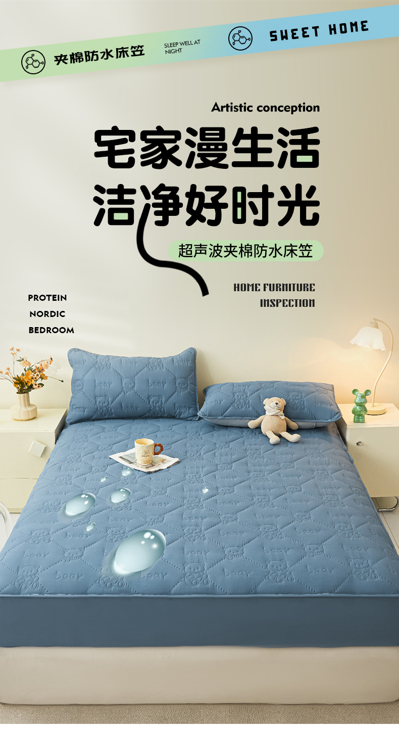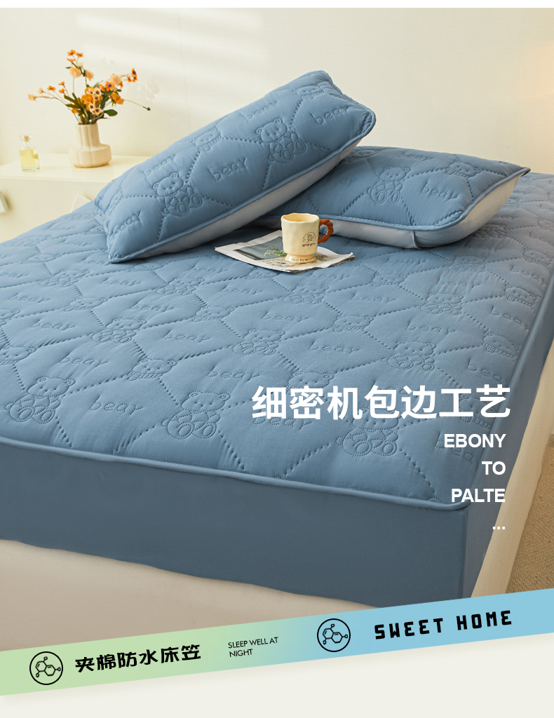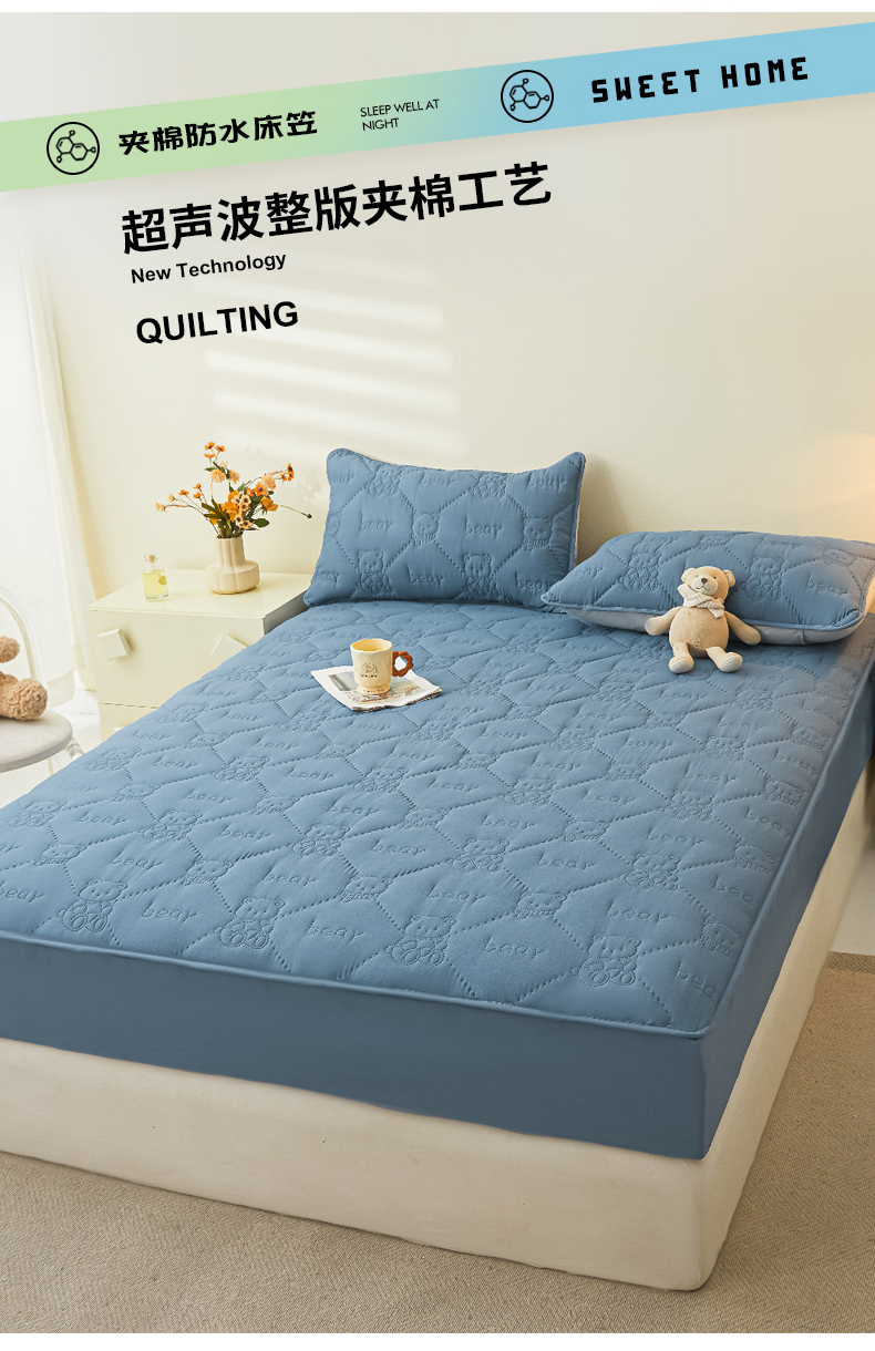 • 91家纺网 家纺一手货源 找家纺 LIFE.丽芙 2025新款磨毛单件超声波小熊夹棉防水床笠三件套 小熊防水夹棉床笠-宾利蓝