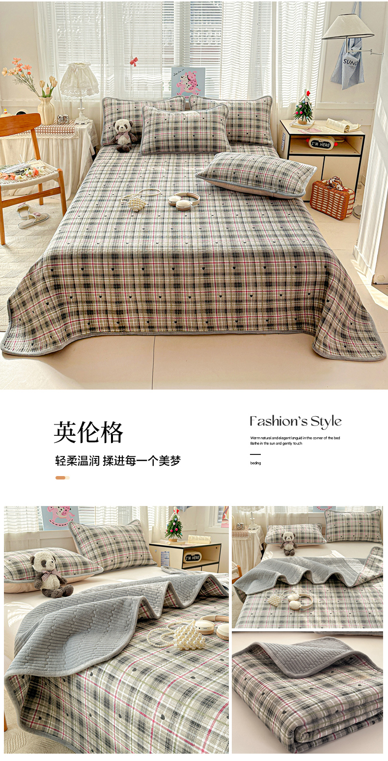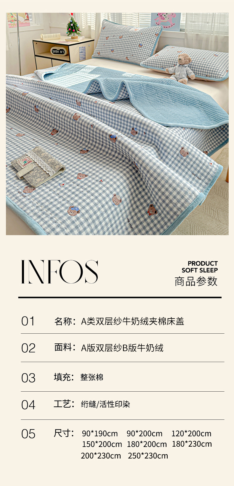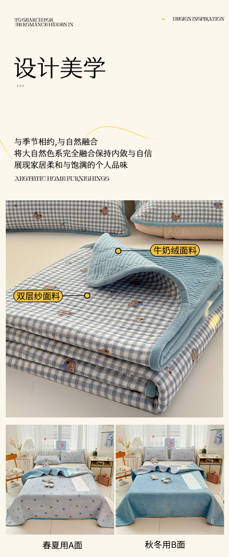 • 91家纺网 家纺一手货源 找家纺 恒尚居 2026新款A双层纱B牛奶绒床盖双面两用夹棉床单学生床垫床褥子系列二 格子小熊【A双层纱-B牛奶绒】