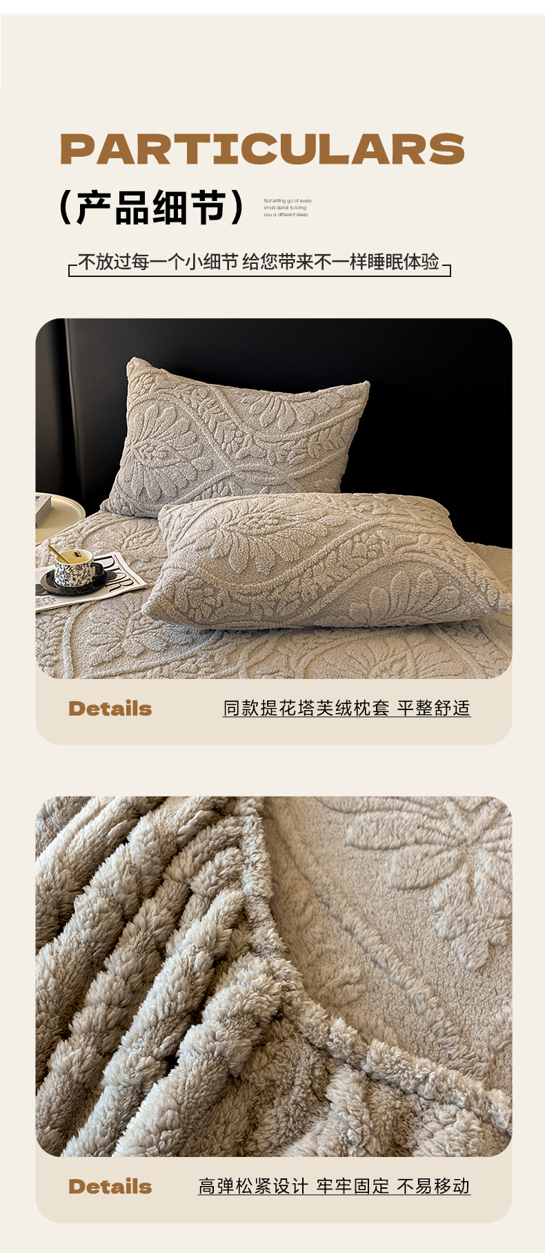 • 91家纺网 家纺一手货源 找家纺 (总)莱家富 2026新款塔芙绒舒棉绒雕花绒单床笠 床笠单件-花朵系列(可提供压缩),组合图仅供展示不可下单,花朵-粉玉,花朵-湖蓝,花朵-米驼,花朵-奶白,花朵-桑绿,花朵-雾灰