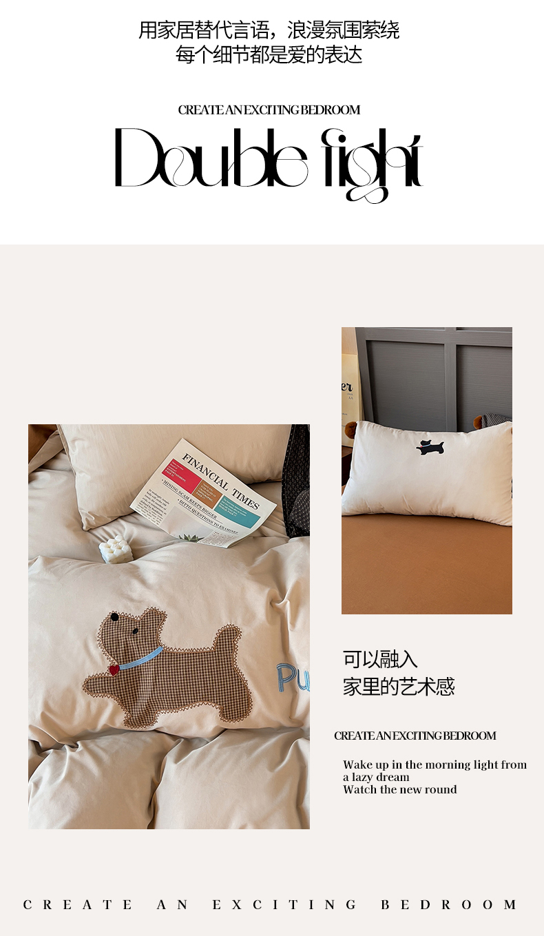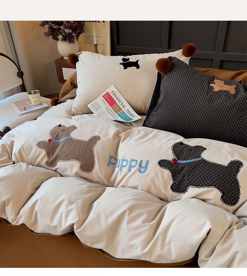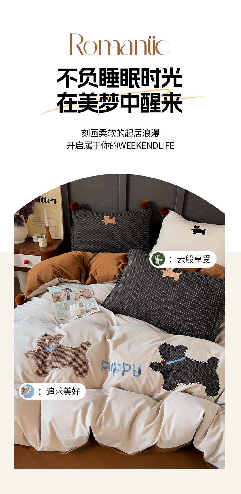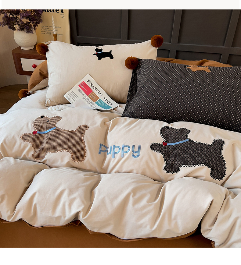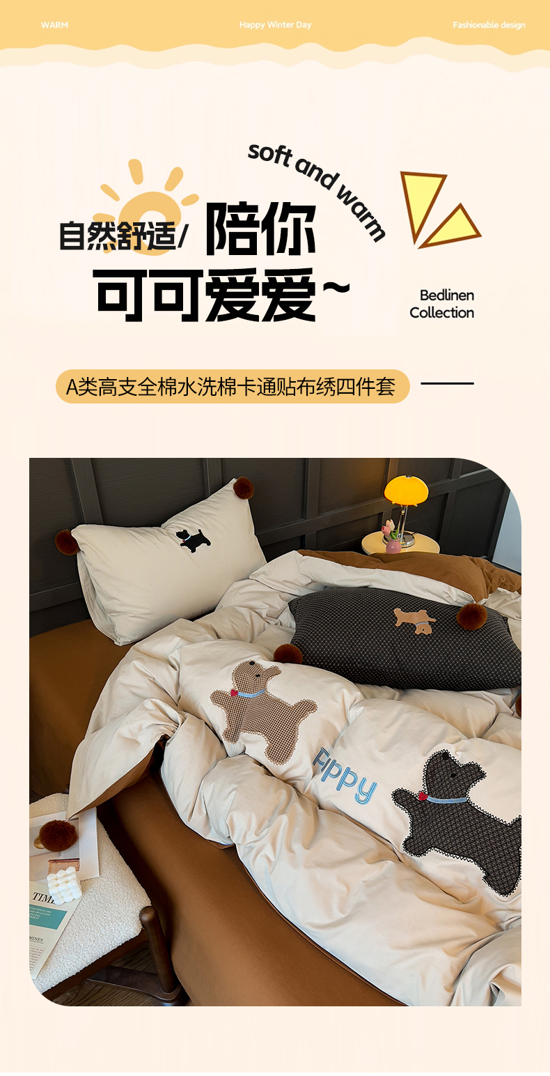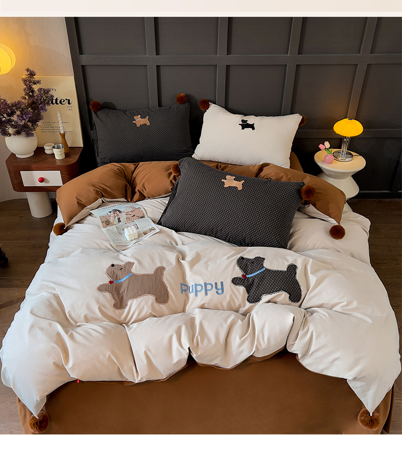 商品名称:炫拼家纺 2026新款卡通毛巾绣A类全棉40支水洗棉贴布绣平绣纯棉四件套-毛球系列 毛球-旺旺狗