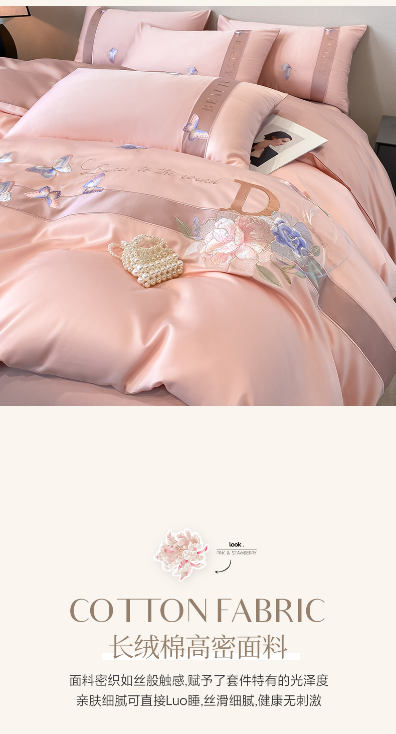 欣宜家纺 2025年新款全棉长绒棉绣花四件套刺绣轻奢床上用品-送高档礼盒 蝶恋-轻奢粉