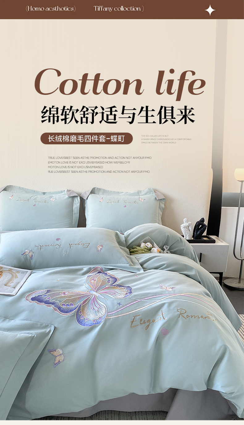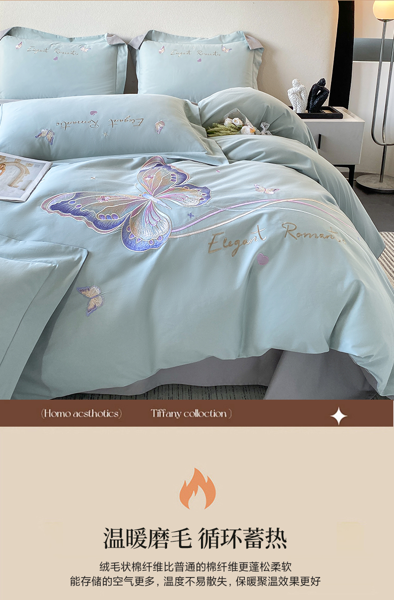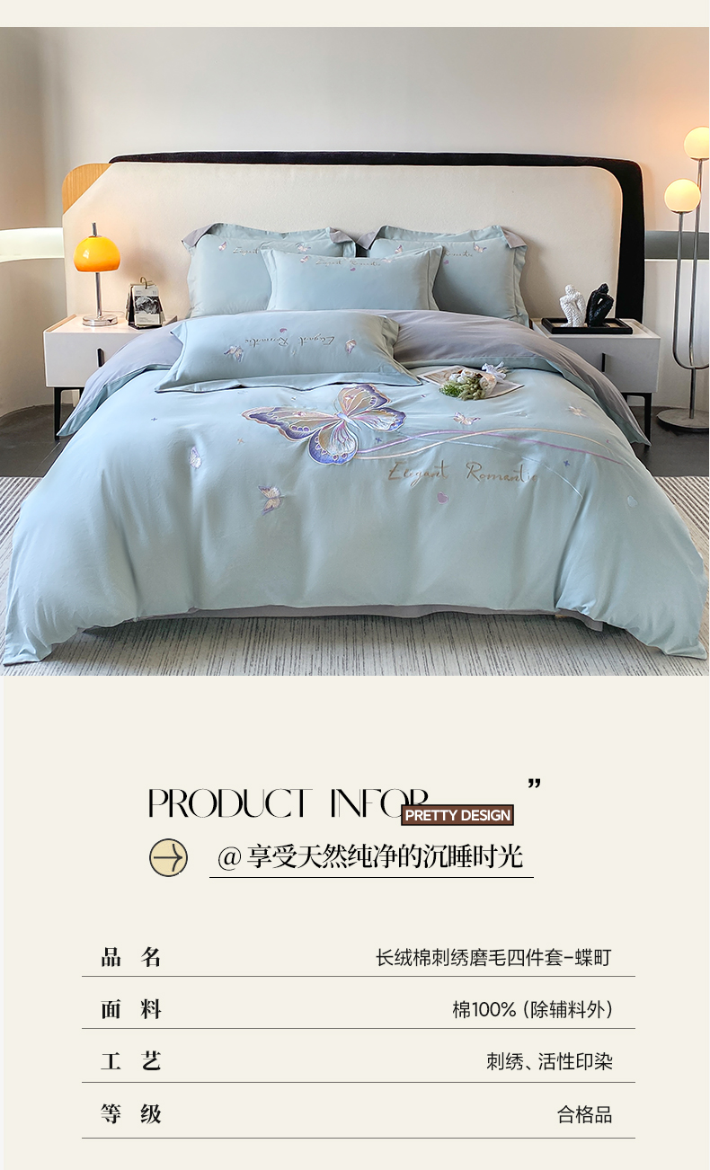 商品名称:欣宜家纺 2025新款秋冬纯棉全棉长绒棉磨毛刺绣床上四件套高端礼盒-蝶町系列(含买家秀) 蝶町-飘蓝
