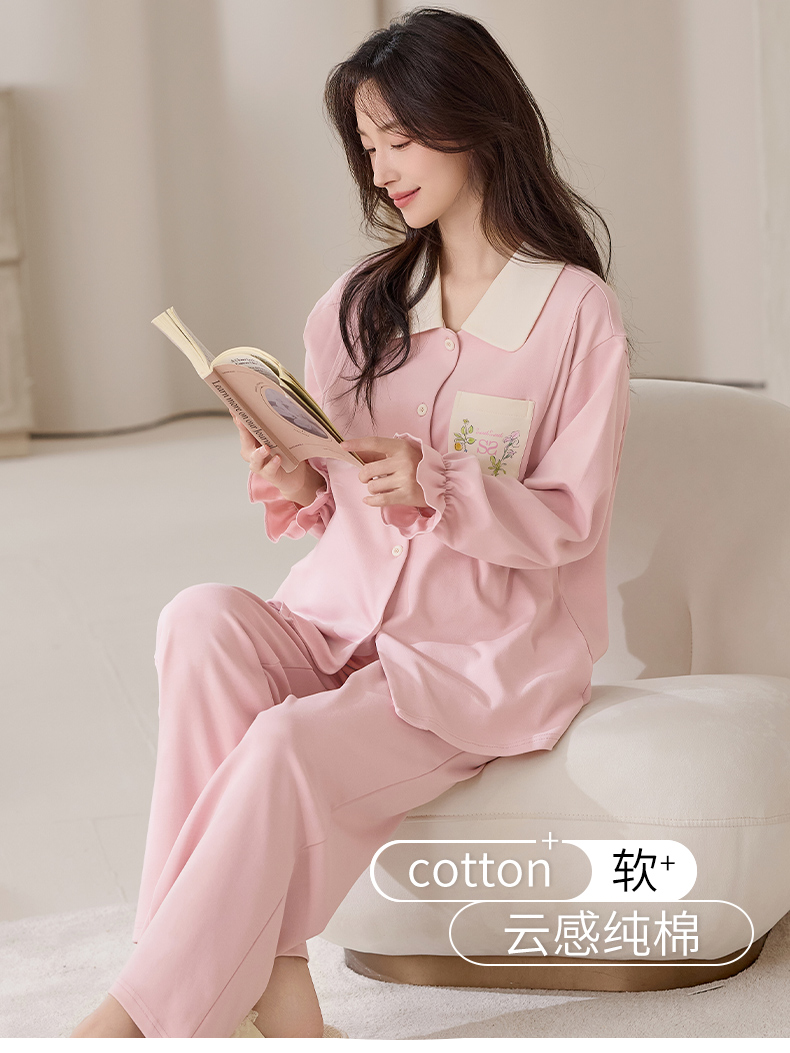 洛兰沙家居馆 2026春秋季新款小清新针织全棉纯棉100%翻领开衫双长孕妇月子服睡衣女 翻领套装5