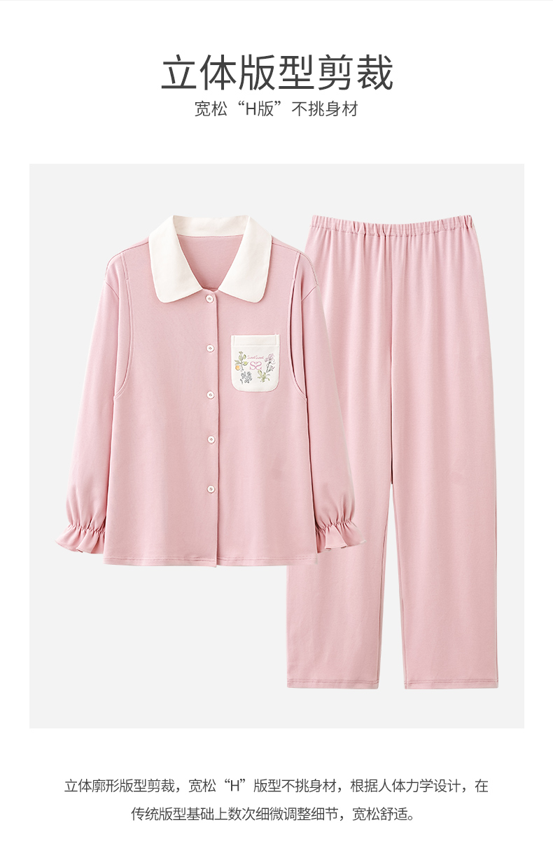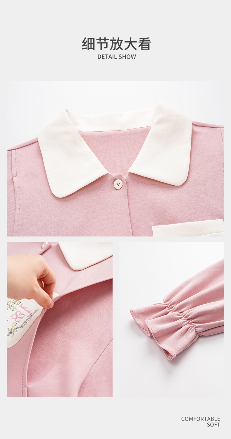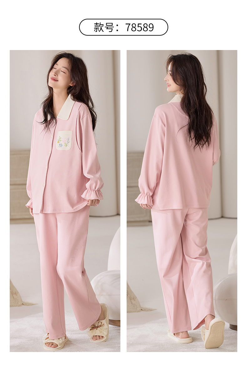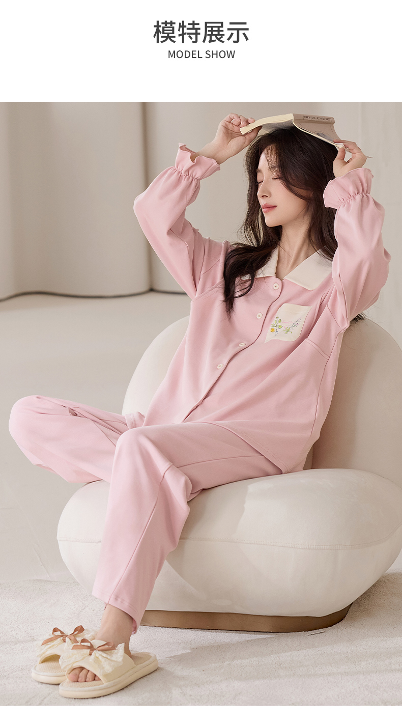 商品名称:洛兰沙家居馆 2026春秋季新款小清新针织全棉纯棉100%翻领开衫双长孕妇月子服睡衣女 翻领套装5