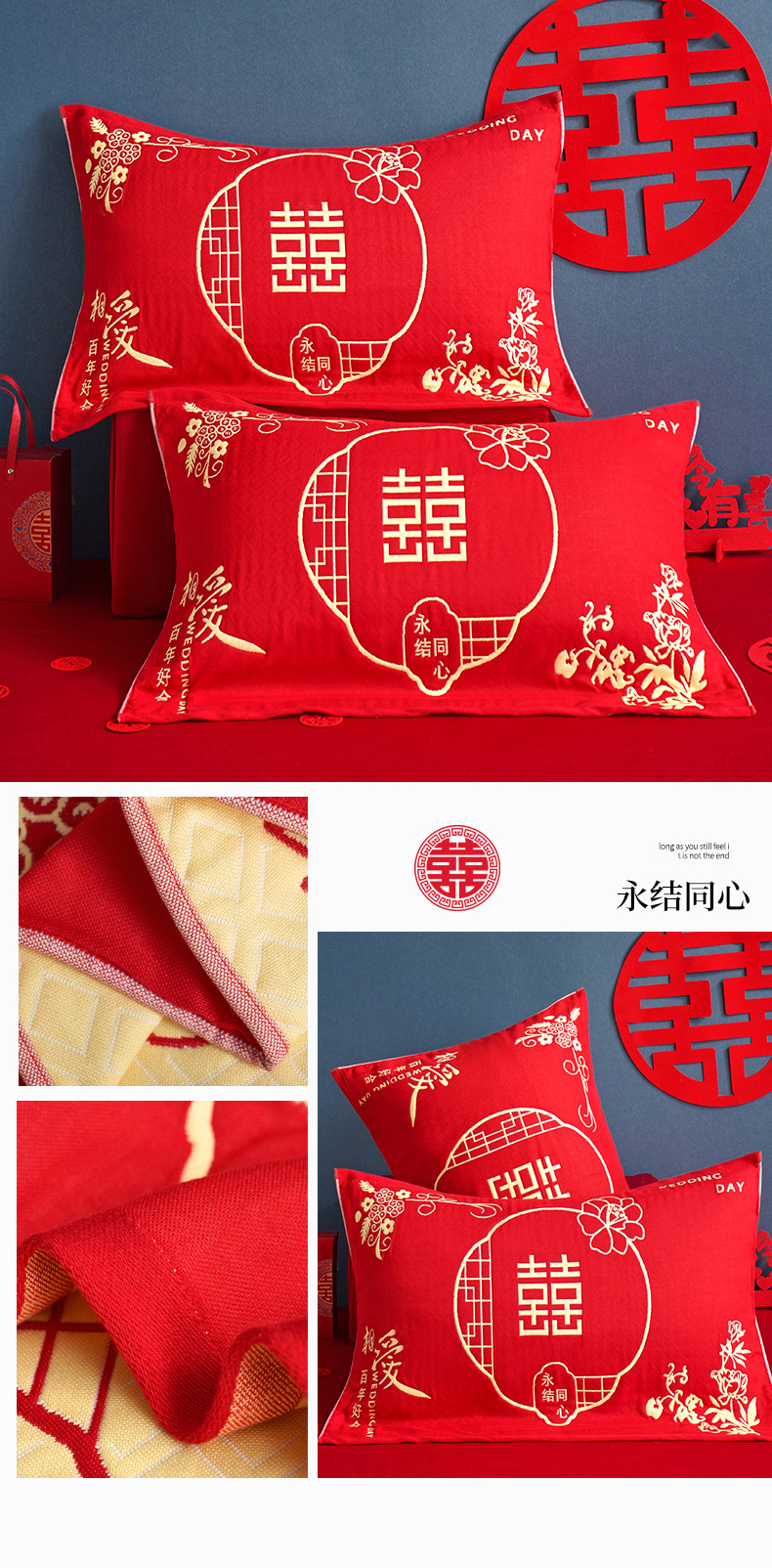 商品名称:朴尔家纺-毛巾被 2026新款全棉40股结婚大红多层纱布透气情侣婚庆枕巾 喜笑颜开