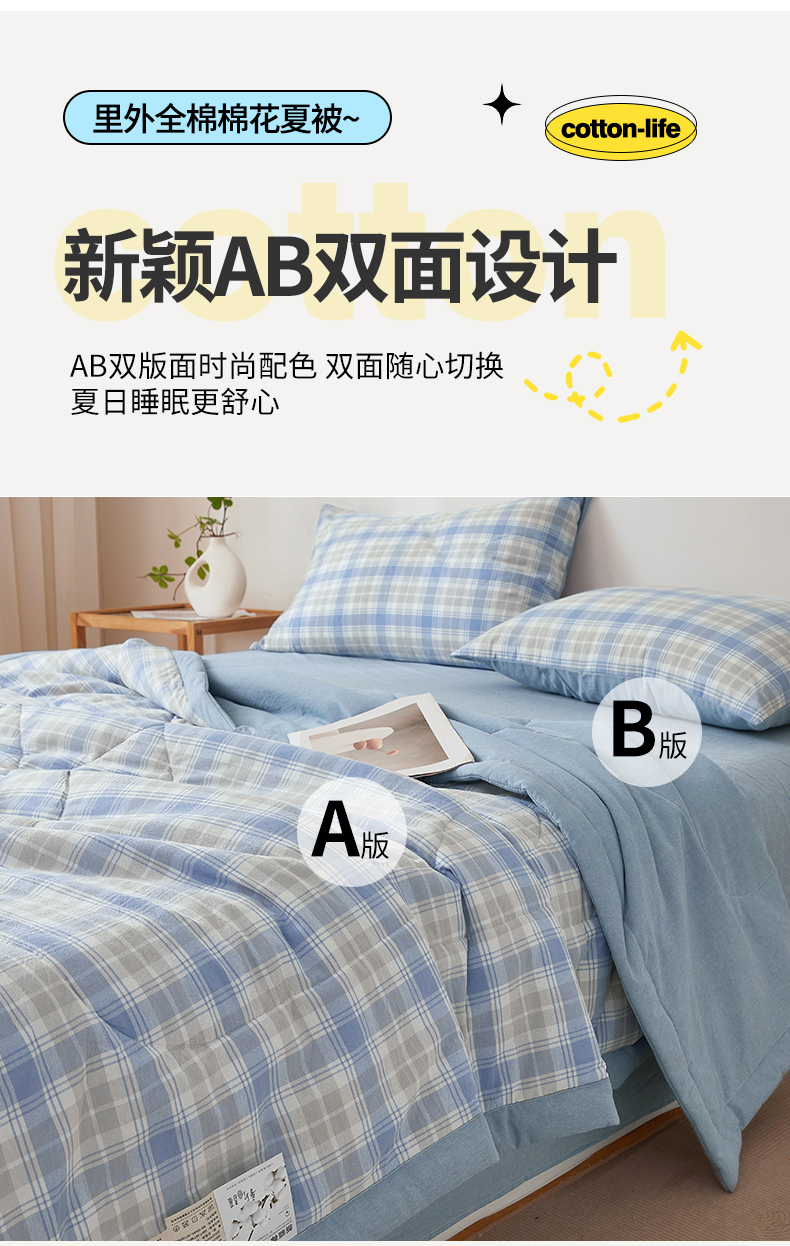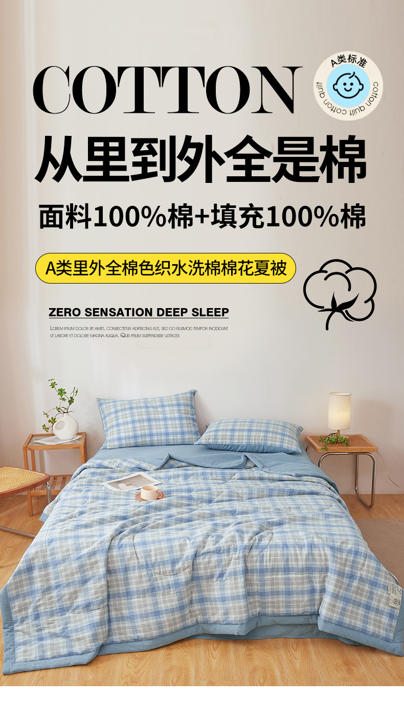 被子 > 夏被 > 2026新款A类里外全棉夏凉被100%新疆棉纯棉全棉填充无印格子款空调被全棉夏被 里外全棉-韵蓝格
