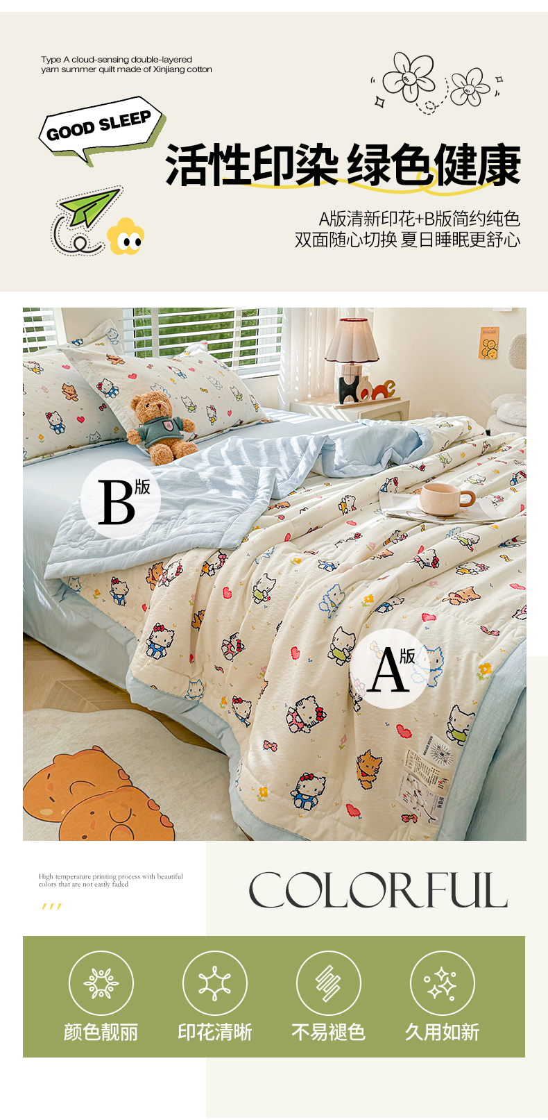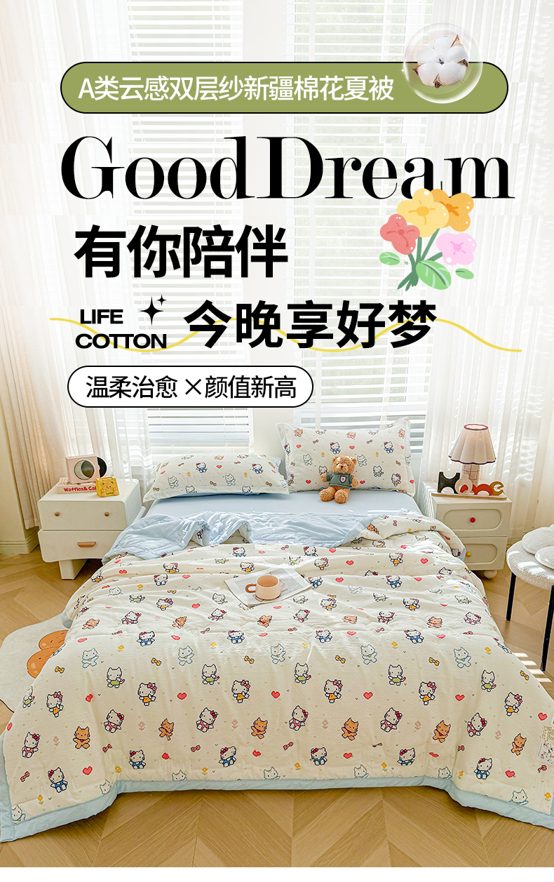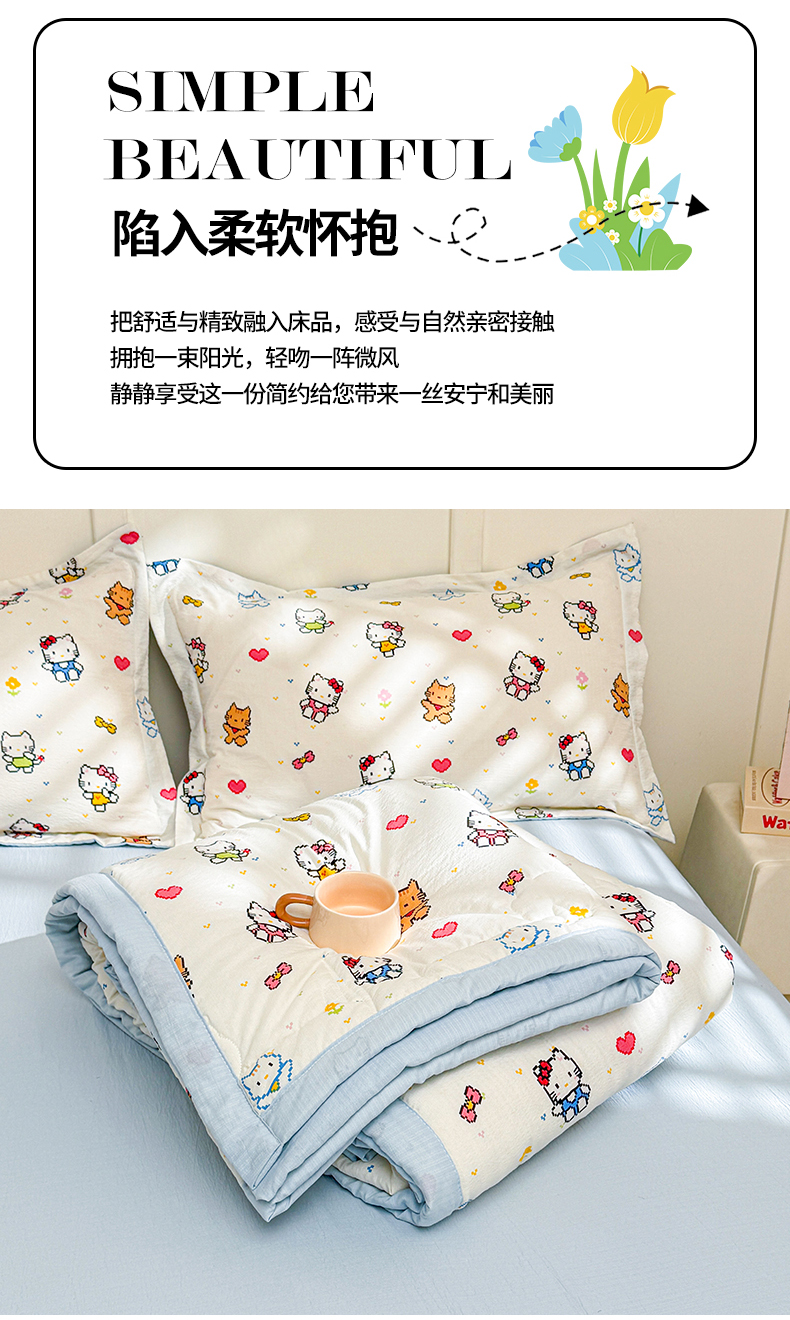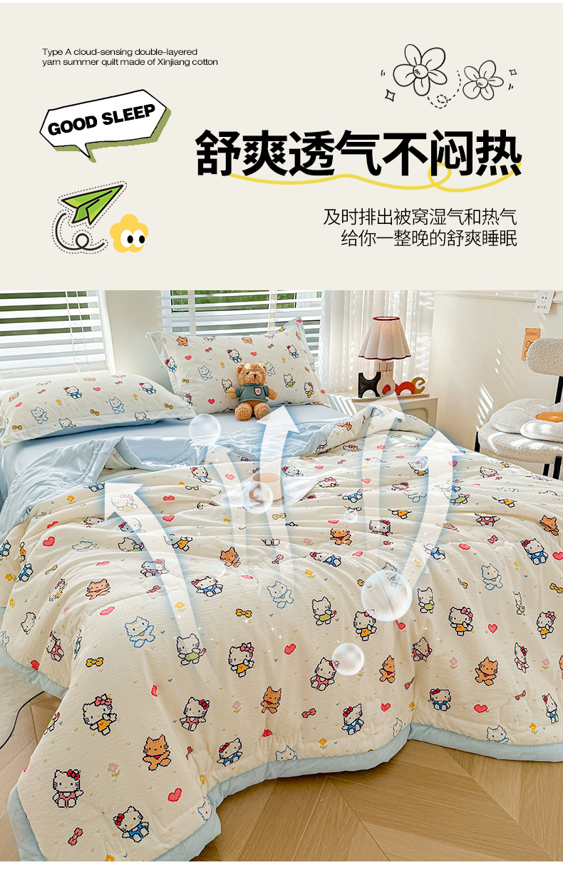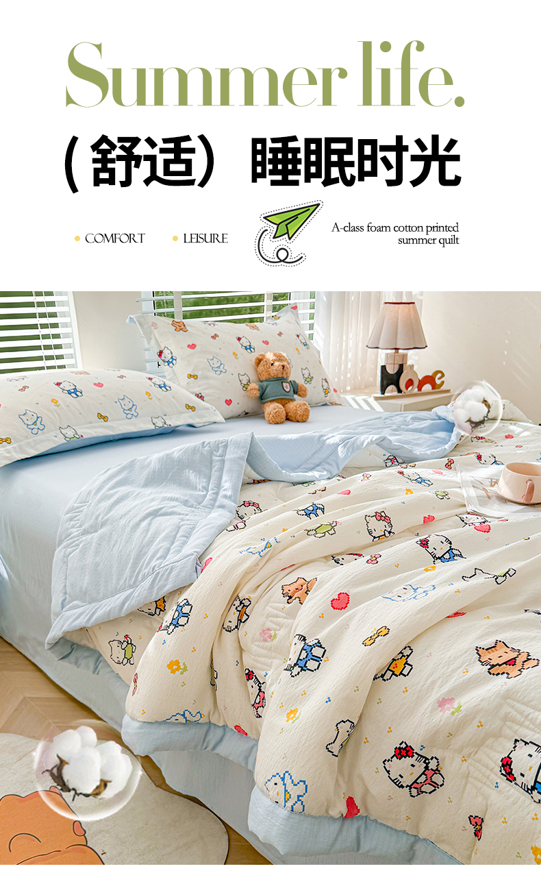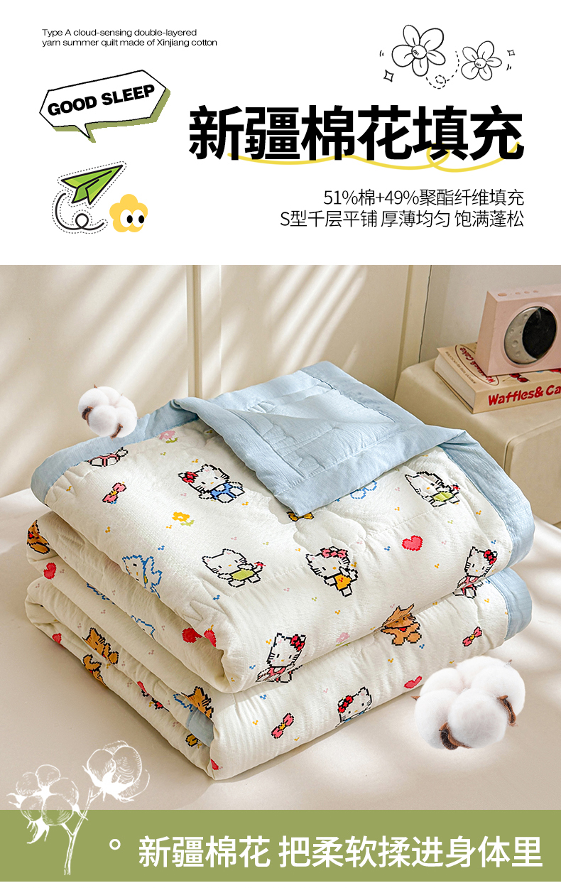 商品名称:2026新款A类新疆棉花夏凉被加宽包边水洗棉卡通印花吸湿透气棉花夏被空调被 云感晶咪