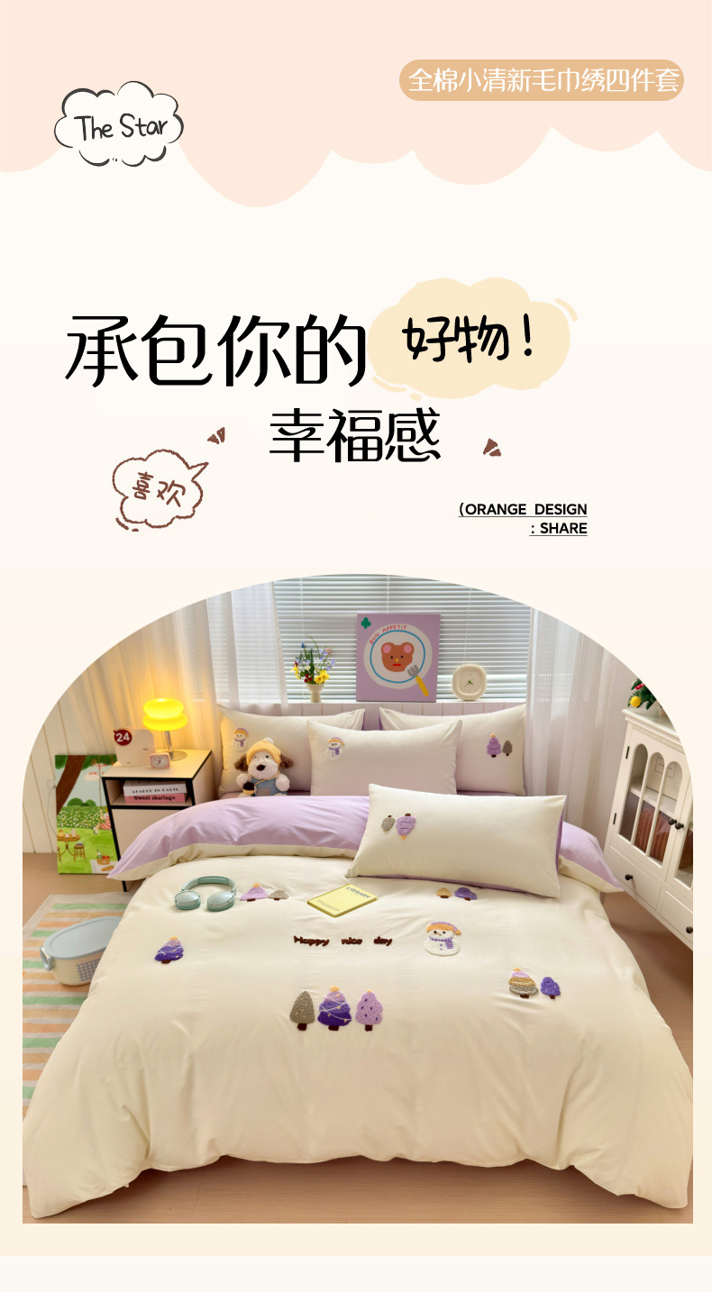 (总)如意朵 2026新款13372全棉毛巾绣小清新四件套(专版花型),彩色星星,躲猫猫,狗狗家族,猫咪家族,美好时光,萌宠乐园,小伙伴,一起嗨,柿柿如意,小企鹅,企鹅抱抱,小甜品,小红猫,魔法师