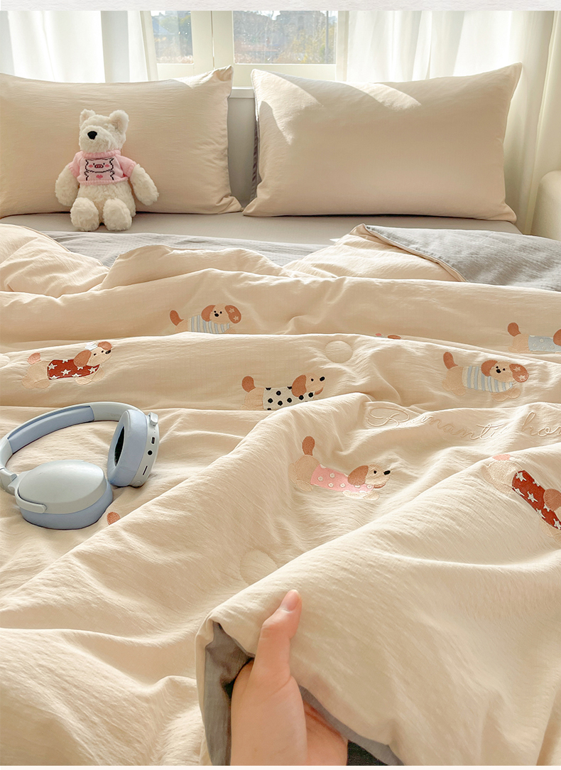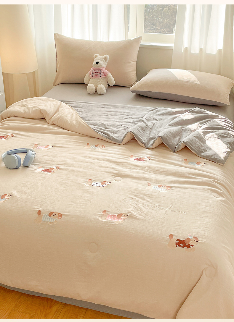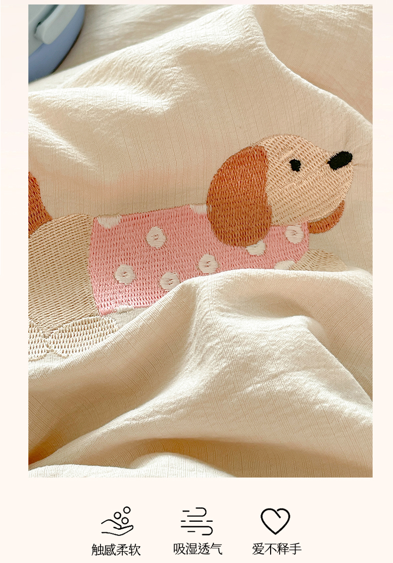 盛秋家纺 2026新款皱皱纱散点绣夏被-妮可 腊肠狗梧桐杏