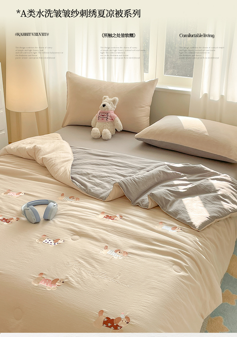 • 91家纺网 家纺一手货源 找家纺 盛秋家纺 2026新款皱皱纱散点绣夏被-妮可 腊肠狗梧桐杏