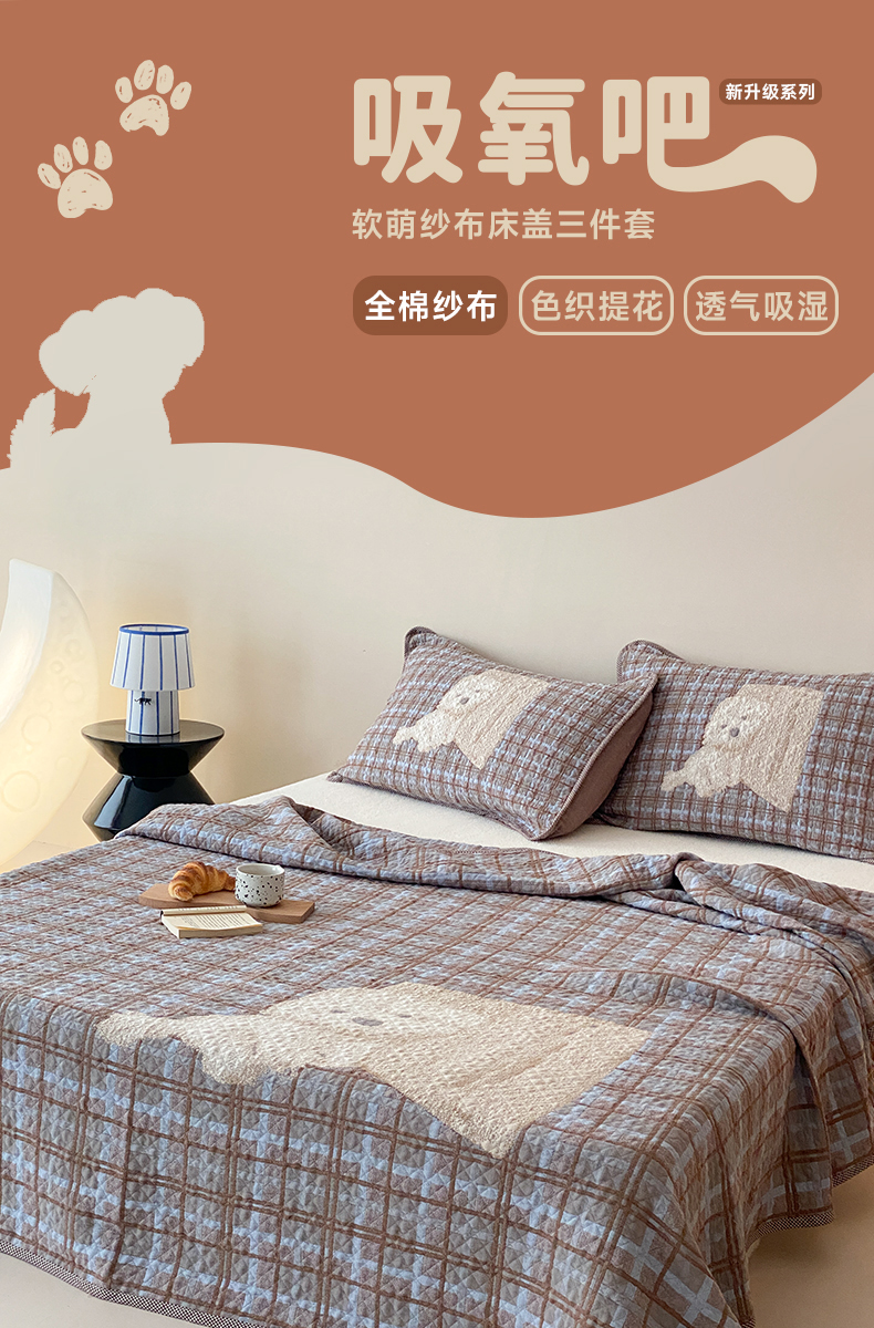 (总)麻依 2026新款软萌纱布床盖三件套系列,斑点小猫,博美,豆豆企鹅,懒床小狗,乐园小象,毛绒小狗,胖胖猫,胖胖企鹅,桃心KT,玩耍小咪,香蕉小猫,杂技萌宠,组合