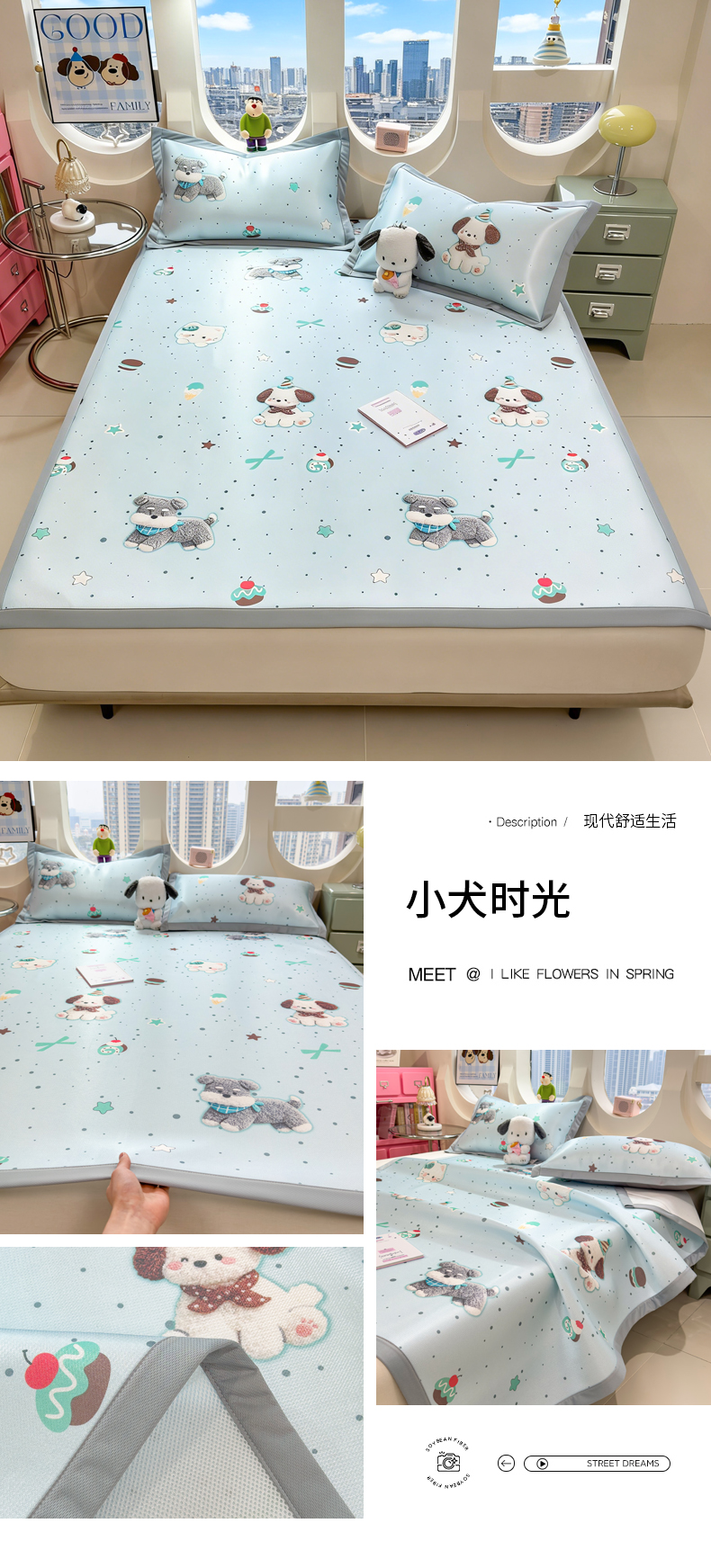 (总)丝羽坊 2026新款高密凉感丝印花乳胶凉席-床笠款,雾蓝花影,萌宠拼格,粉黛萌兔,格纹蝶影,奶白萌犬,浅蓝熊趣,糖果猫咪,彩糖点点,林间私语,薄荷甜心,爱的圈圈,春意盎然,奶绿汪仔,小白兔,小企鹅,小兔派对,星月