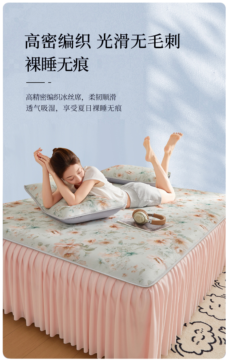 商品名称:优莱床垫 2026新款冰丝复合抗菌凉席床裙款 蓝茵大花凉席平铺款