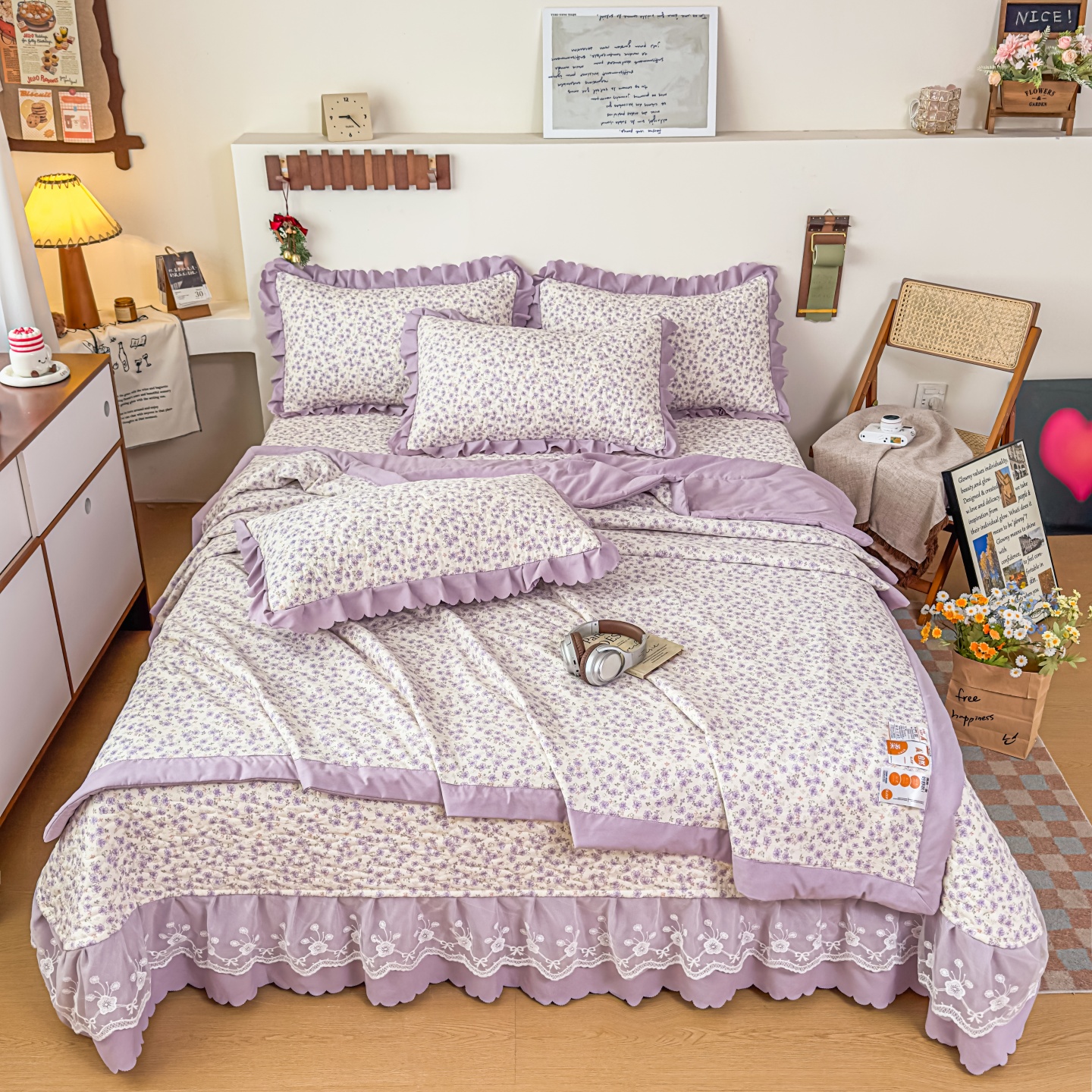 (总)雅眠居 2026直播爆款泡芙棉双层蕾丝花边床盖四件套,红色小马,莫奈花园,甜心-粉,甜心-灰,甜心-蓝,甜心-绿,甜心-紫,薰衣草,织梦时空