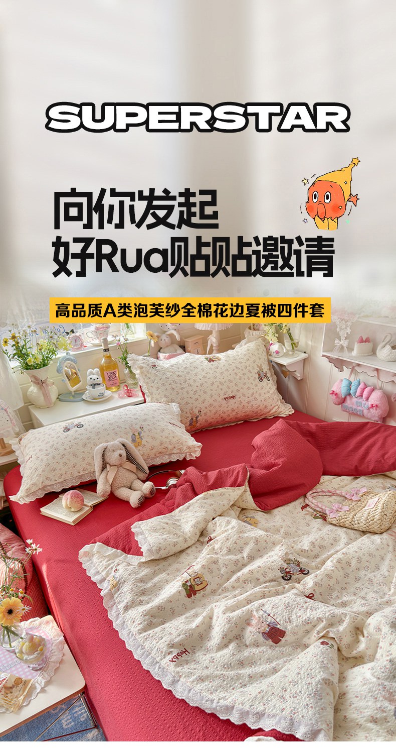 贝扬思家纺 2026新款泡芙纱全棉蕾丝花边夏被-花笺系列(甜系花边撞入梦境,软乎乎的质感,治愈所有疲惫) 花笺-躲雨小兔