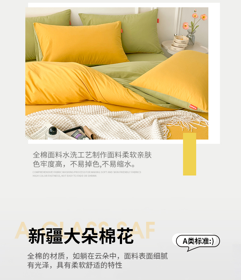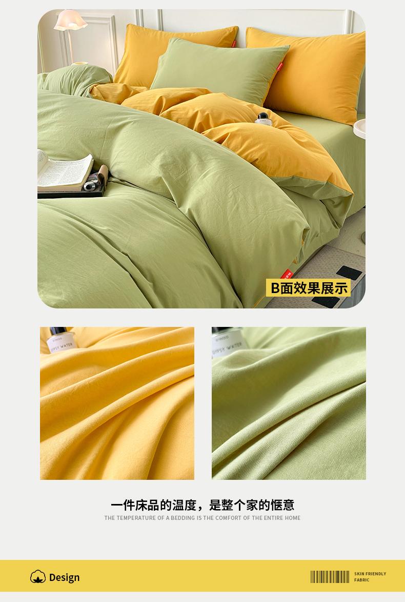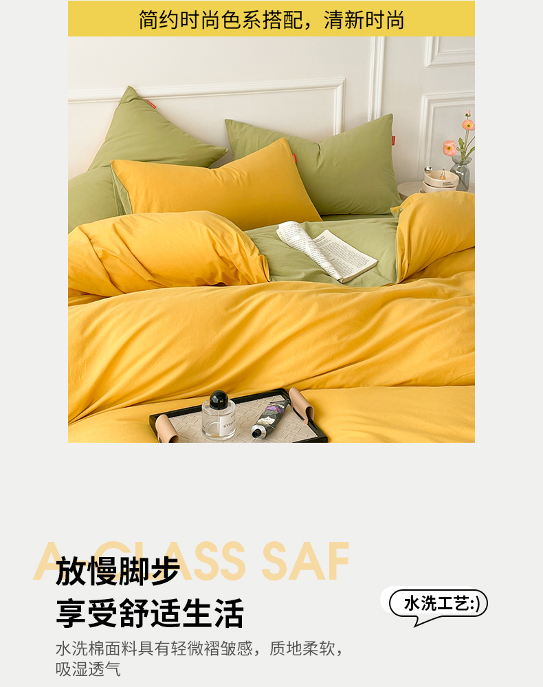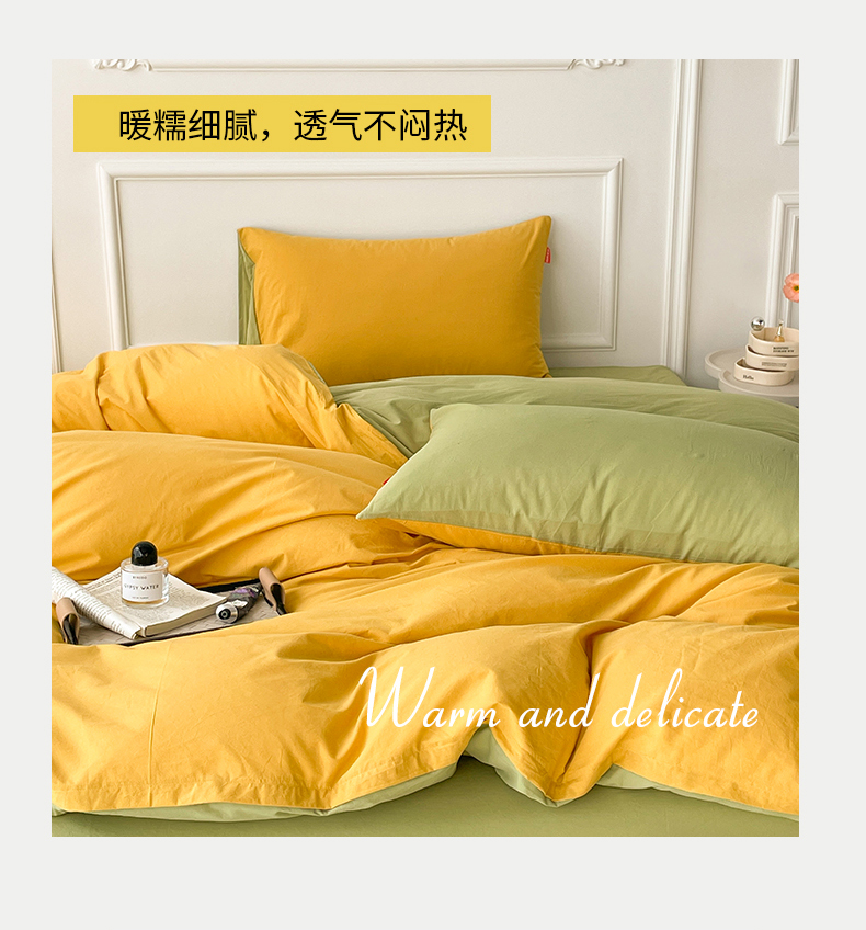 当前位置: 91家纺网 > 商品网购 > 床品套件 > 四件套 > 全棉普通四件套 > 春皖家纺 2026春夏新款双拼全棉纯棉水洗棉四件套 深黄-果绿