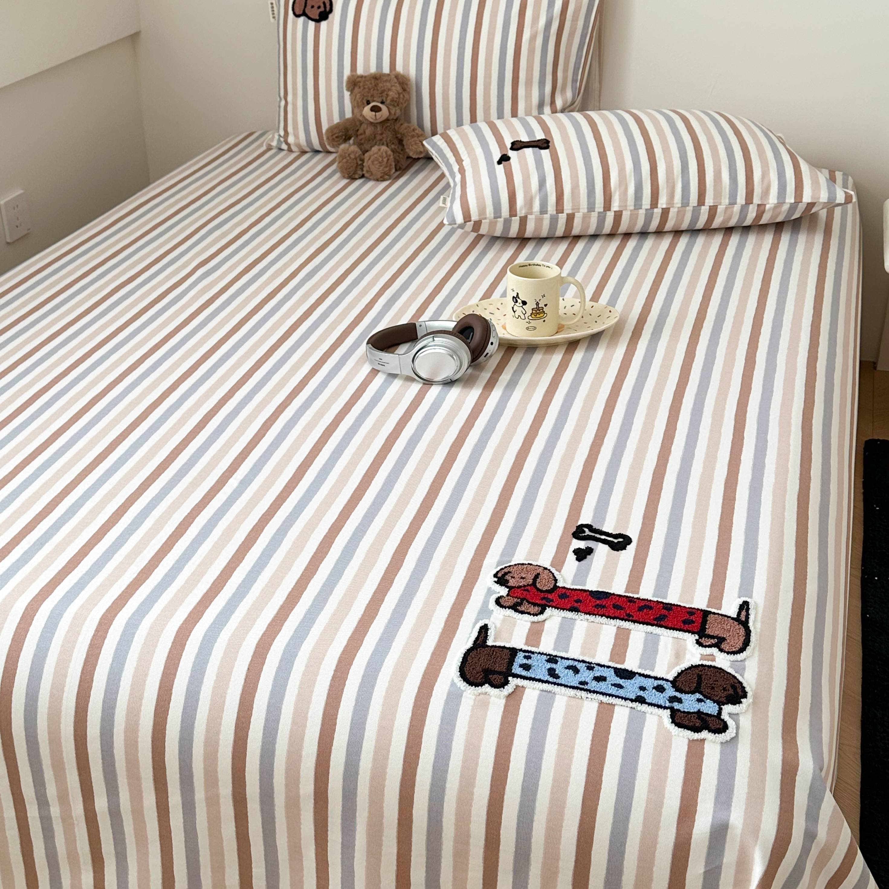 (总)珺柔家纺 2026新款全棉老粗布床单床笠三件套,Happy小狗,安睡熊,斑点狗,豹纹睡衣熊,咖条puppy,蓝豹纹小狗,蓝格苹果小狗,小可爱,幸运猫猫,音乐小猫,园丁小狗,朱迪