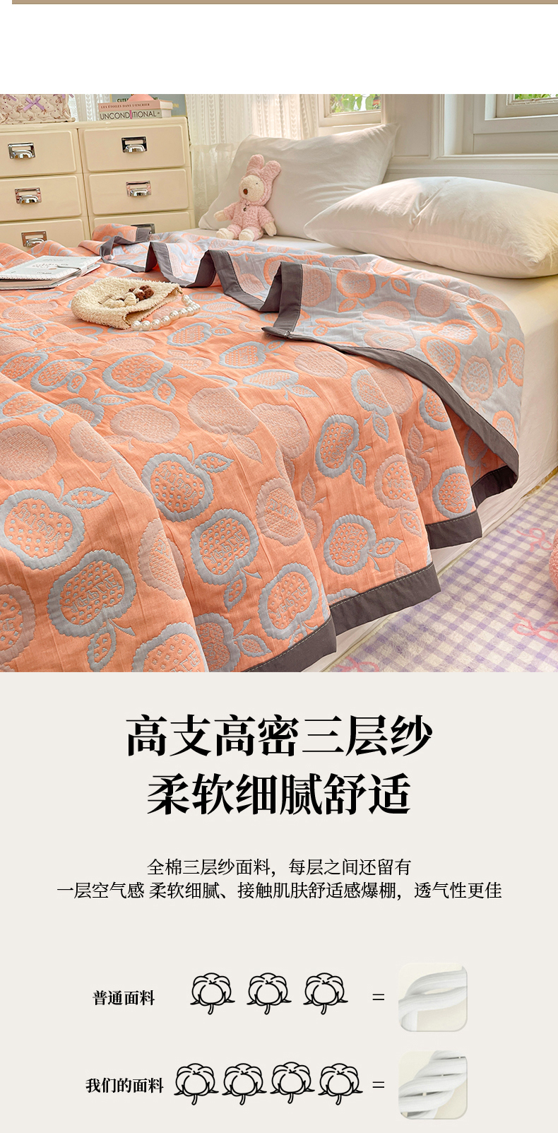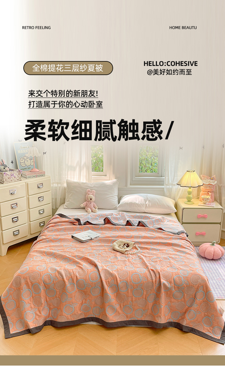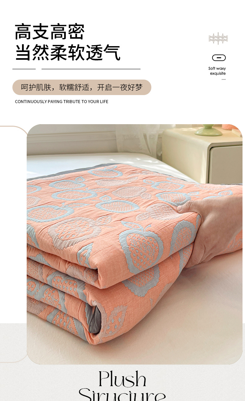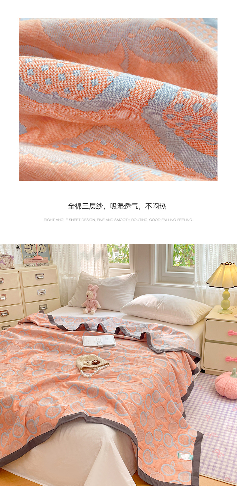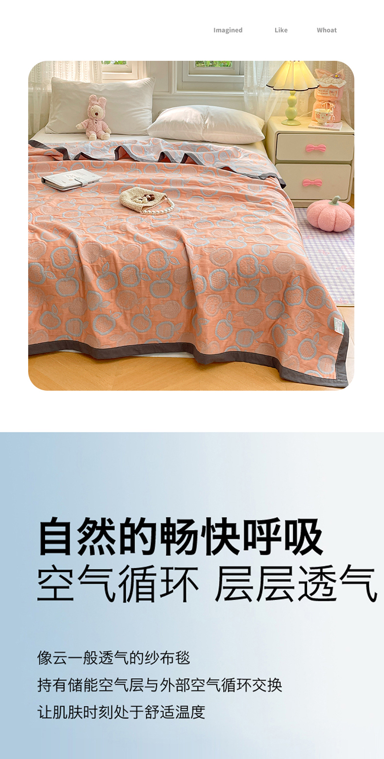 商品名称:云天家纺 2026新款A类全棉三层纱多功能毛巾被(盖毯床单夏被) 幸运苹果-桔
