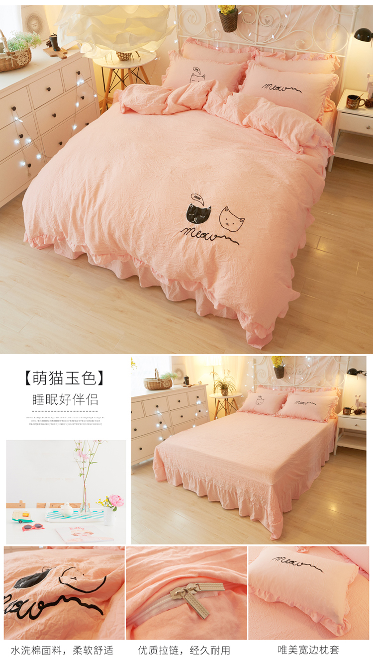 简爱家纺 2025新款水洗棉绣花四件套床单款 萌猫玉色