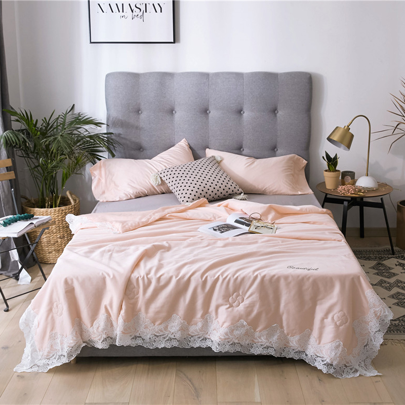 优然居家纺 2018长绒棉蕾丝花边公主风格夏被 萝莉粉