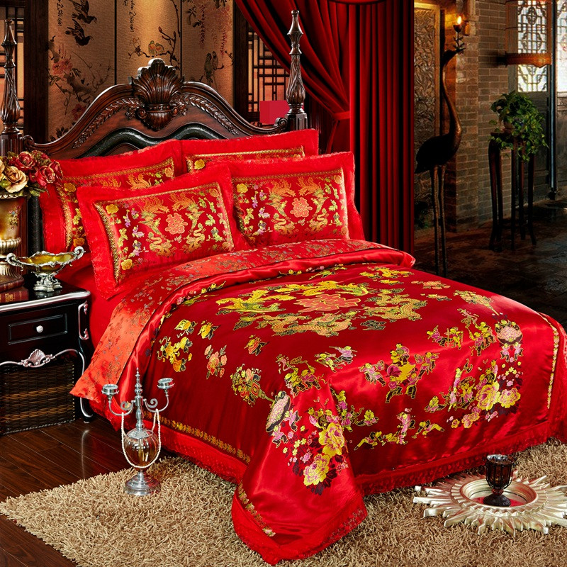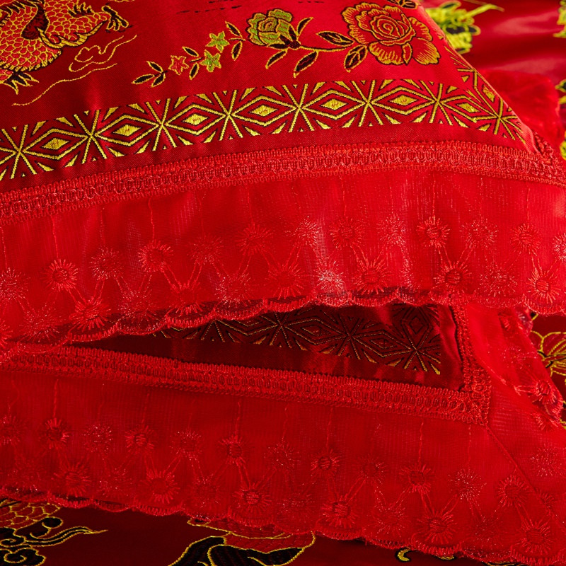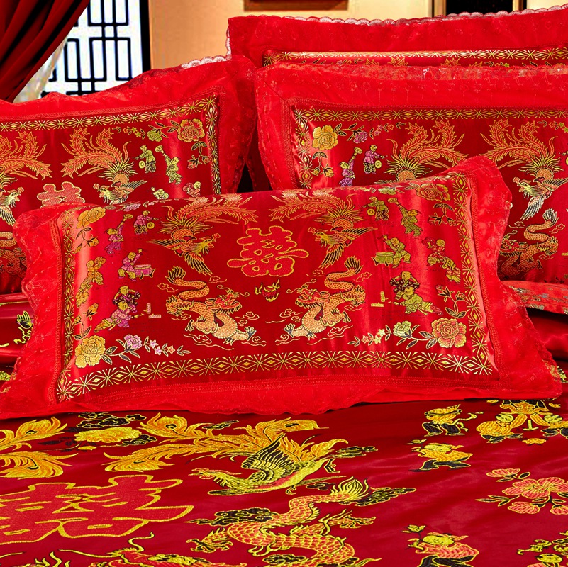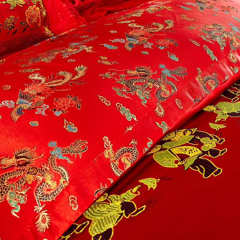 欣喜来 2020新款绸缎婚庆脱卸款四件套 龙凤百子-红