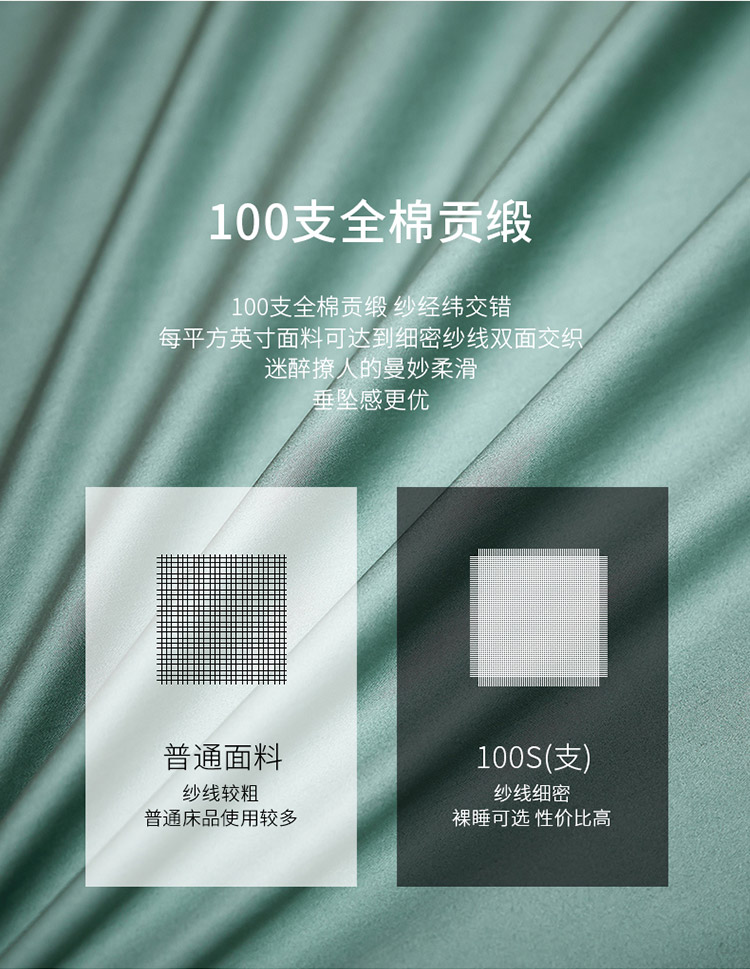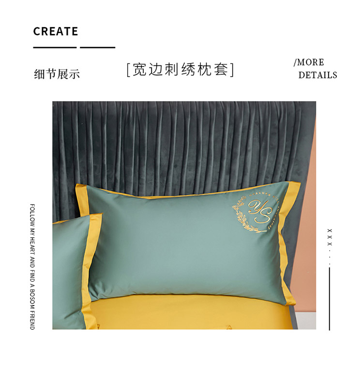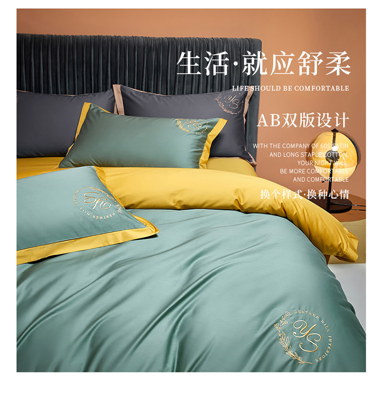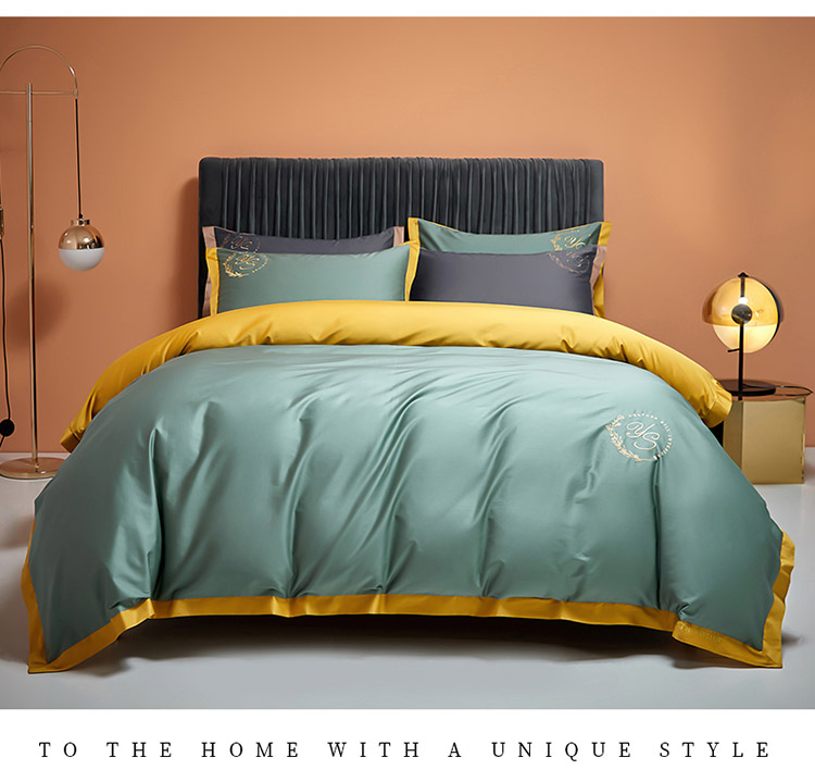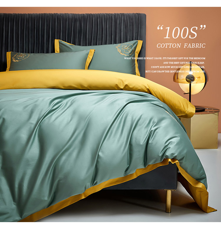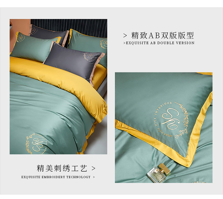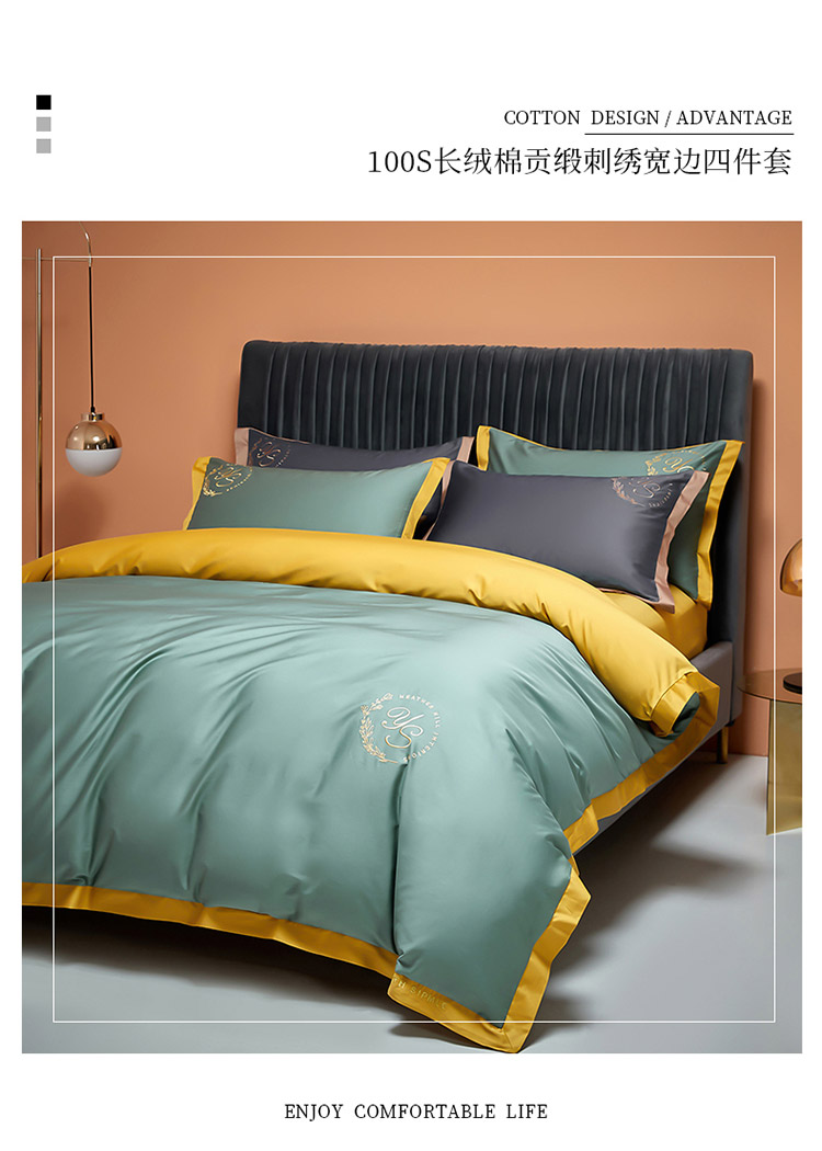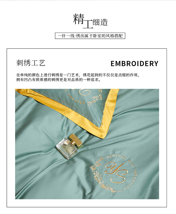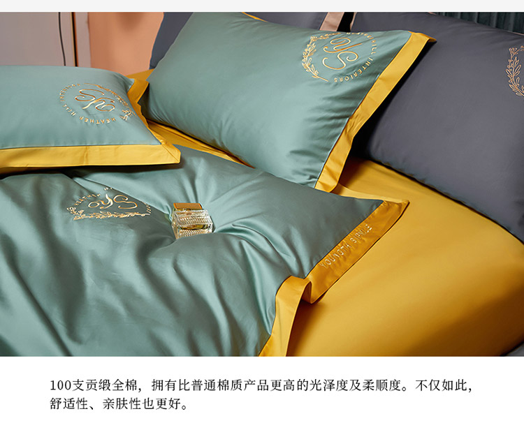 商品名称:爱缦2020澳棉100S长绒棉刺绣简系列四件套 松绿-金黄色