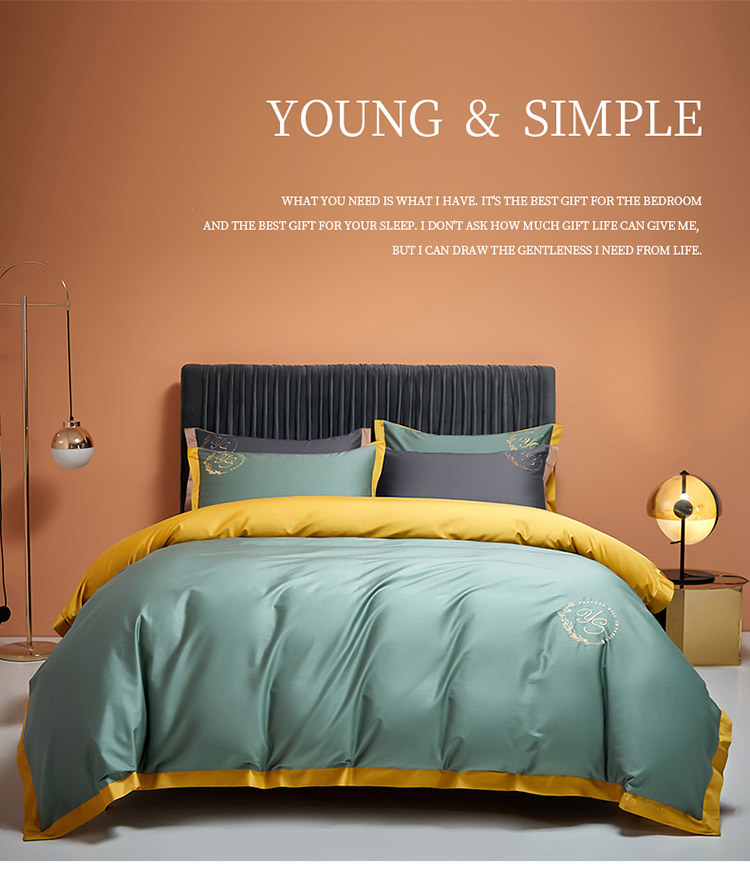 爱缦2020澳棉100S长绒棉刺绣简系列四件套 松绿-金黄色