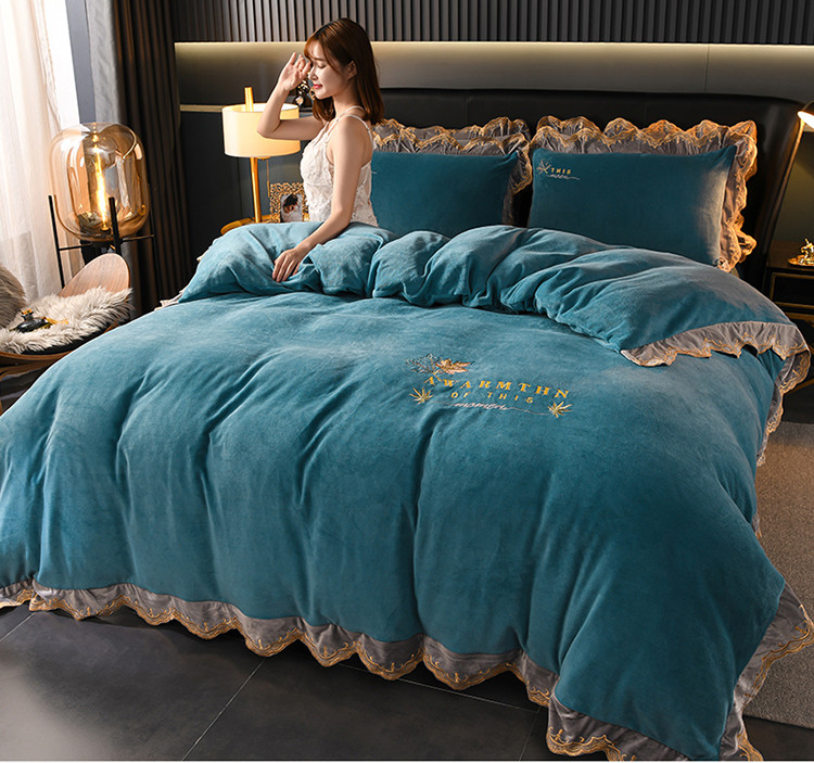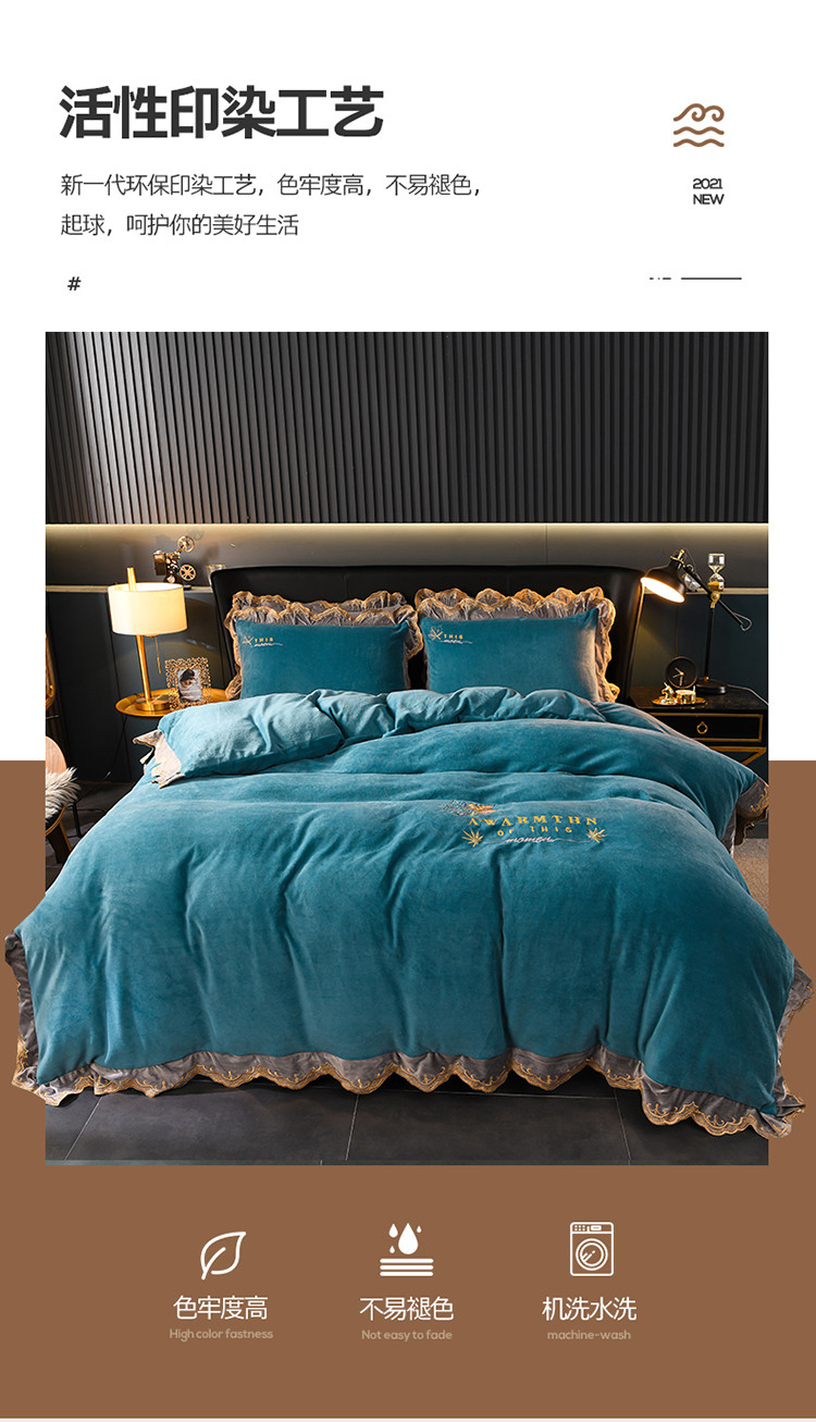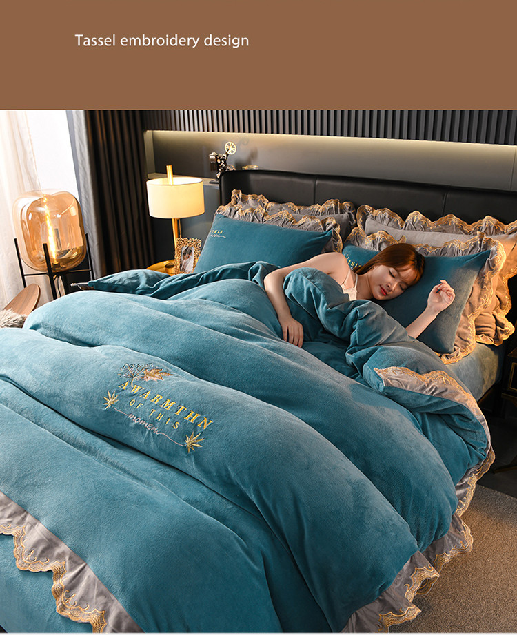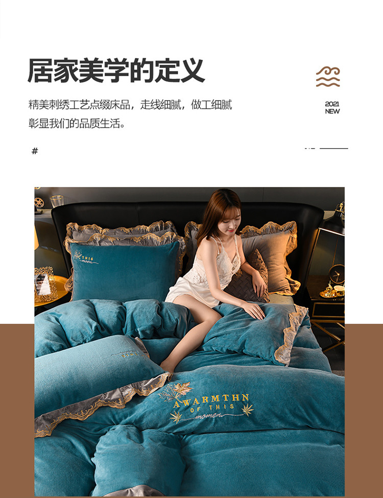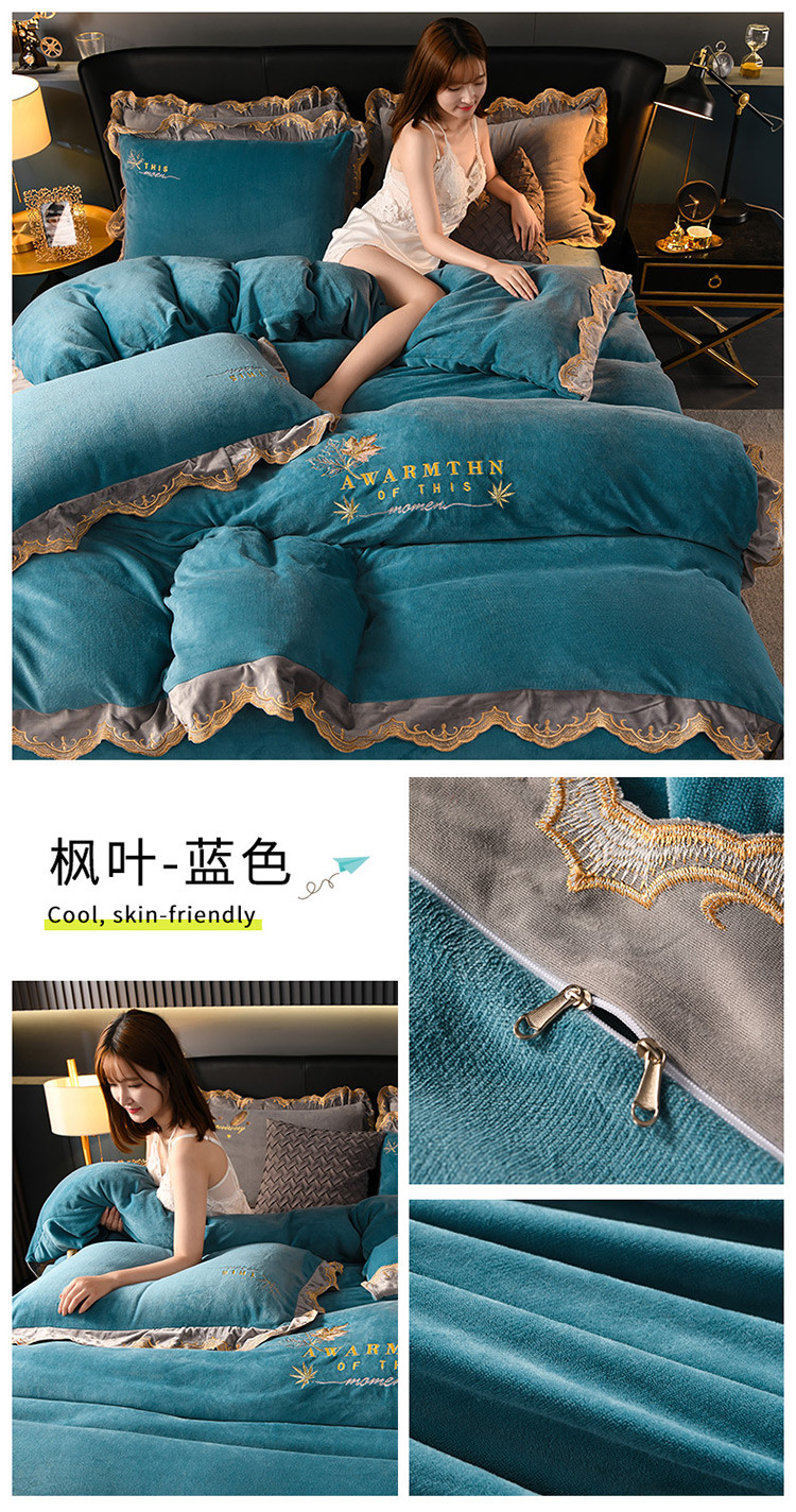 眠帛家居 2021新款秋冬牛奶绒刺绣工艺四件套 枫叶-蓝色