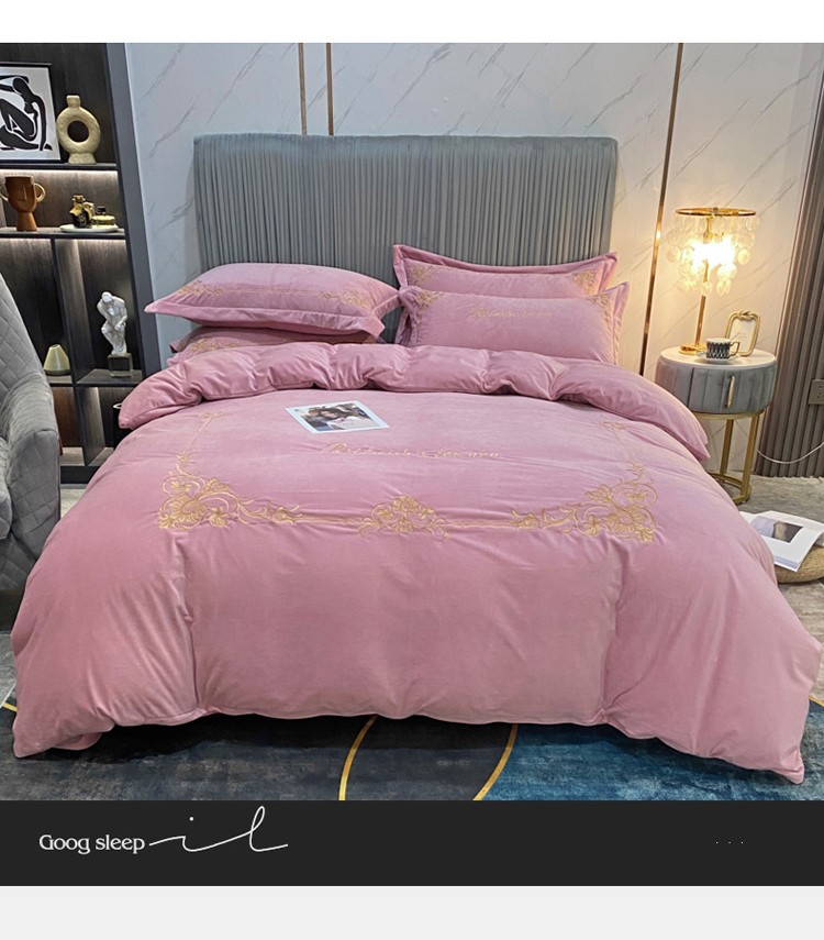 星尚2021高品质婴儿绒夹棉床盖绣花四件套牛奶法莱绒 清雅粉