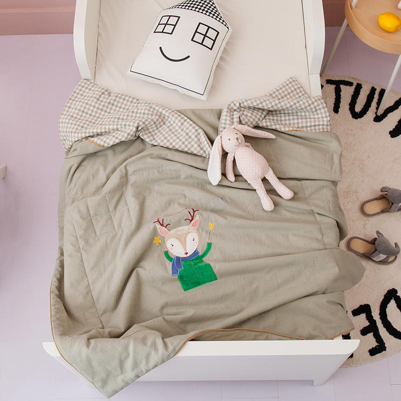 (总)喜多兔儿童家纺 2025春夏新款小软萌贴布绣纱布被,粉色软萌小兔,卡其色软萌小熊,蓝色软萌小象,绿色软萌恐龙,组合图仅供展示