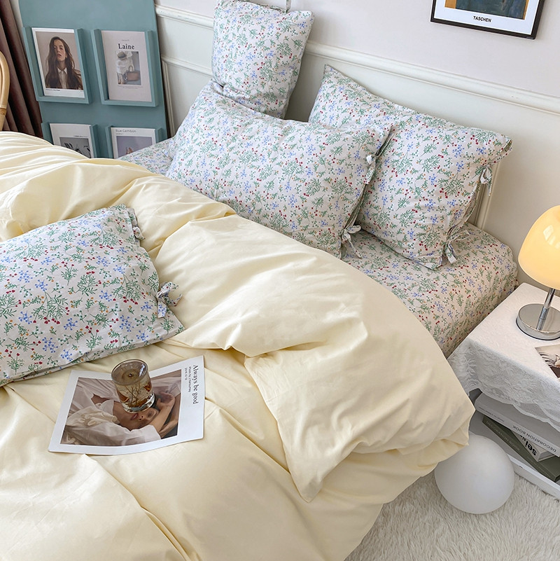 商品名称:一米阳光 新款蝴蝶结色织水洗棉小碎花撞色四件套-情怀系列 淡奶油