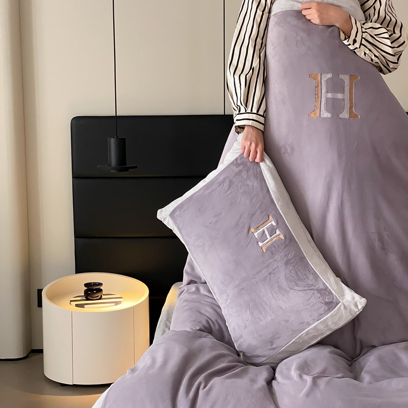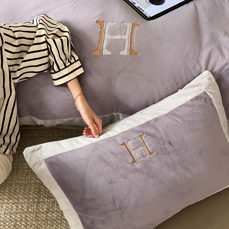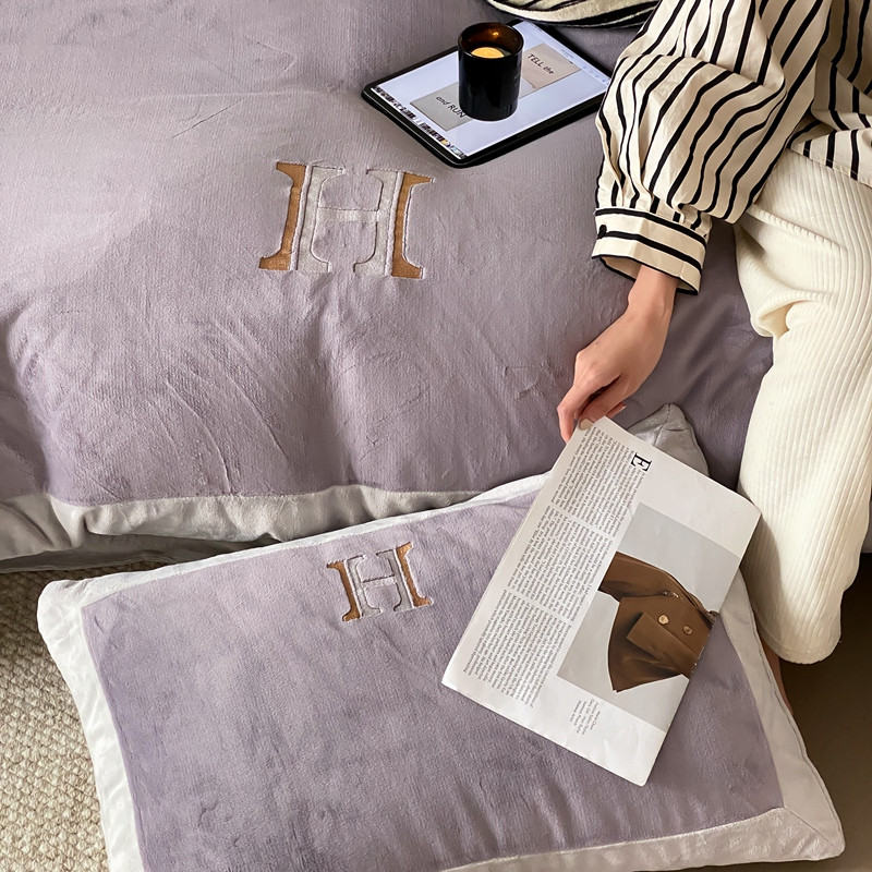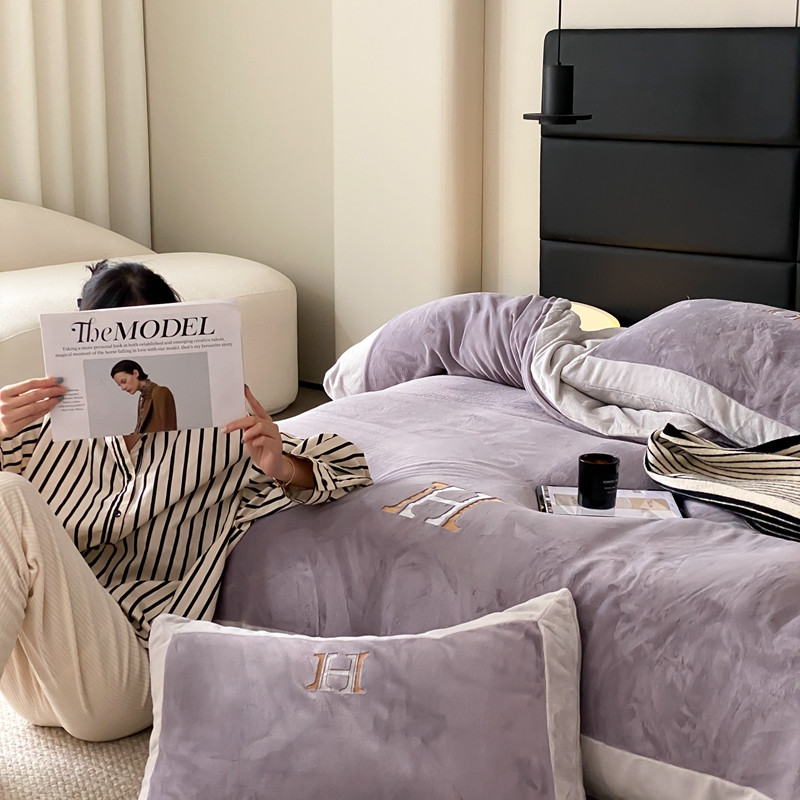 商品名称:橘滋 2022新款秋冬高端牛奶绒四件套-拼角H模特图 H灰紫