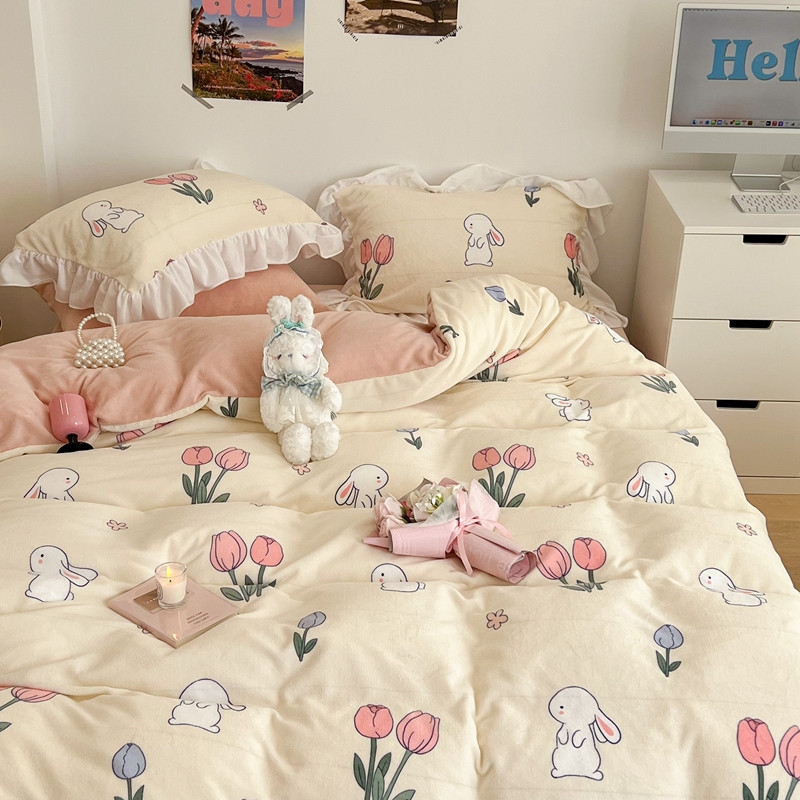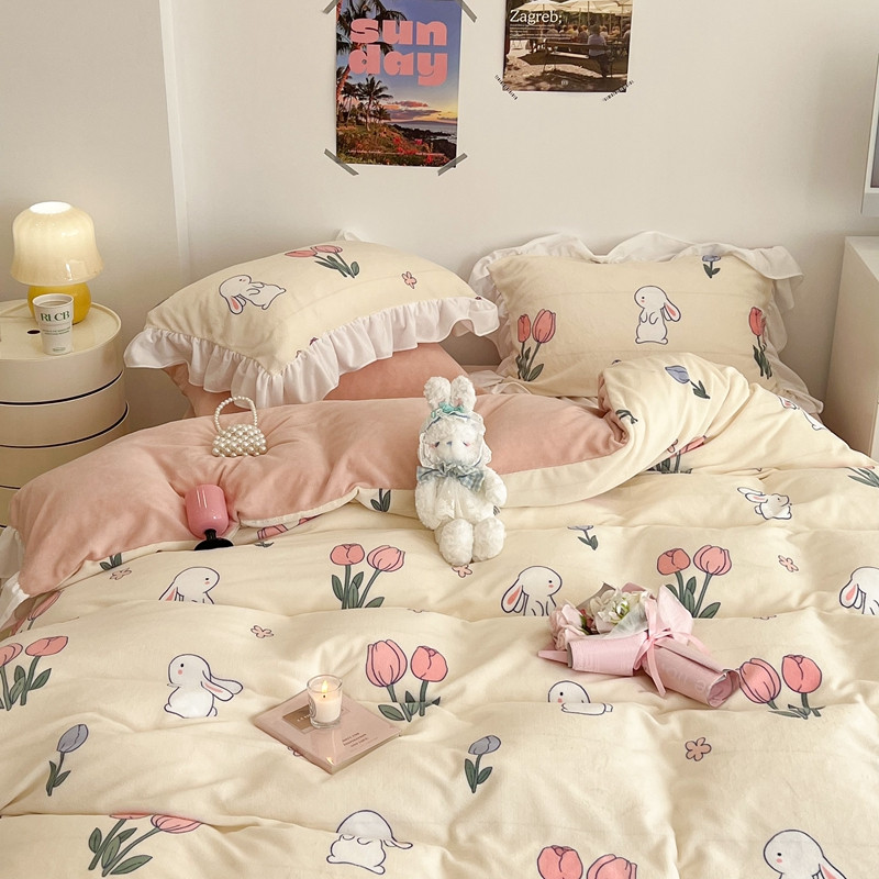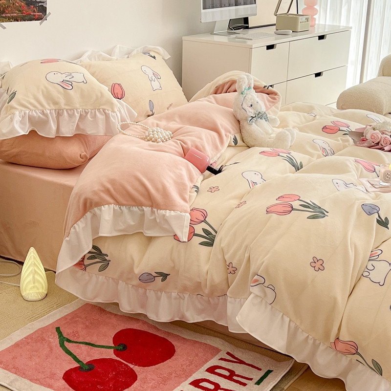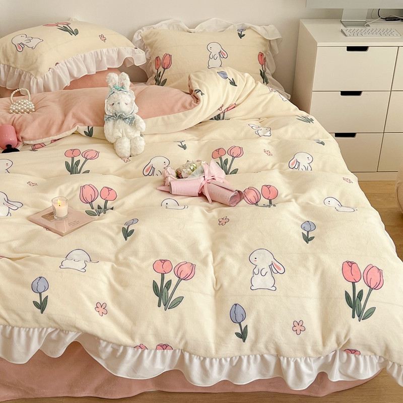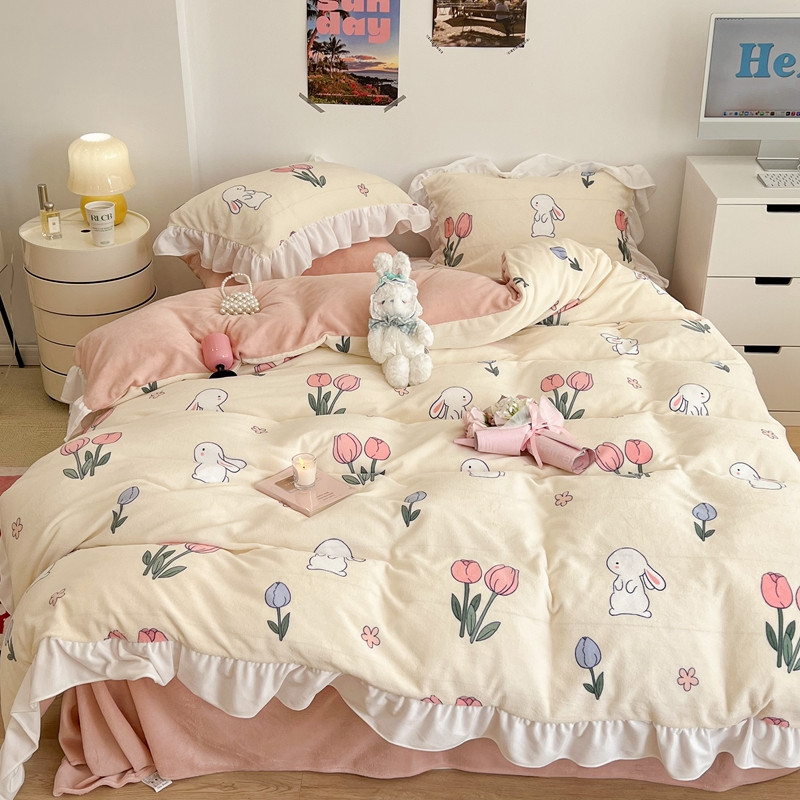 昔可 2022新款花边牛奶绒四件套 粉粉郁金兔