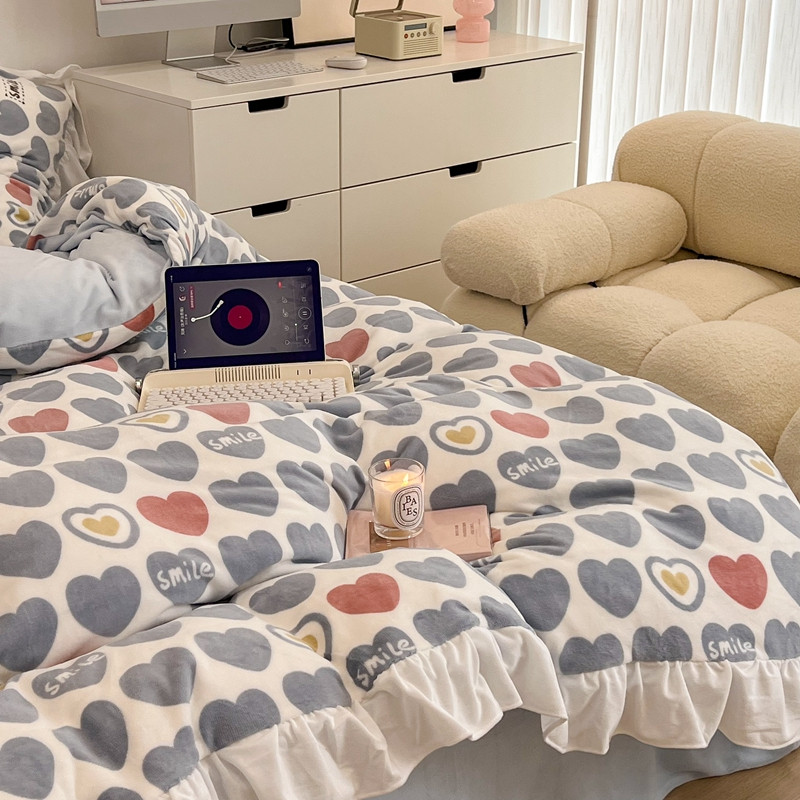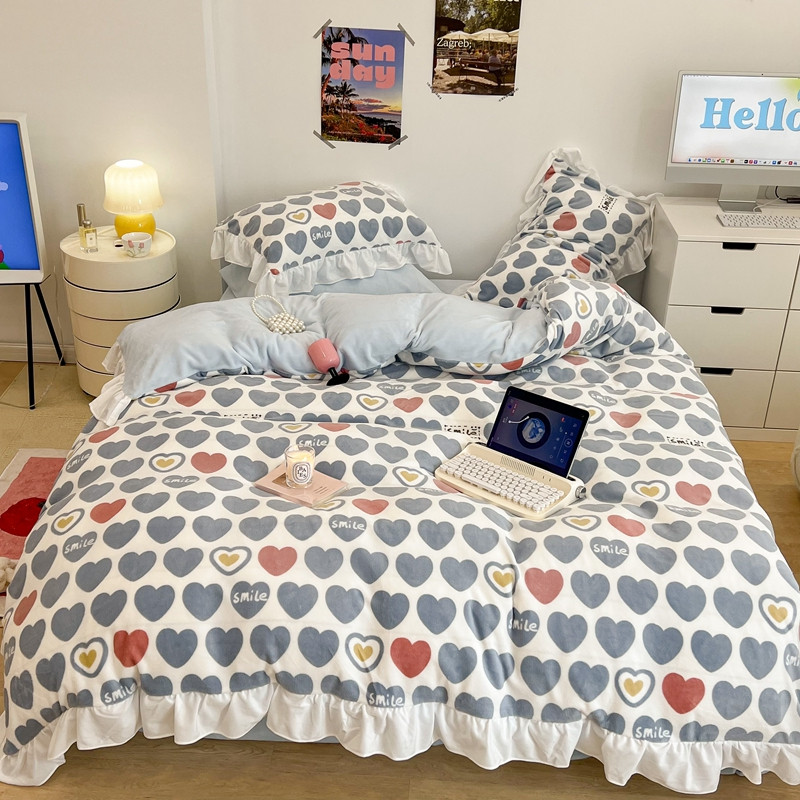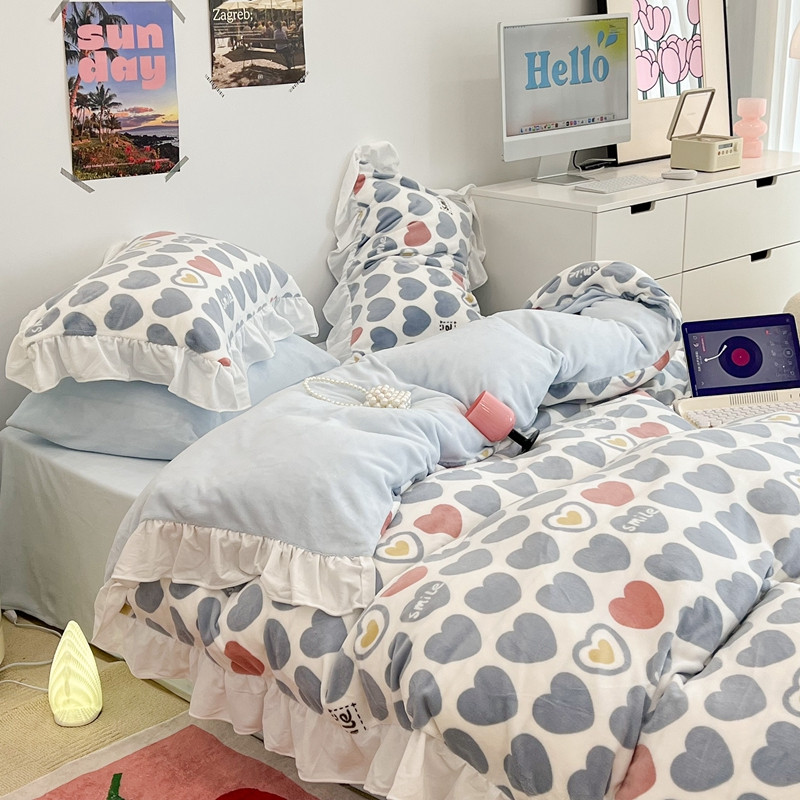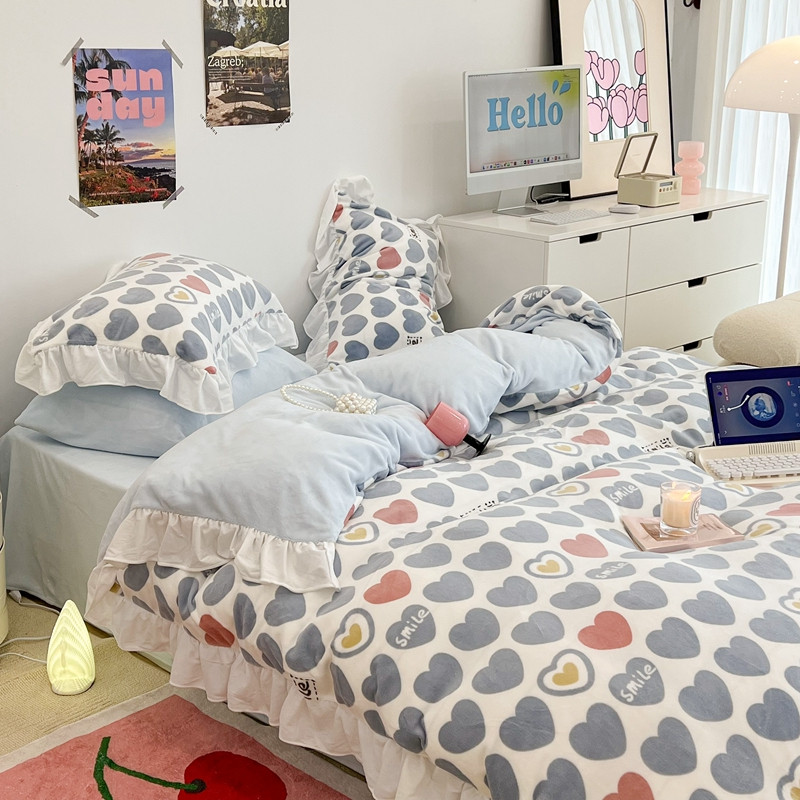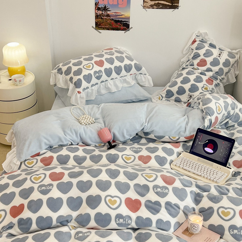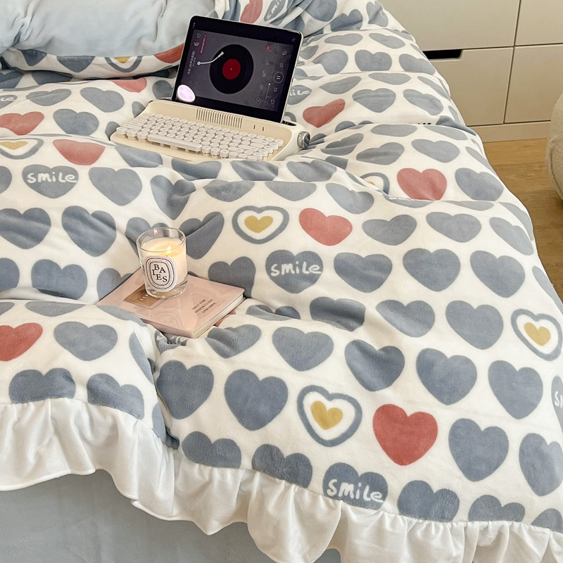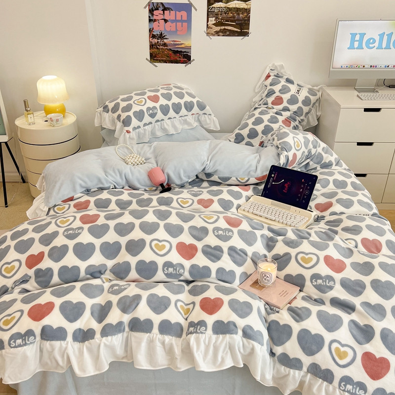 昔可 2022新款花边牛奶绒四件套 微笑爱心蓝