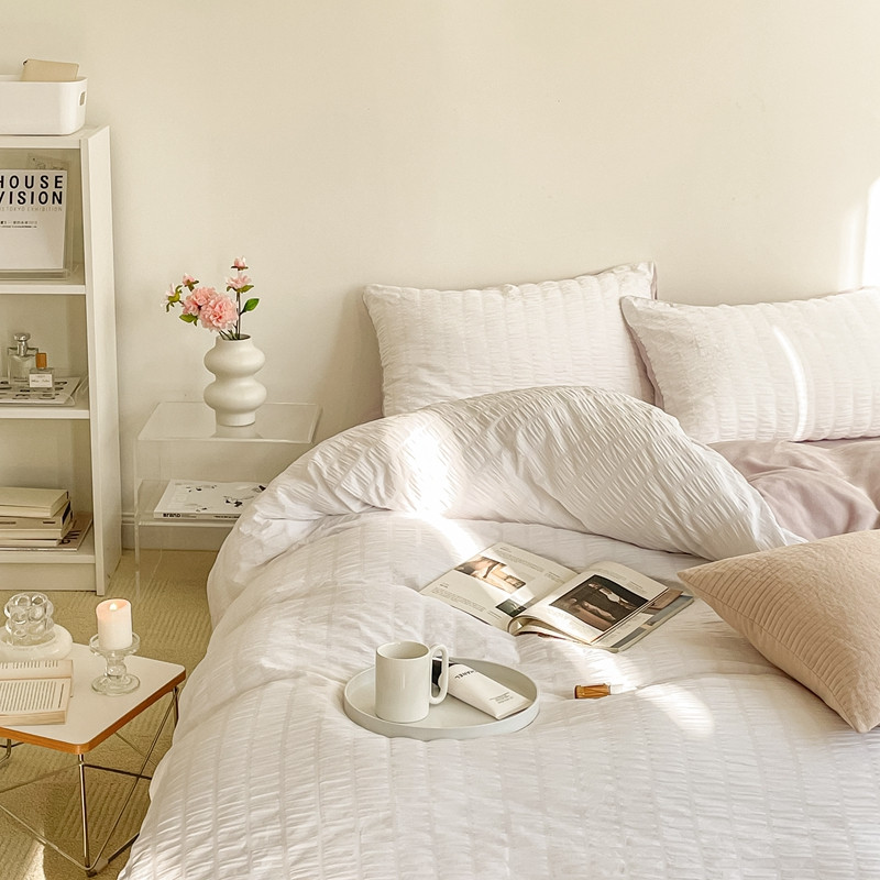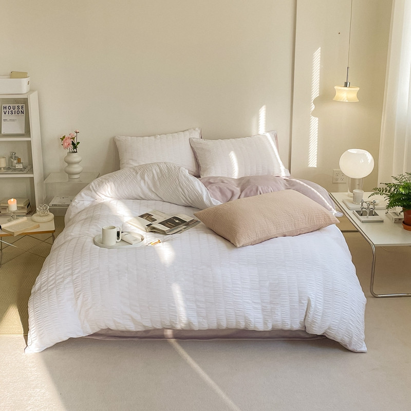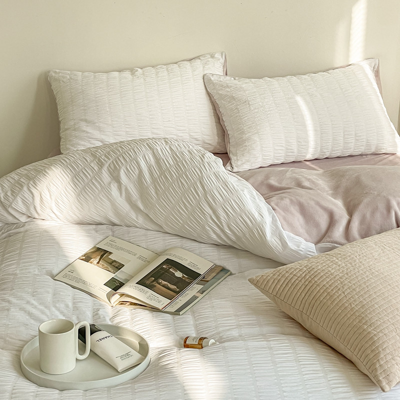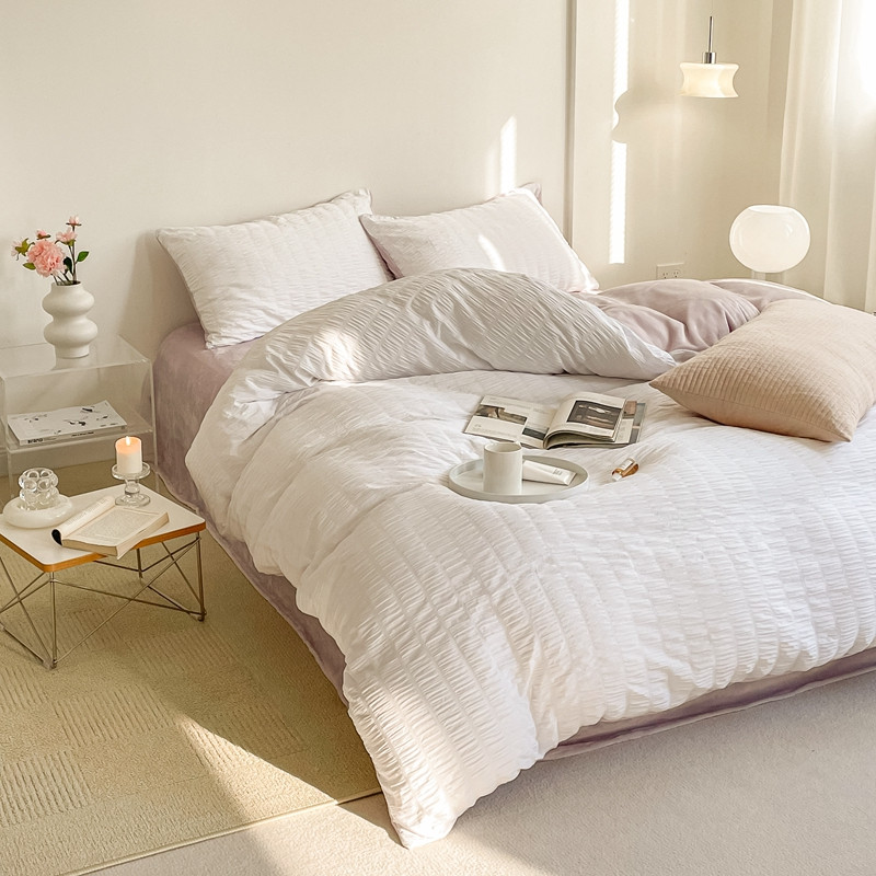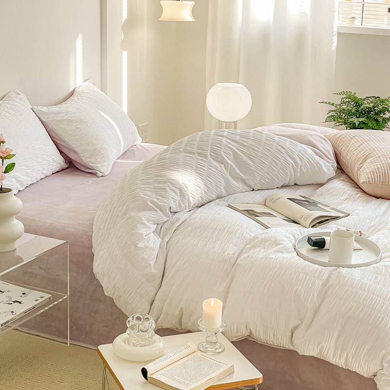 顾里家纺 2022新款ins韩系仙女泡泡纱牛奶绒四件套 月牙白