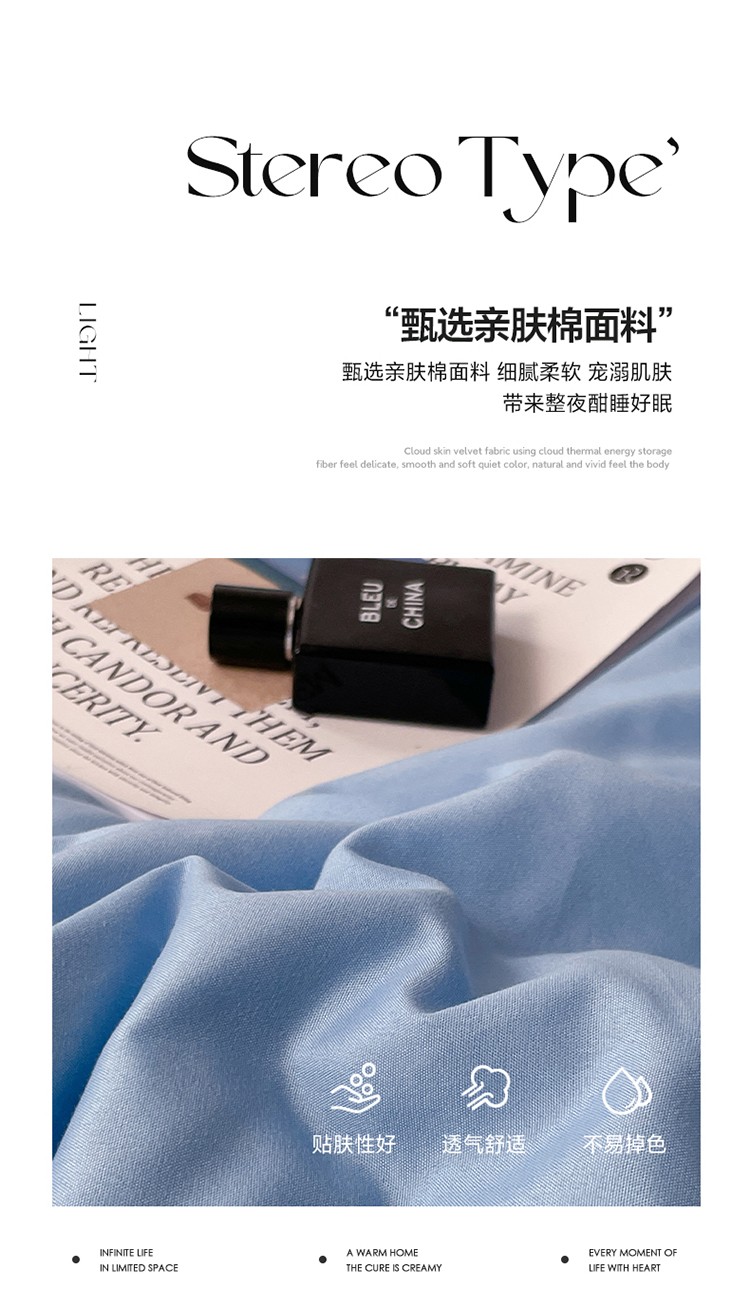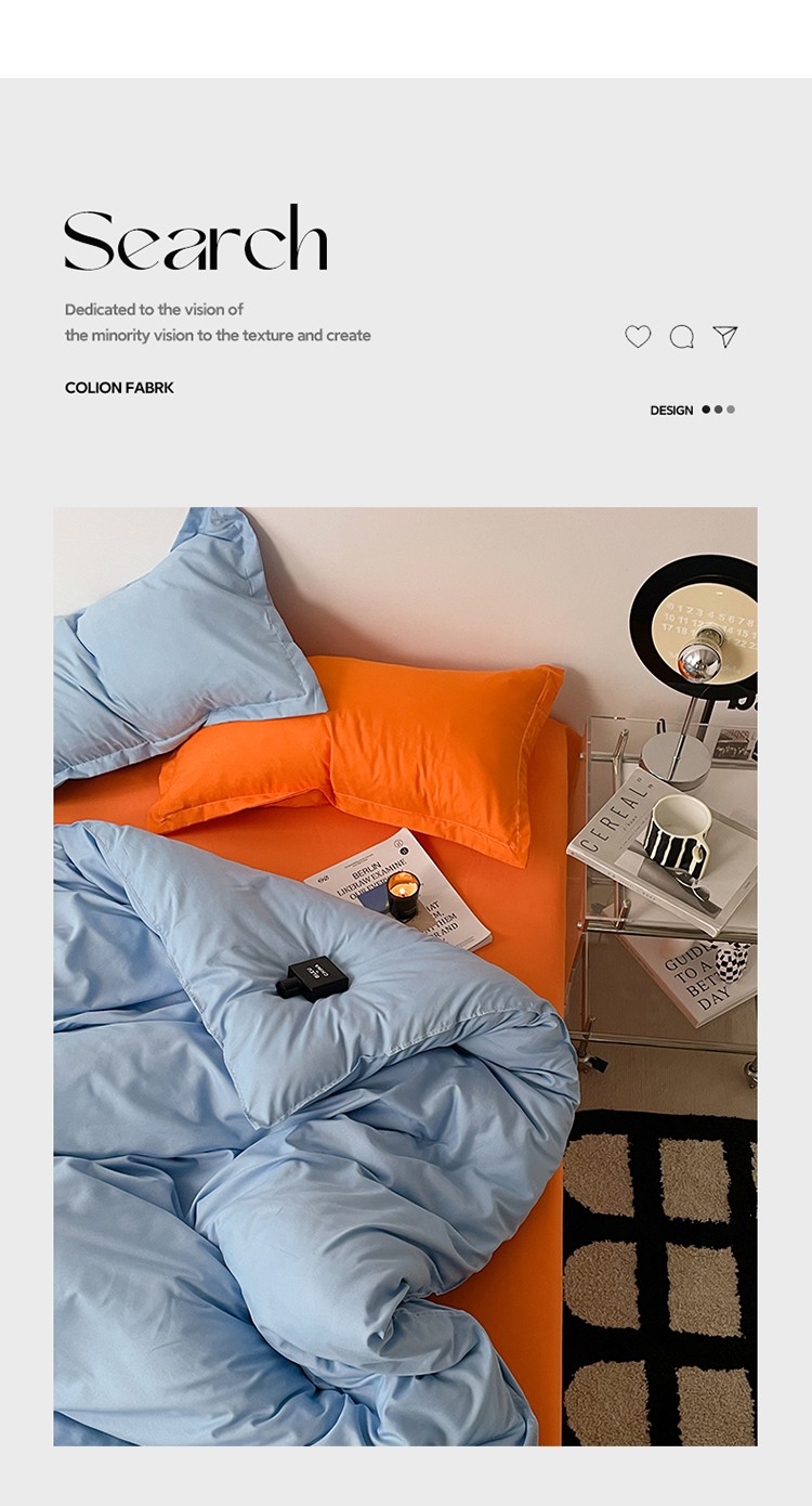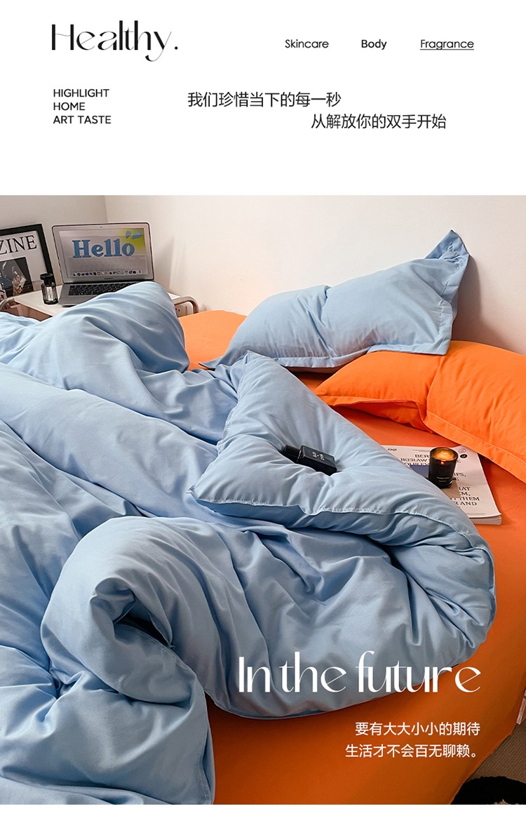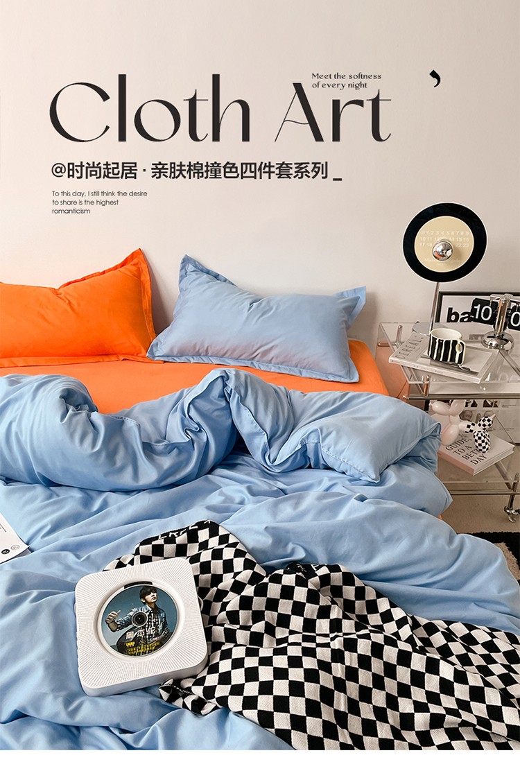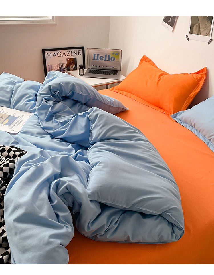 商品名称:贝拉梦 2023款亲肤棉纯色拼色治 愈系四件套 海洋天蓝+橘子汽水
