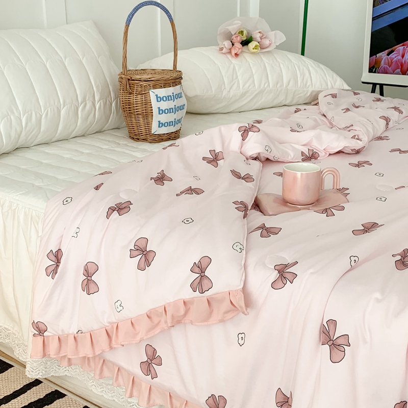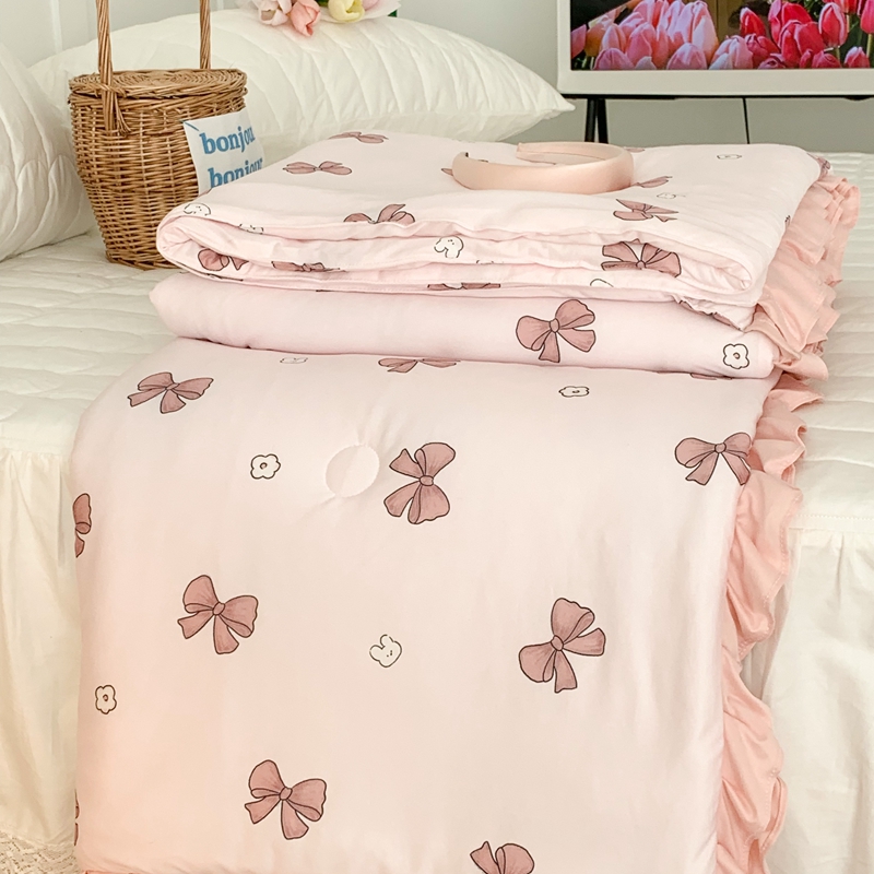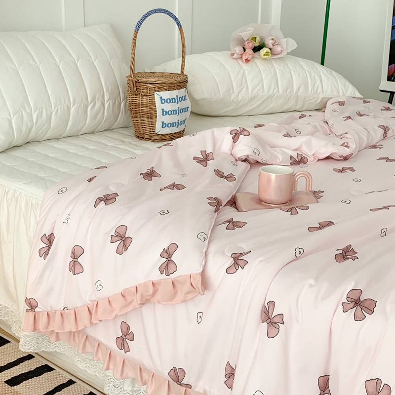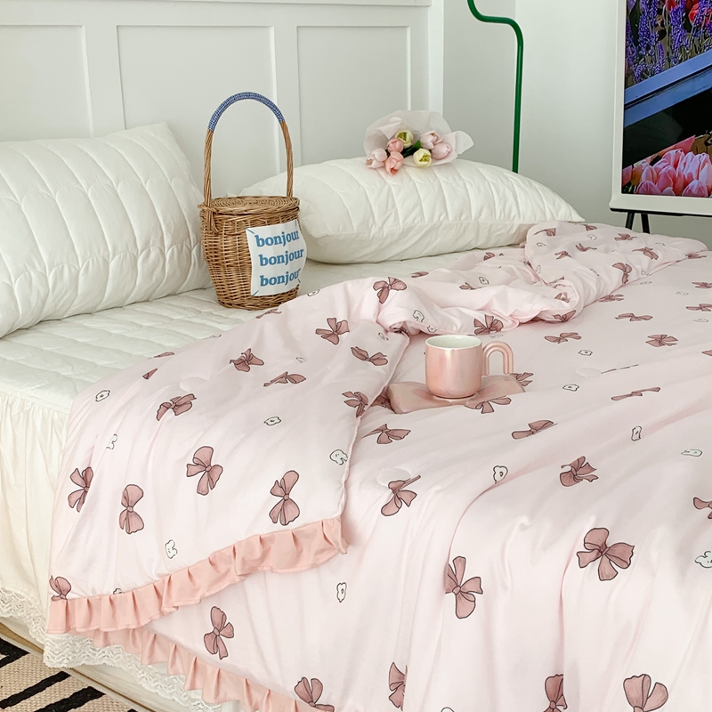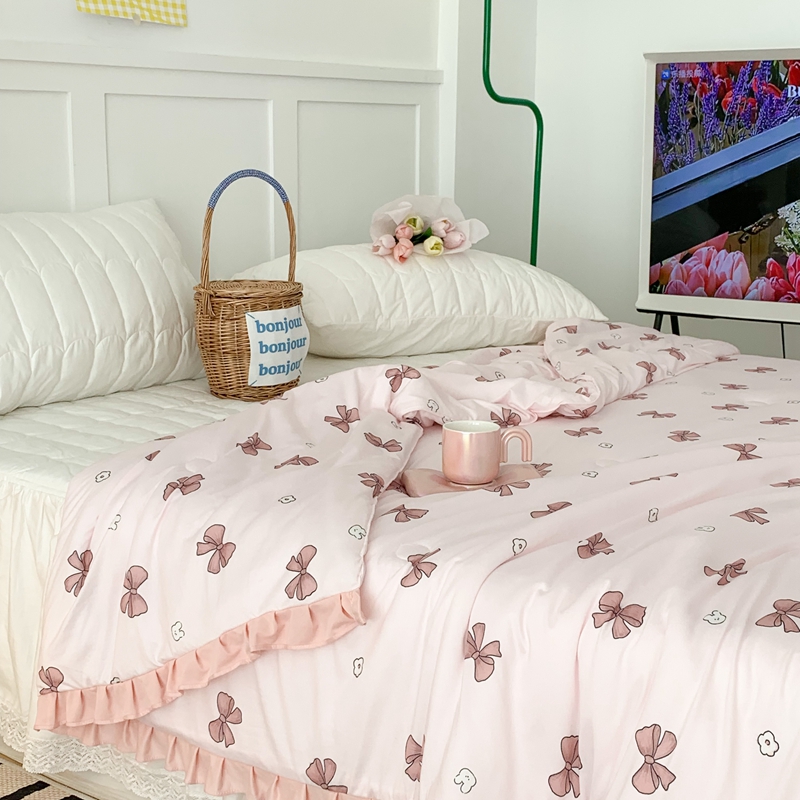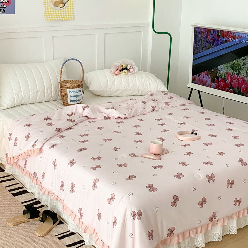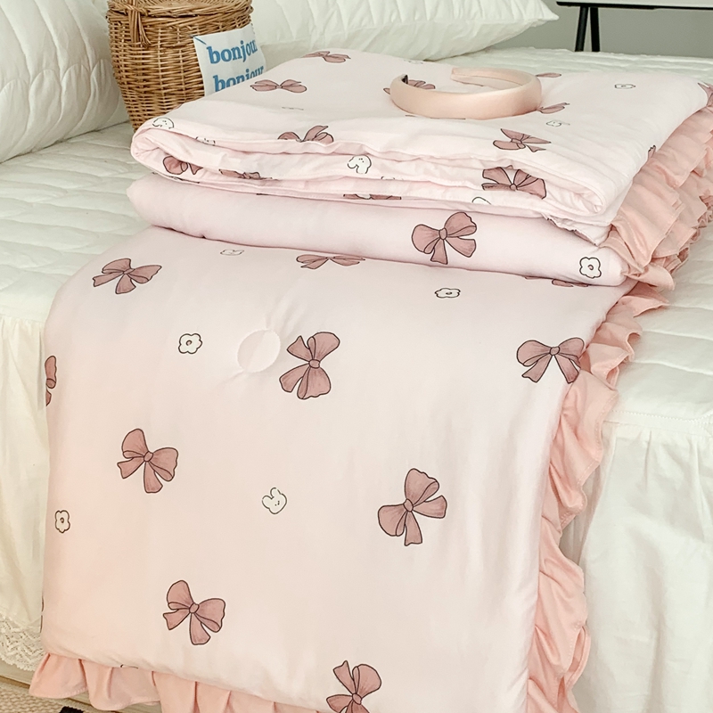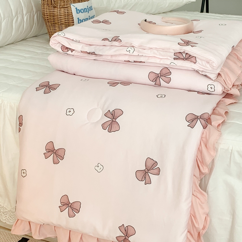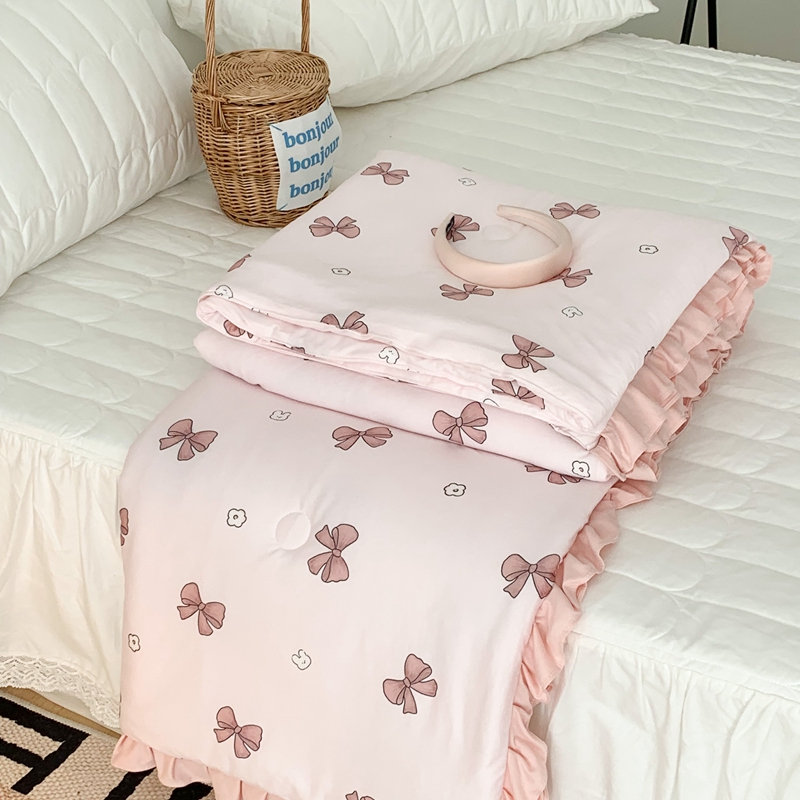 昔可家纺2023新款花边款云柔针织大豆夏被 小熊蝴蝶结粉