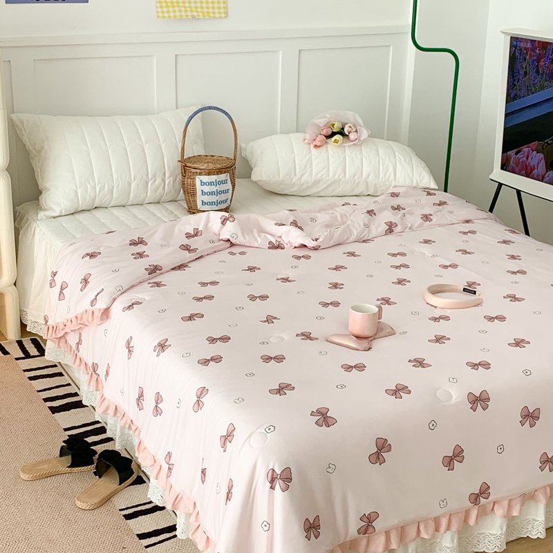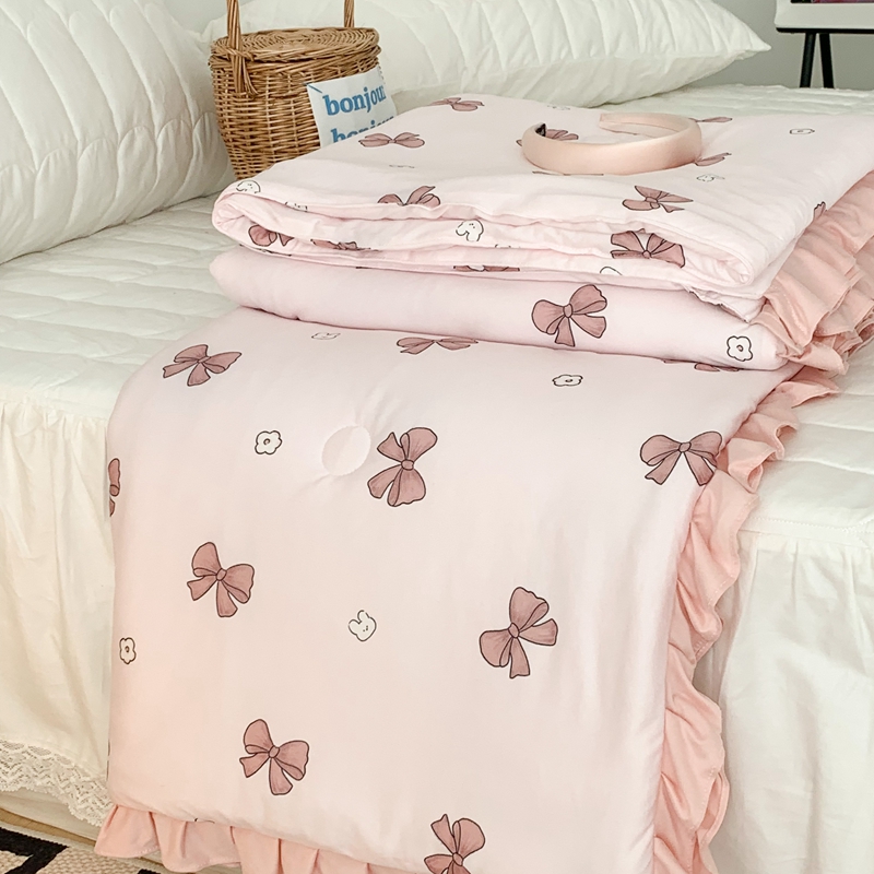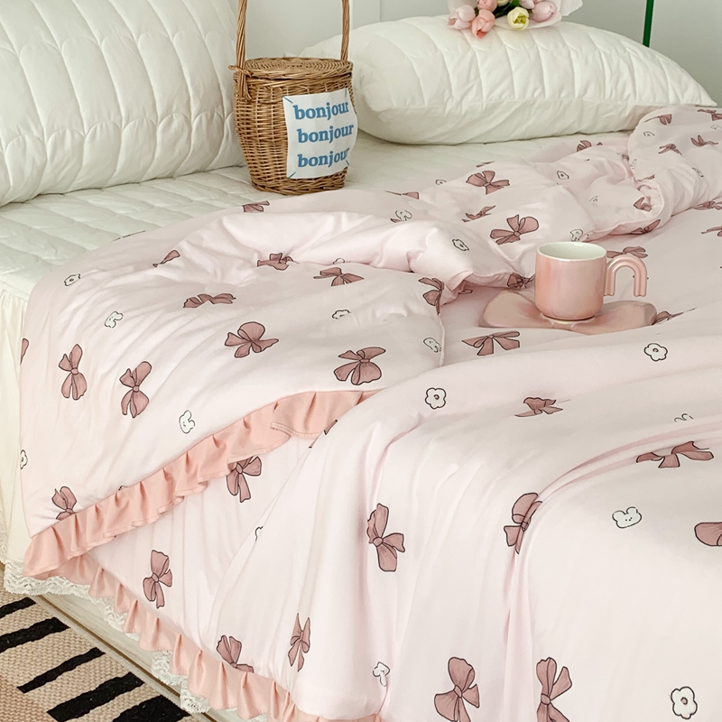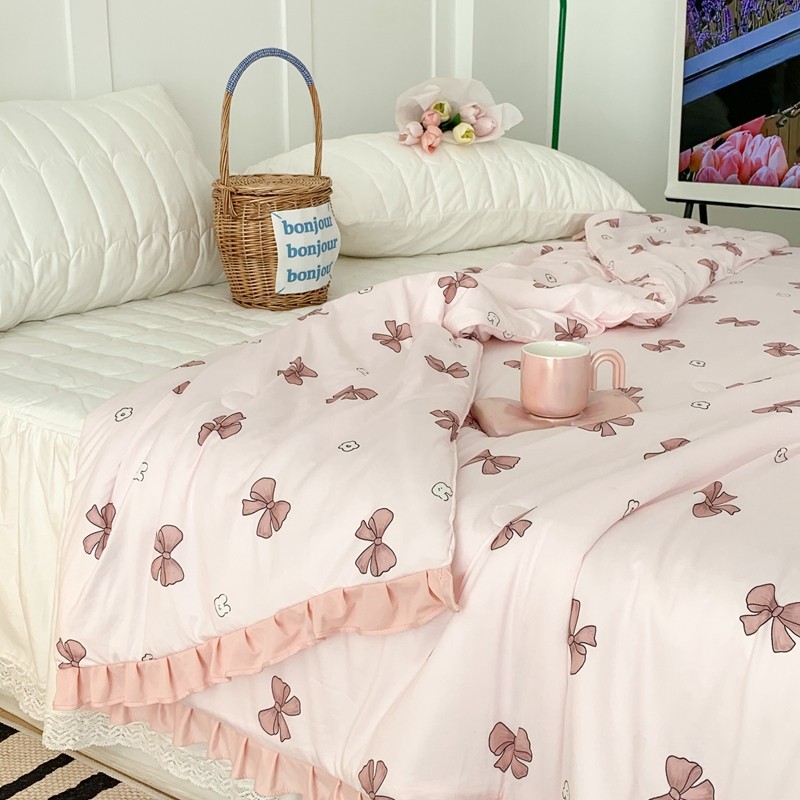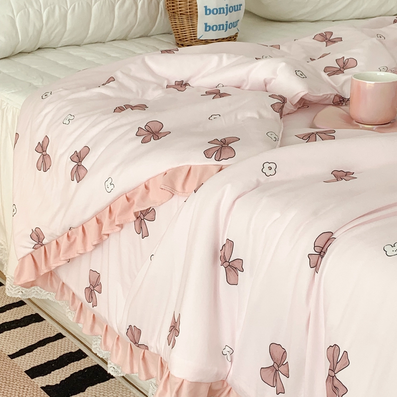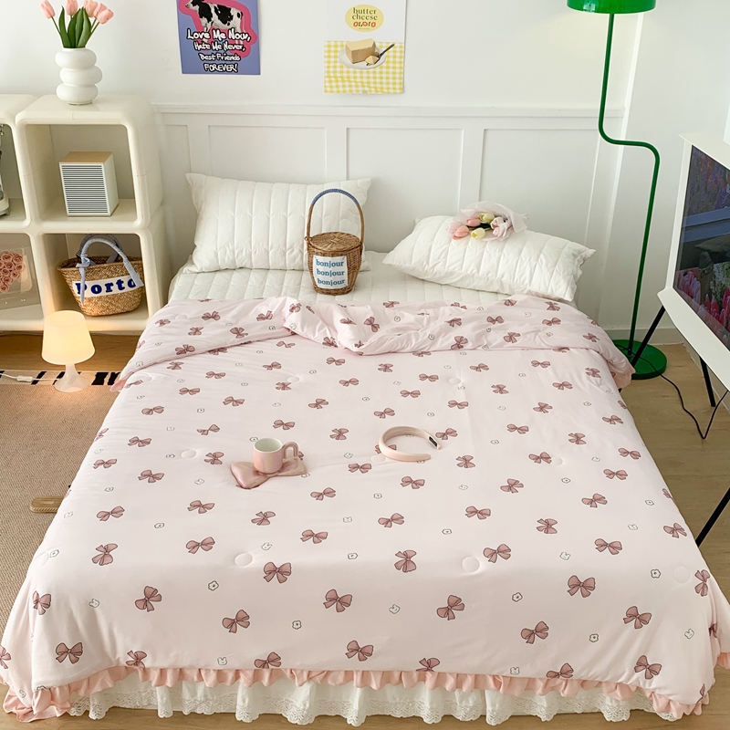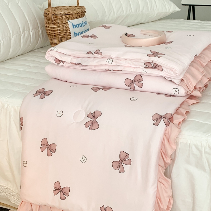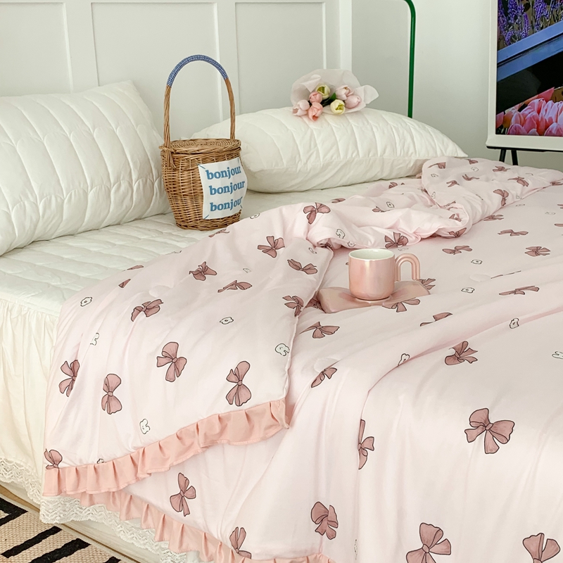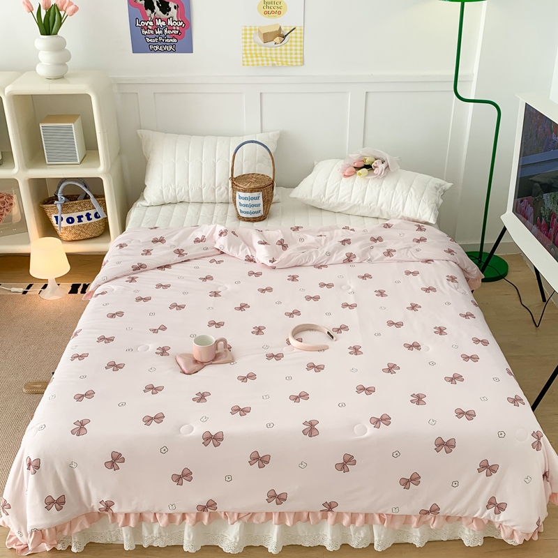 昔可家纺2023新款花边款云柔针织大豆夏被 小熊蝴蝶结粉