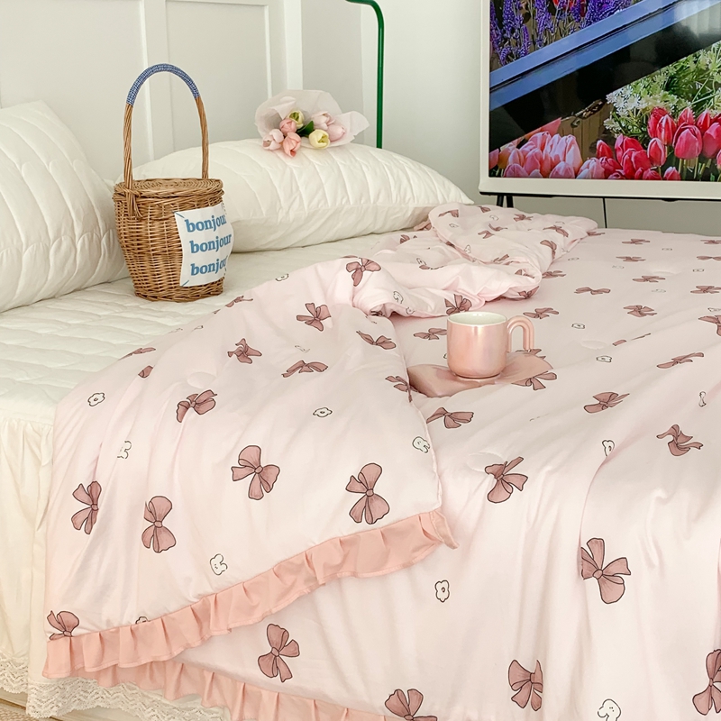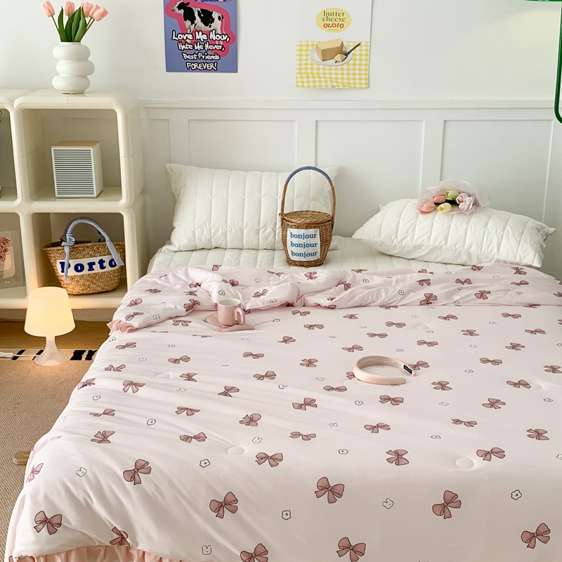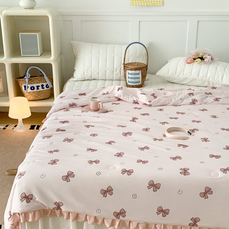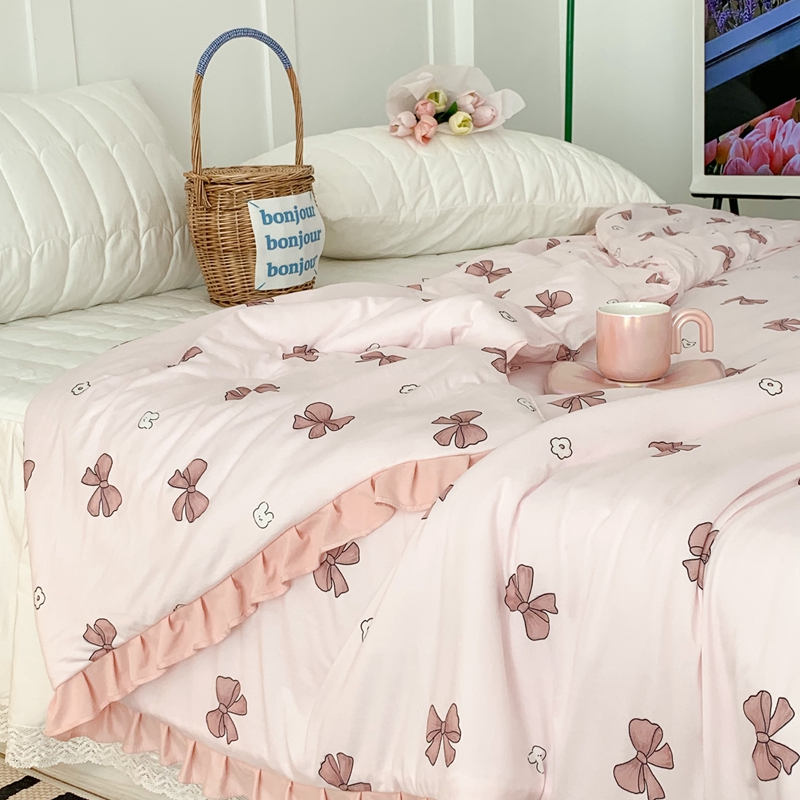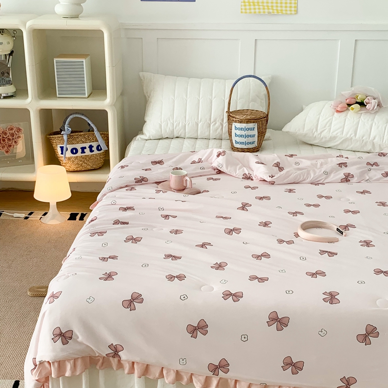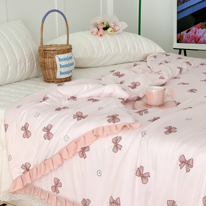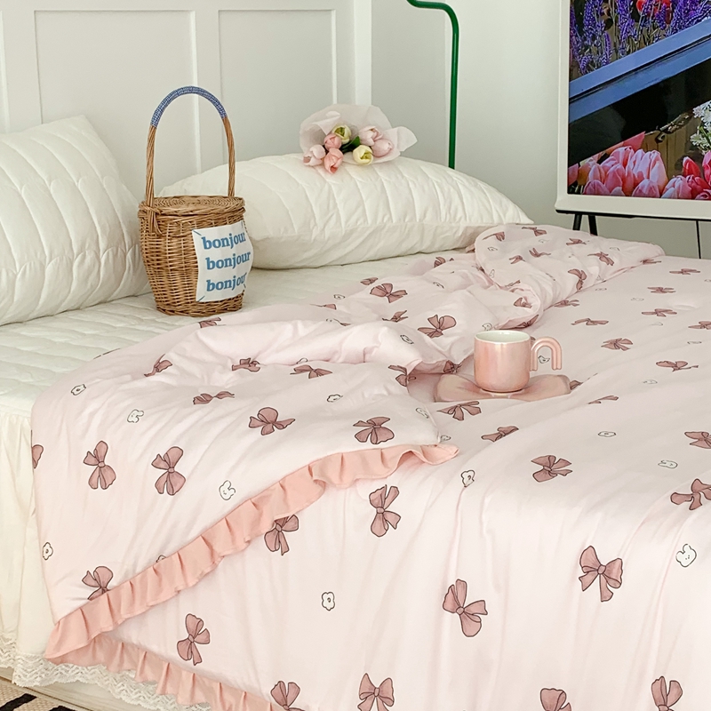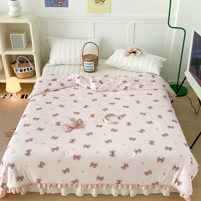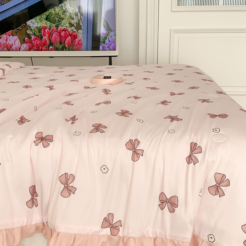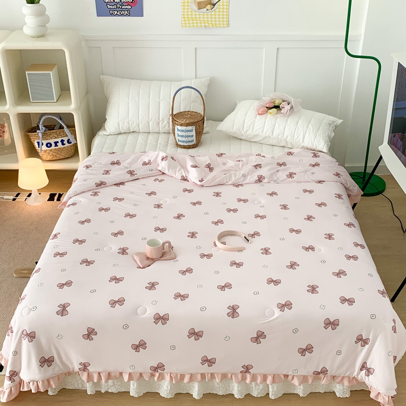 昔可家纺2023新款花边款云柔针织大豆夏被 小熊蝴蝶结粉