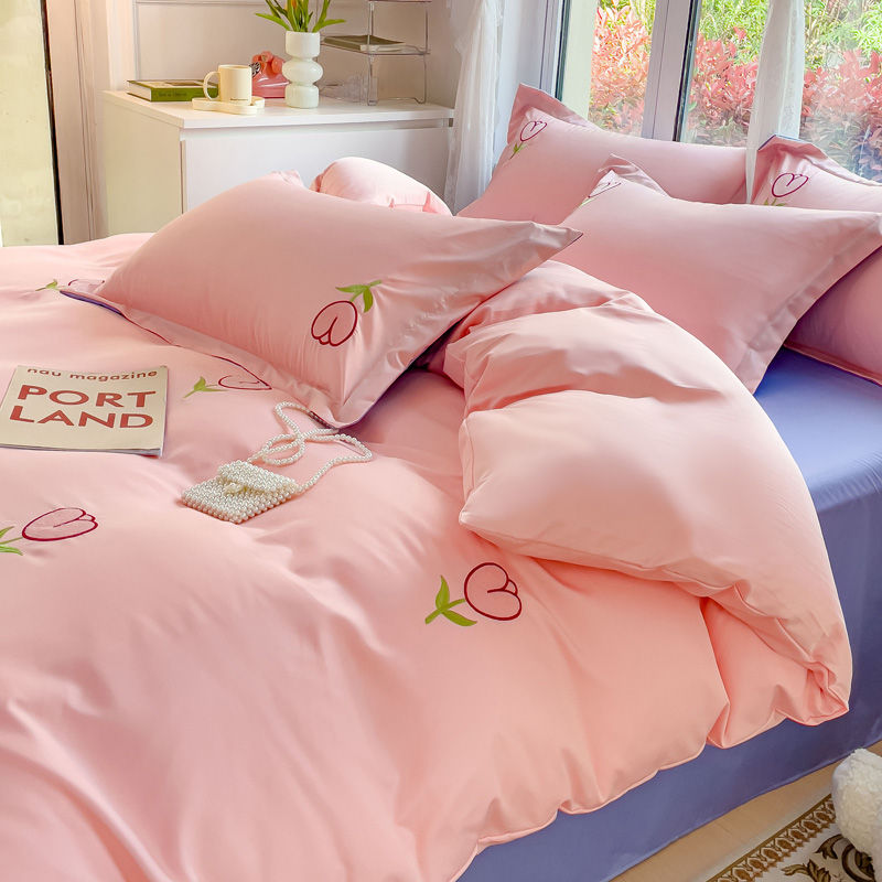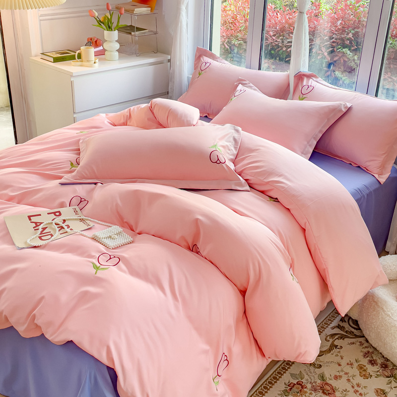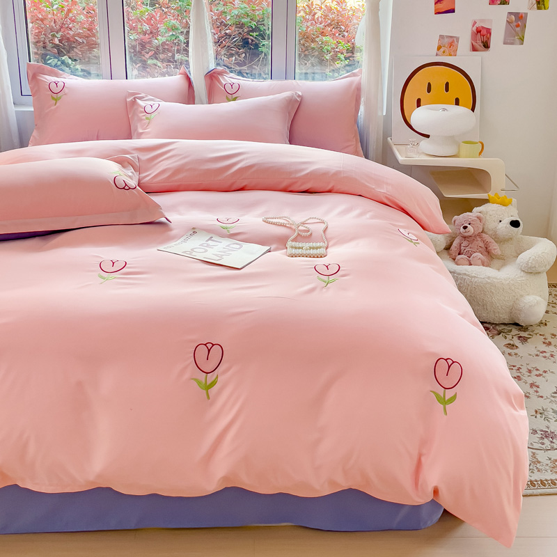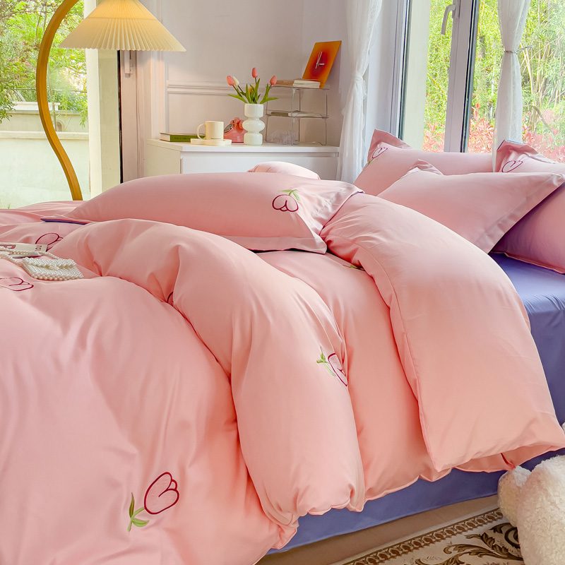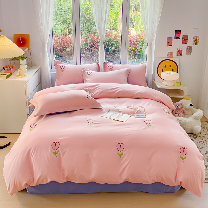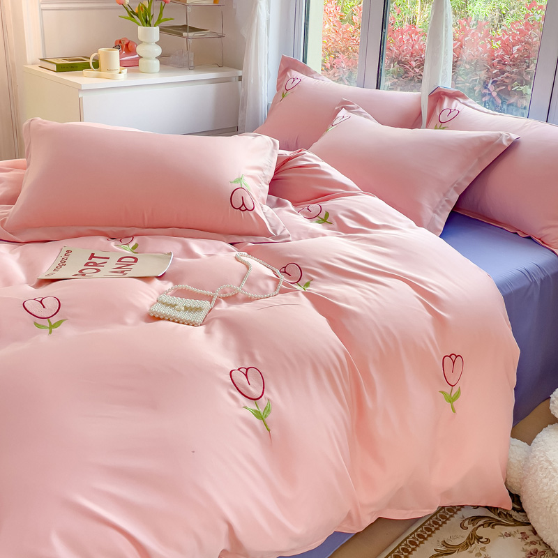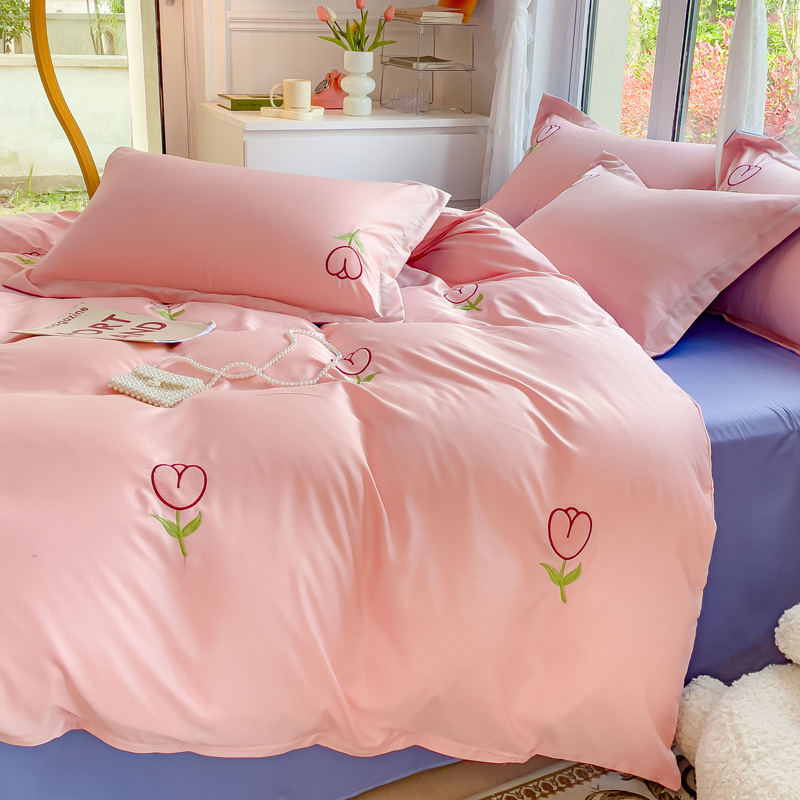 金丝鸟 2023新款水洗真丝贴布绣花四件套 郁金香-嫩粉
