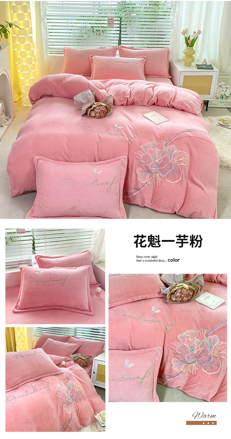 商品名称:易辰美 2023新款花魁系列保暖牛奶绒刺绣四件套 花魁一芋粉