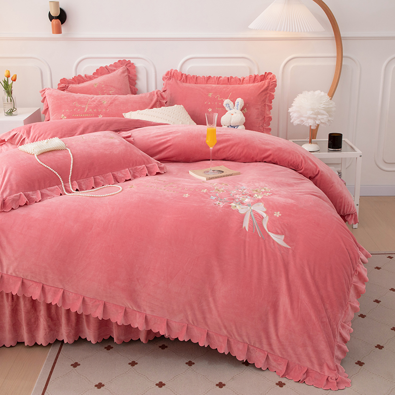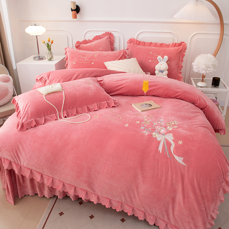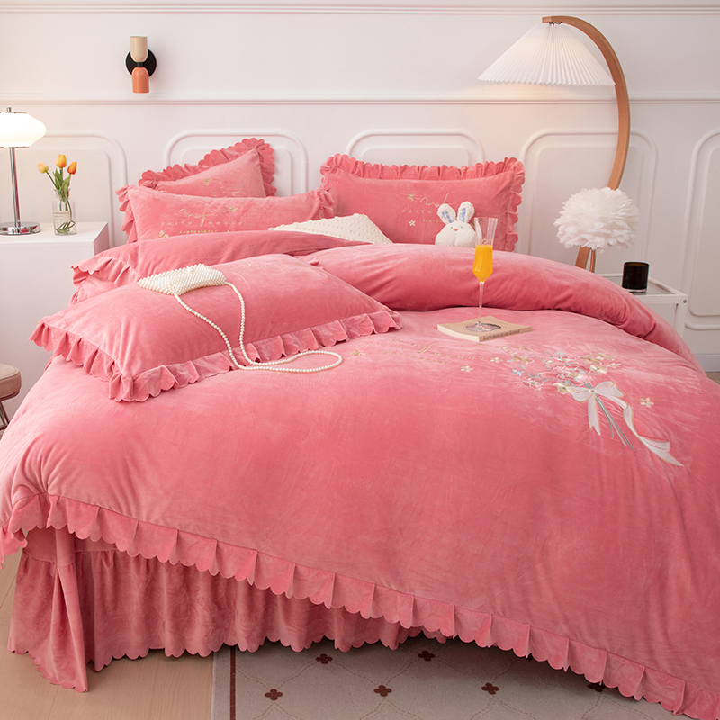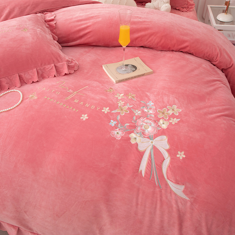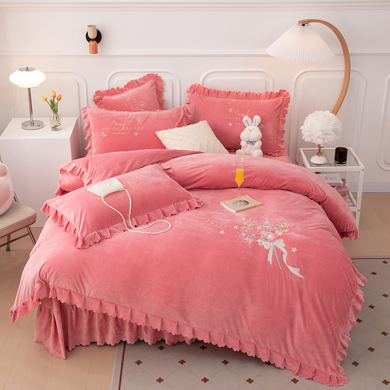 床品套件 > 优姿家纺 2024新品8.5斤德芙绒韩版床裙绣花保暖四件套 今生有约少女粉
