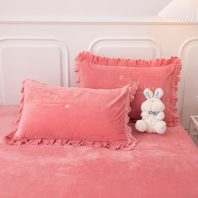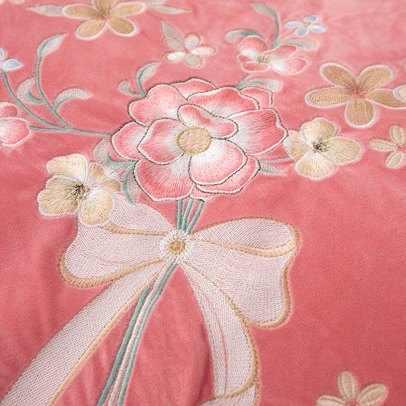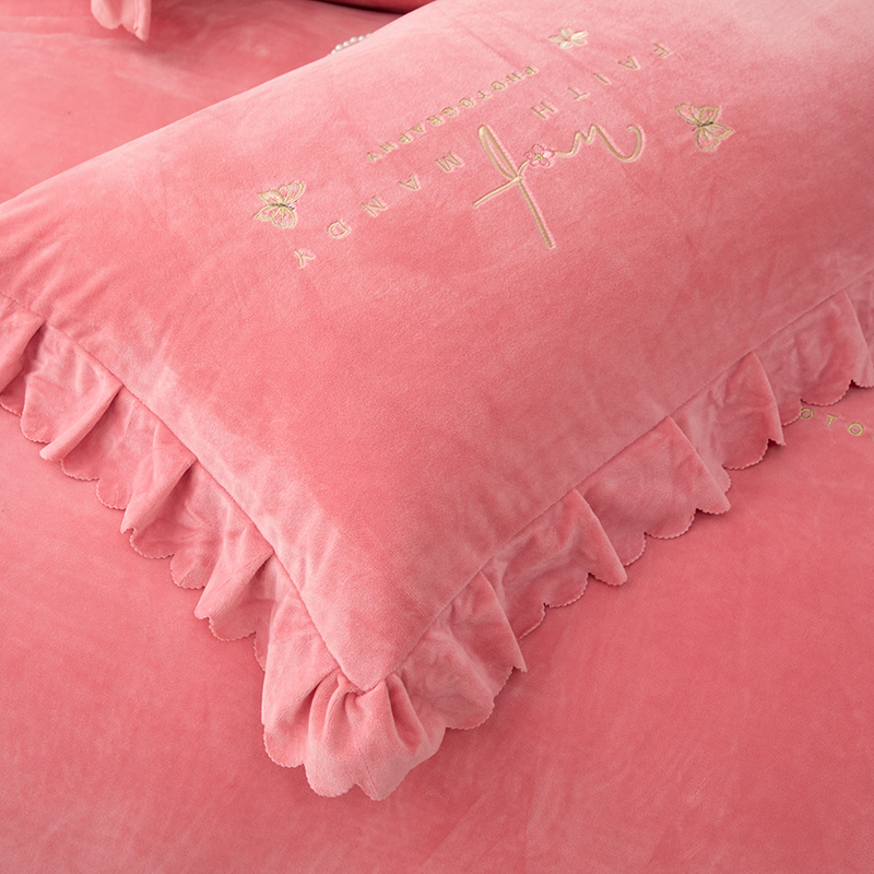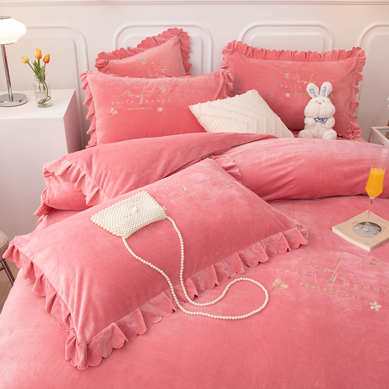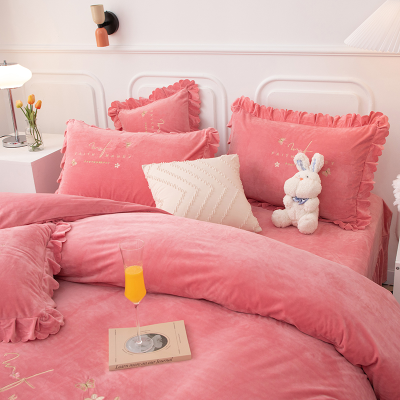 床品套件 > 优姿家纺 2024新品8.5斤德芙绒韩版床裙绣花保暖四件套 今生有约少女粉