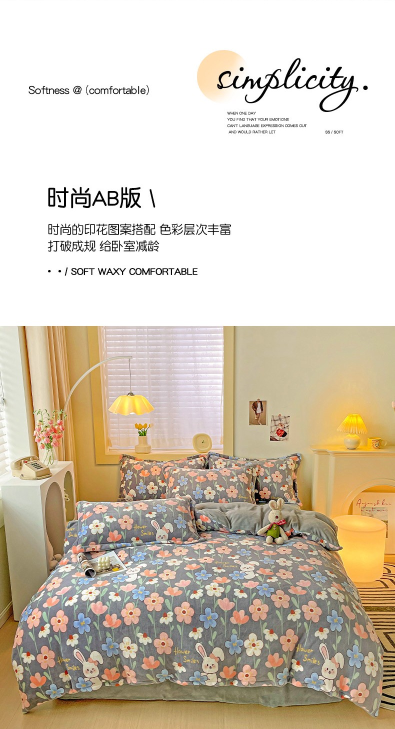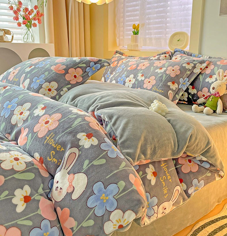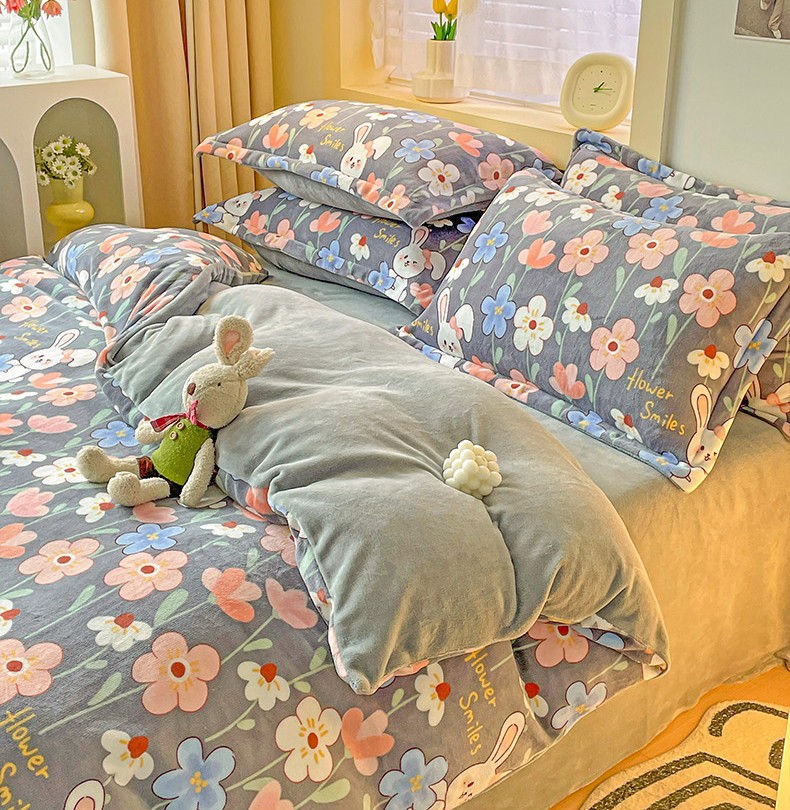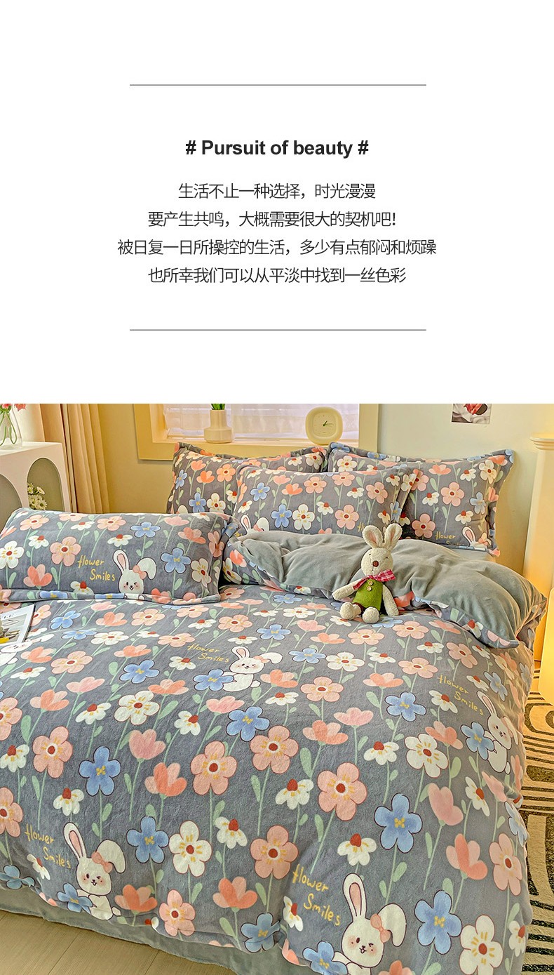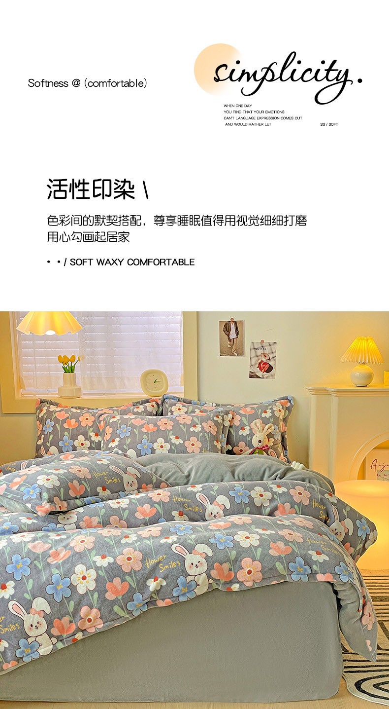 当前位置: 91家纺网 > 商品网购 > 床品套件 > 四件套 > 牛奶绒四件套 > 畅畅家纺 2023新款活性印花小清新AB版加厚高克重法莱绒牛奶绒四件套 萌动