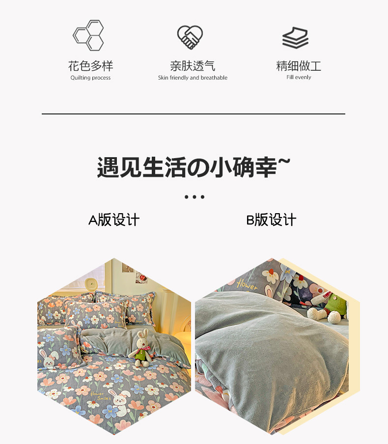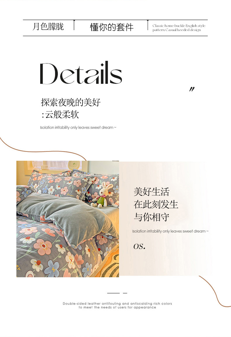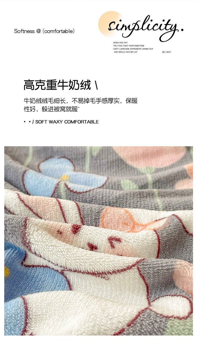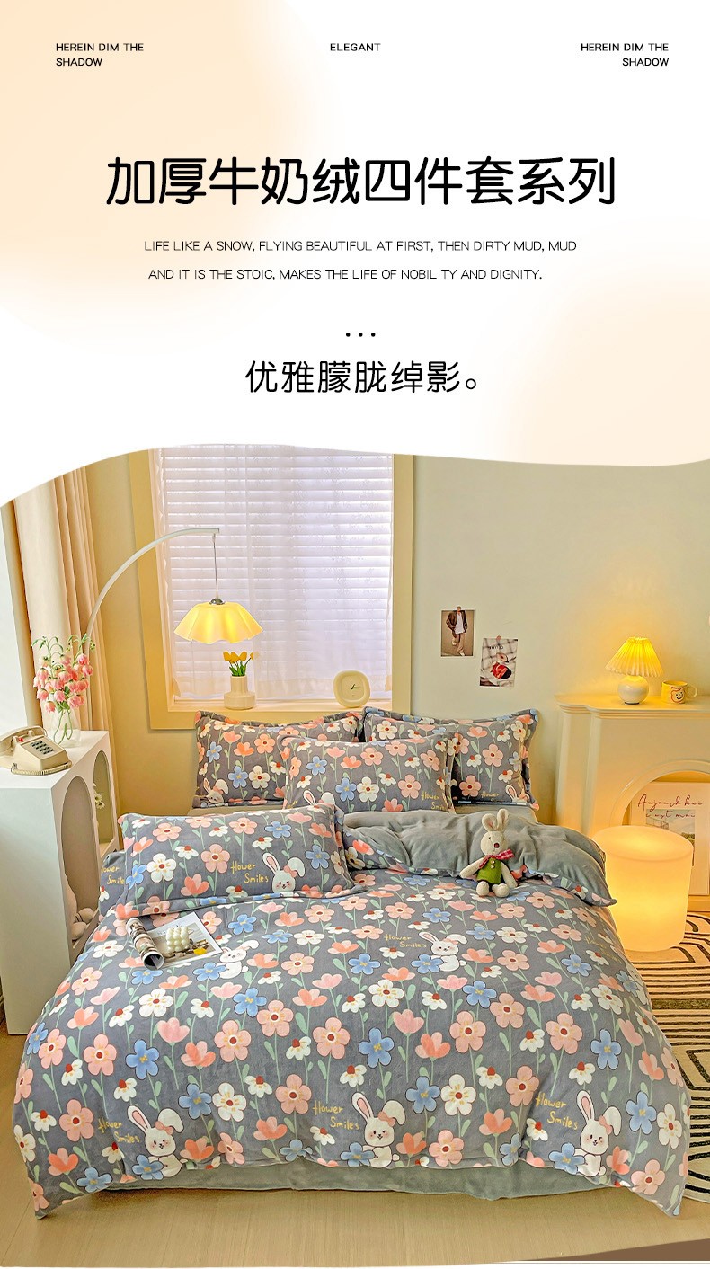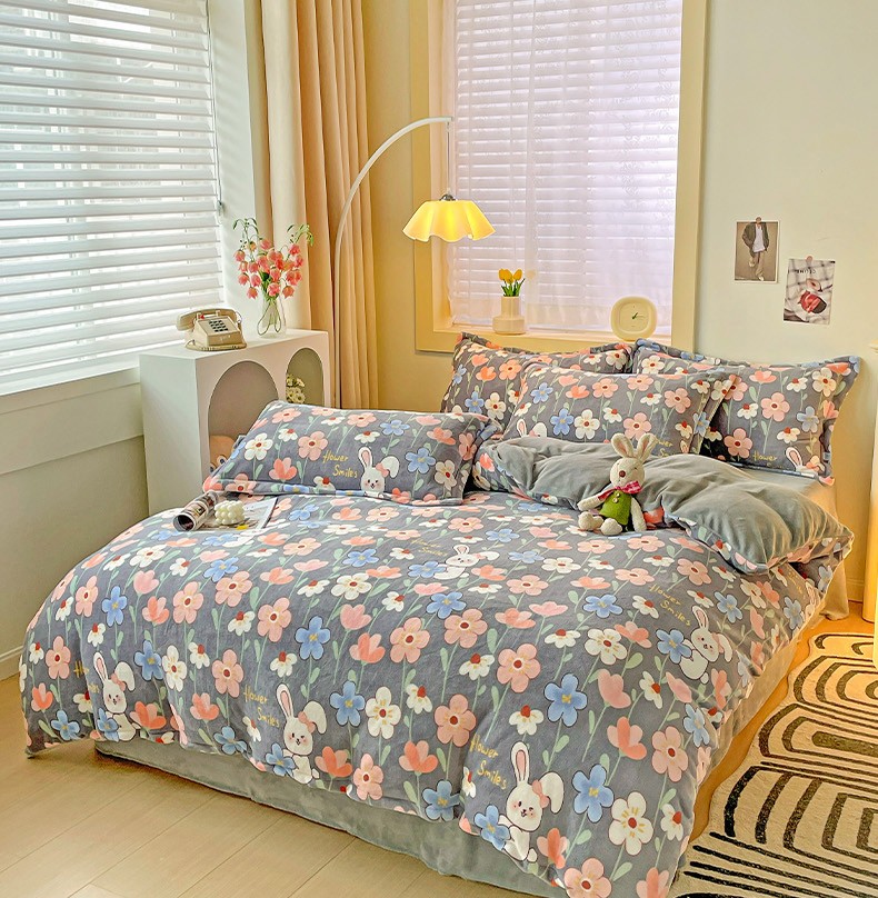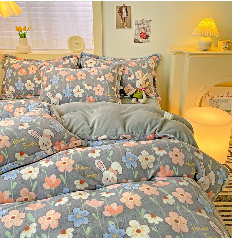 当前位置: 91家纺网 > 商品网购 > 床品套件 > 四件套 > 牛奶绒四件套 > 畅畅家纺 2023新款活性印花小清新AB版加厚高克重法莱绒牛奶绒四件套 萌动