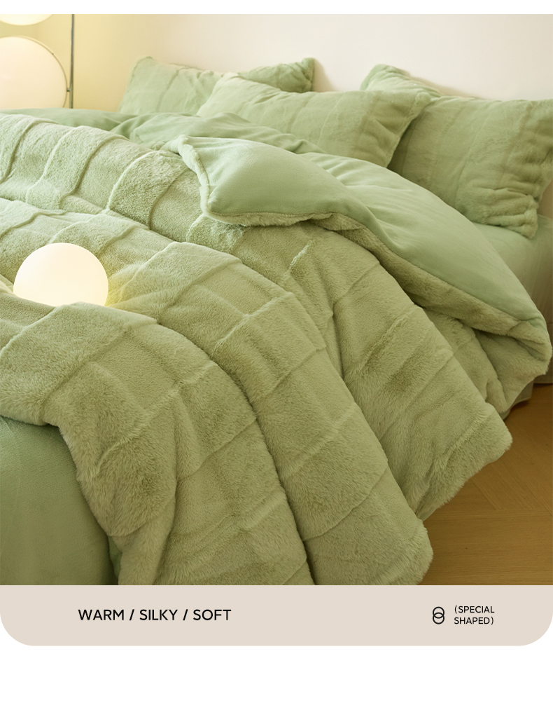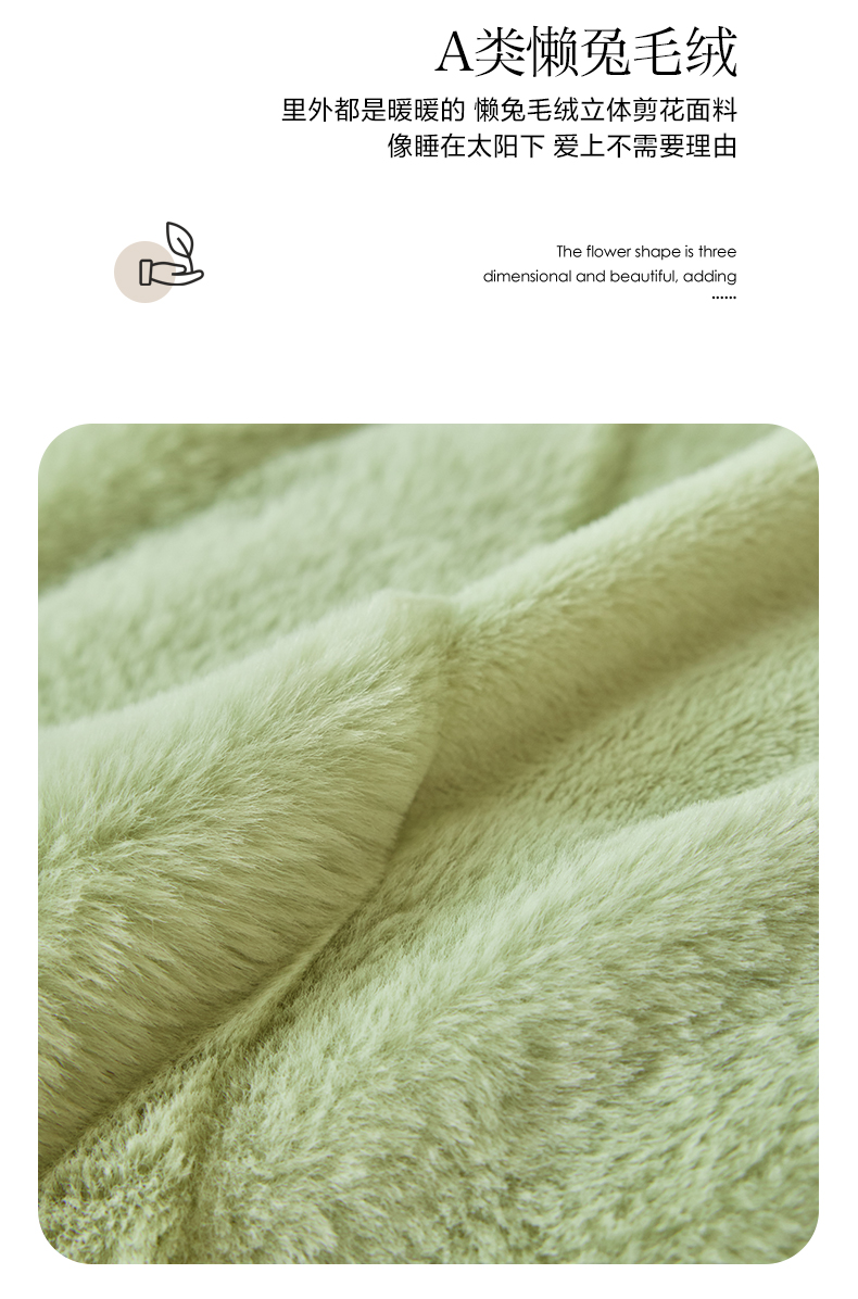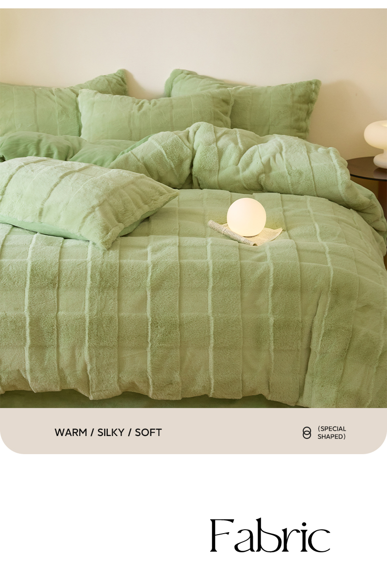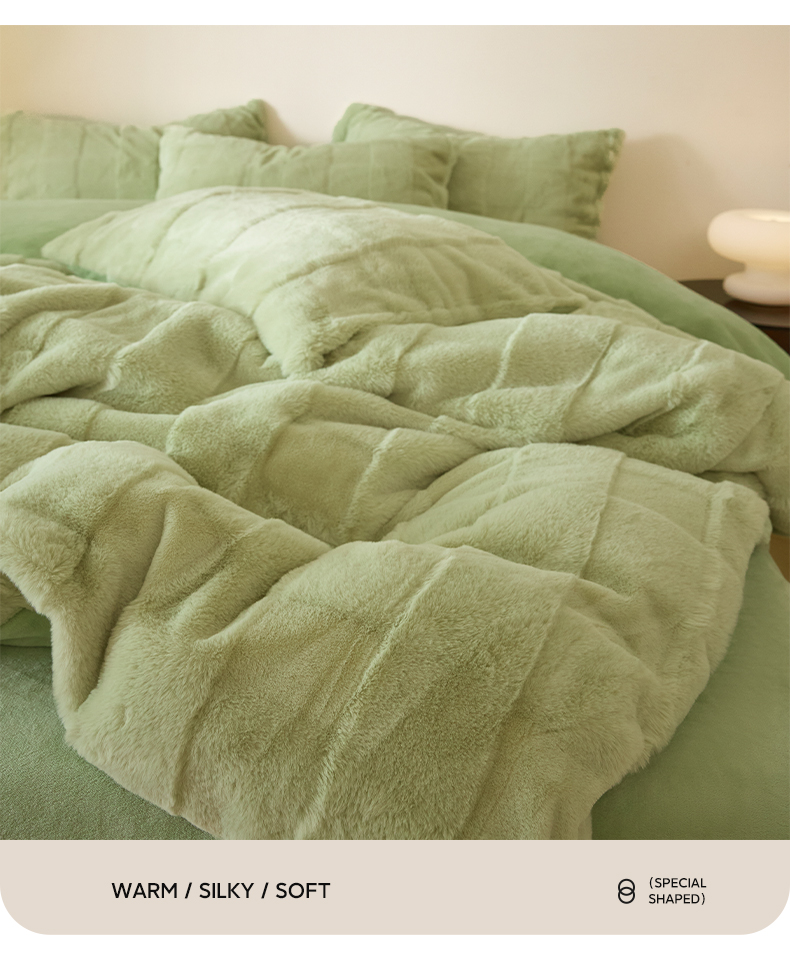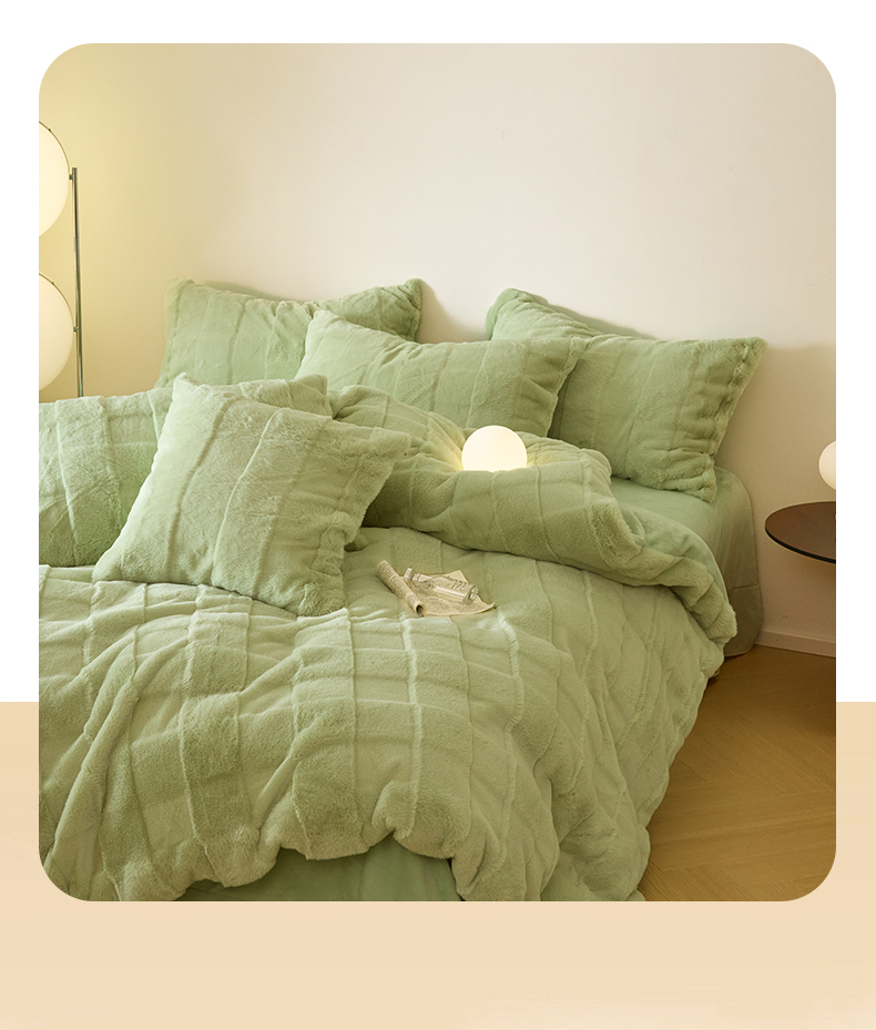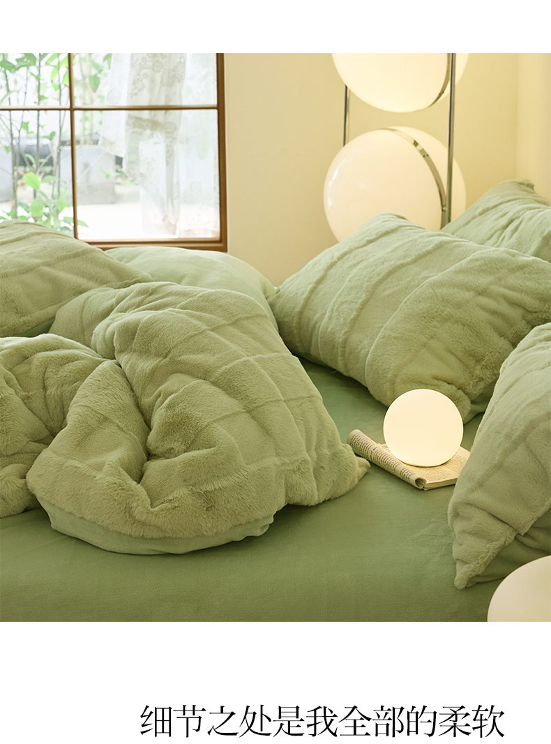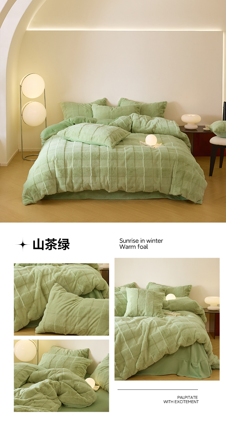 商品名称:民新 2024热款9斤獭兔毛绒兔兔绒剪花牛奶绒四件套-奢柔系列 山茶绿