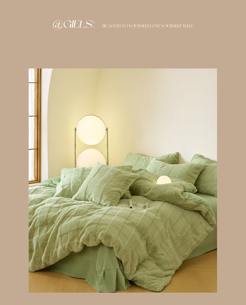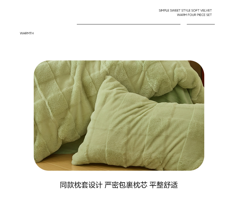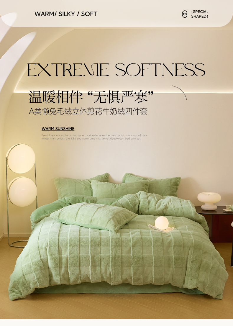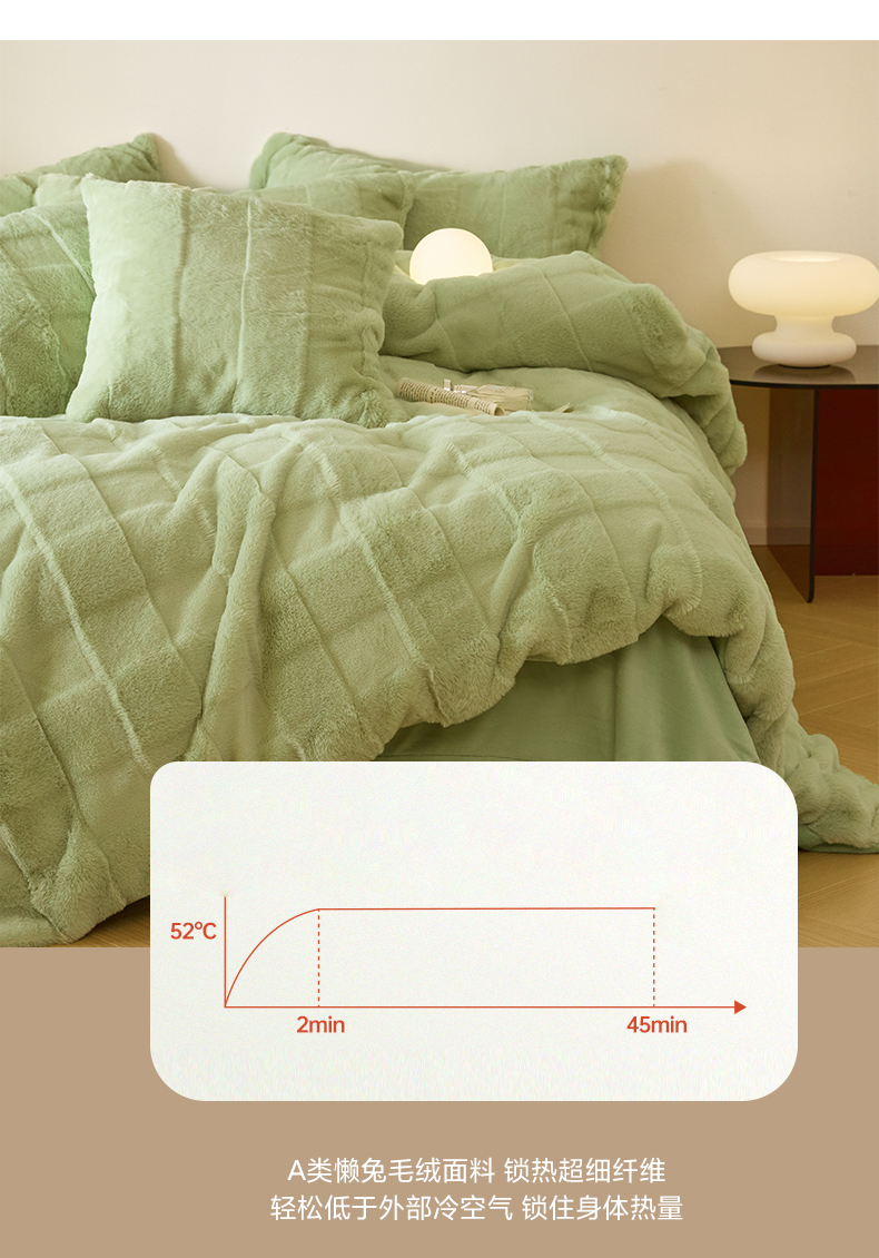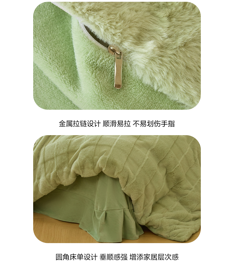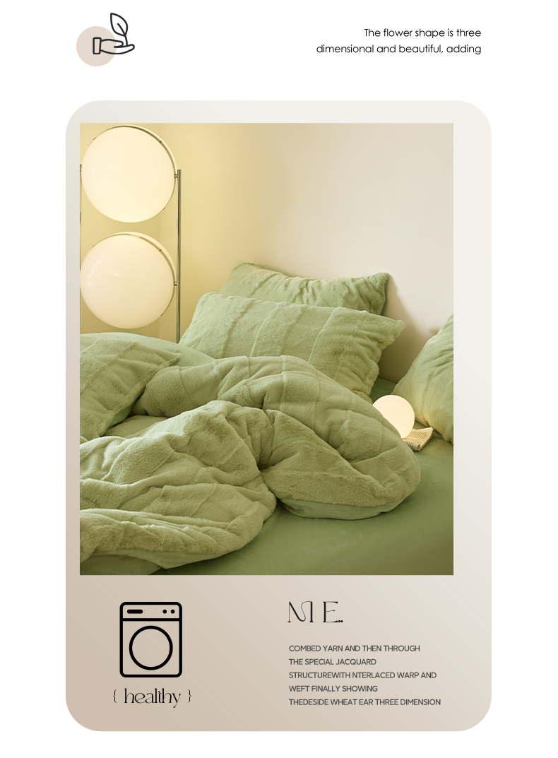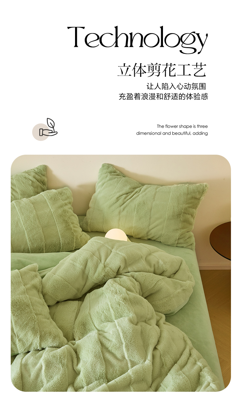 商品名称:民新 2024热款9斤獭兔毛绒兔兔绒剪花牛奶绒四件套-奢柔系列 山茶绿