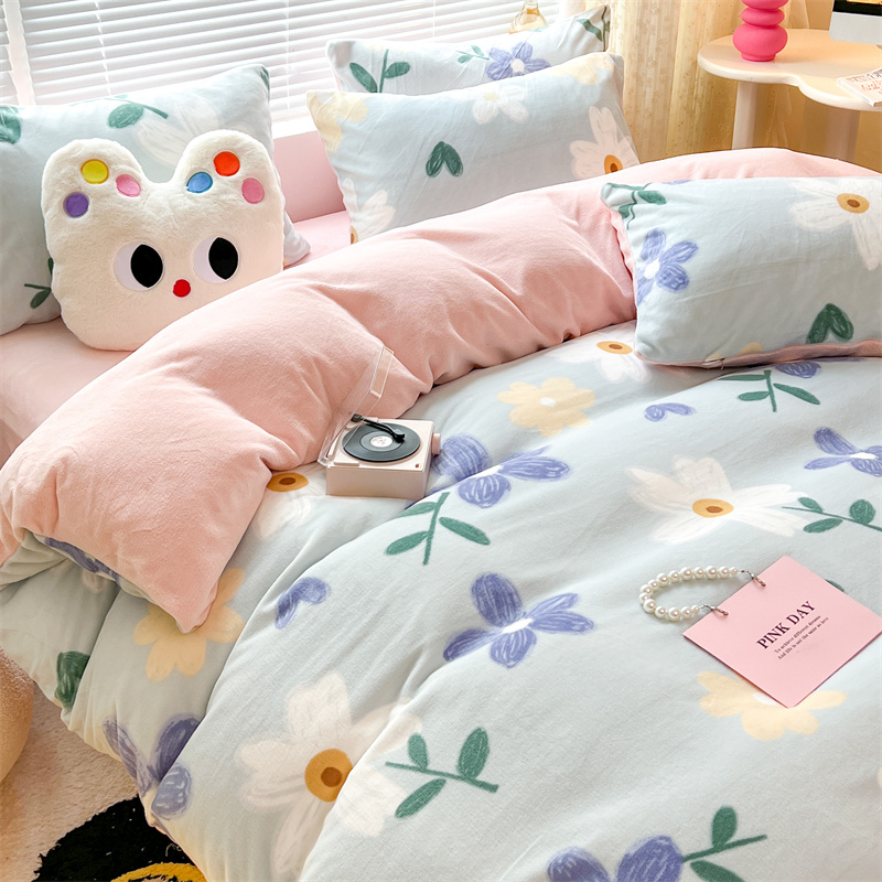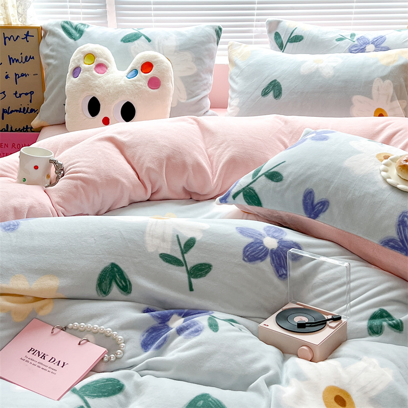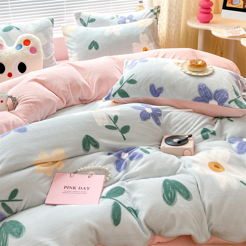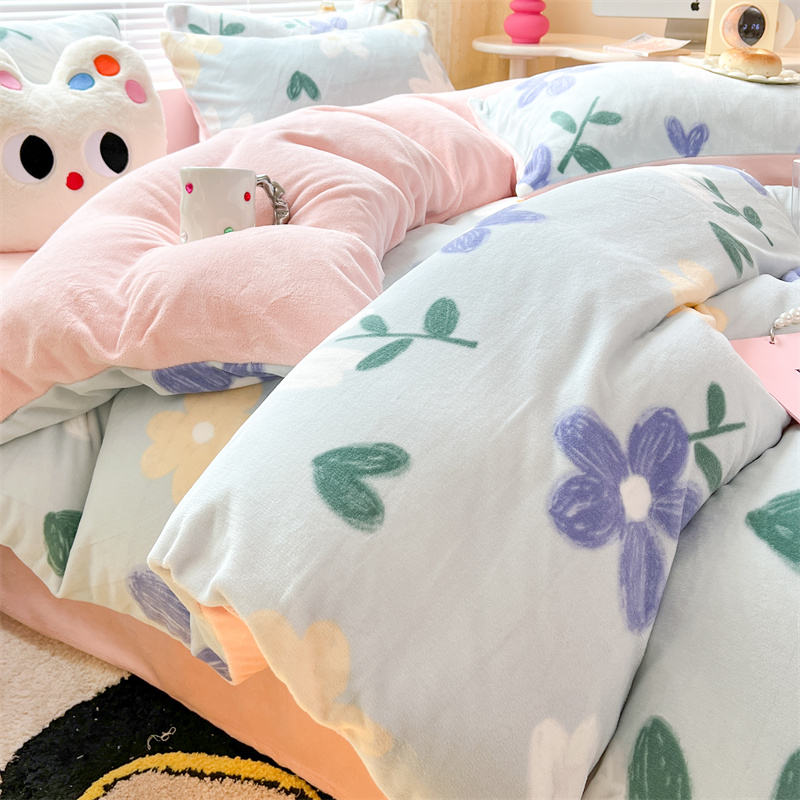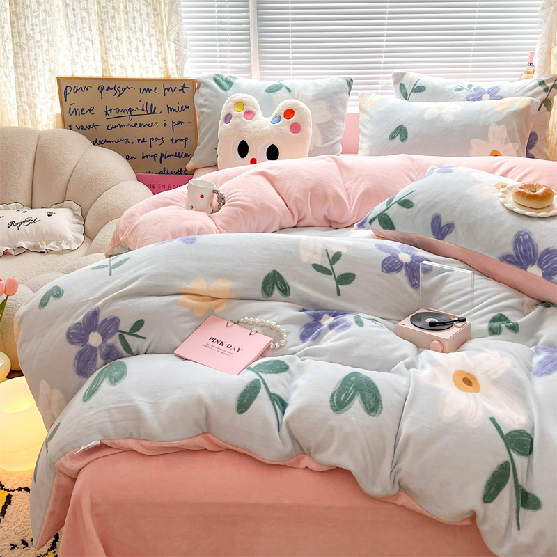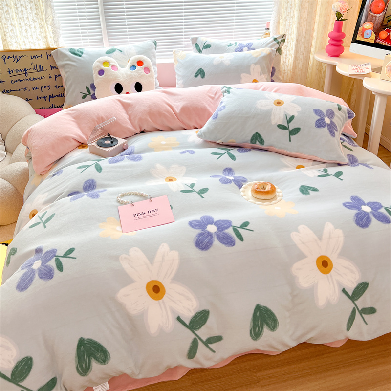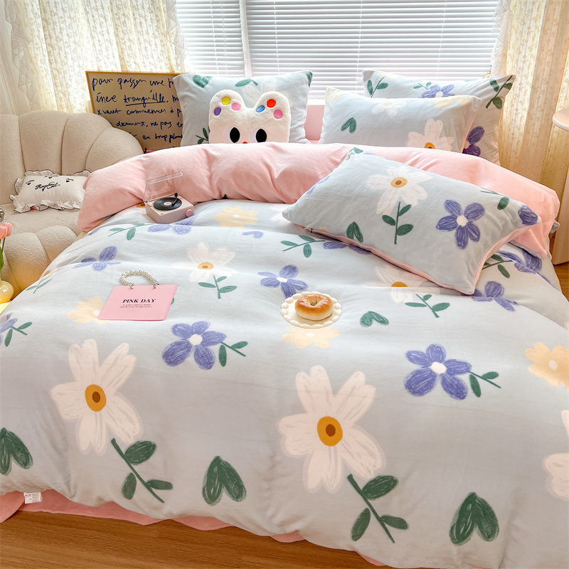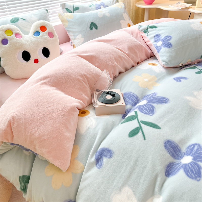 顾里家纺 新款ins少女保暖牛奶绒四件套第二批 蓝底花朵